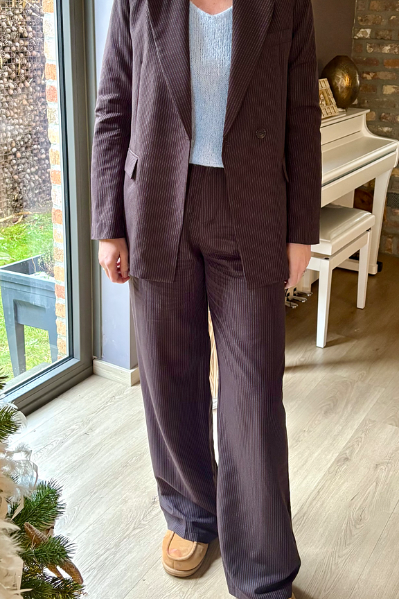 Dieser gestreifte braune Blazer ist ideal mit einem Rollkragenpullover und einer Jeans für einen schicken und lässigen Look. Perfekt, um stilvoll durch den Winter zu kommen. • Gestreifter Blazer • Gerade Passform • Lange Ärmel • Knopfverschluss • Leistentaschen
