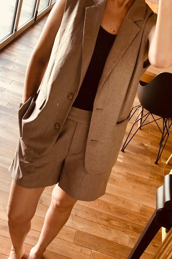 Kombinieren Sie diesen beigen Blazer mit einer weiรen Palazzohose fรผr einen schicken Sommerlook. - รrmelloser Blazer - Ein-Knopf-Verschluss - Aufgesetzte Taschen auf der Vorderseite