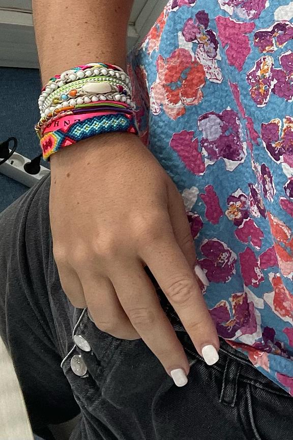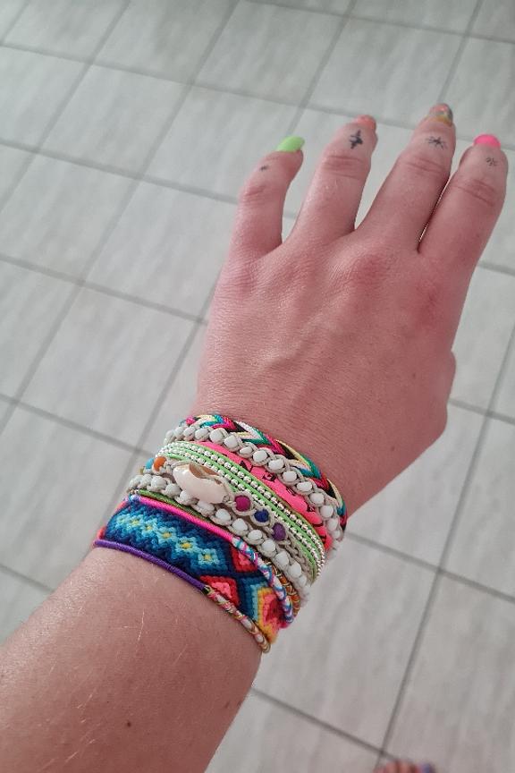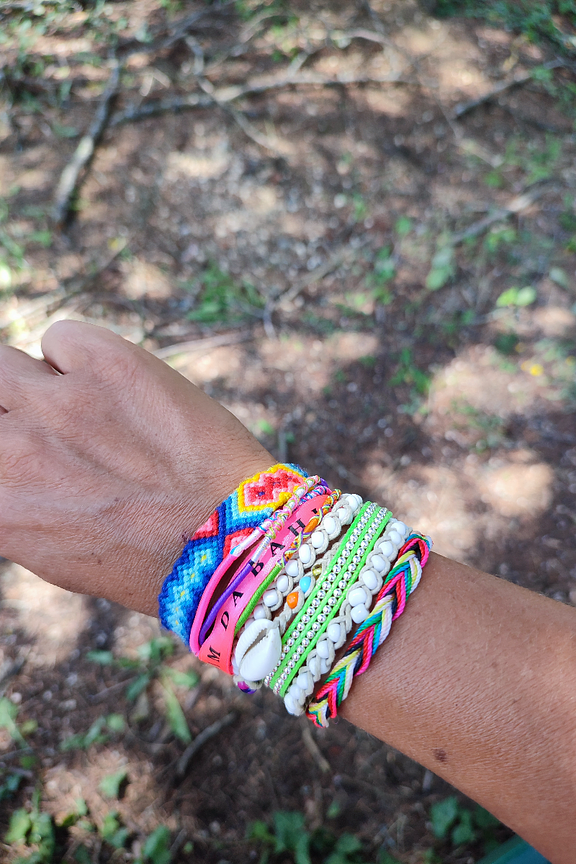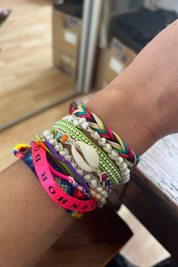 Mehrgliedrige Manschette bestehend aus mehrfarbigen Baumwollbรคndern, einem in Regenbogentรถnen geflochtenen brasilianischen Armband, einer Kaurimuschel und dem legendรคren Glรผcksband von Sehnor da Bonfim. โข Goldener Magnetverschluss โข Vollstรคndig handgefertigt โข Nicht mit Wasser in Berรผhrung kommen โข Garantiert nickelfrei und allergiefrei Grรถรe: โข Manschettenhรถhe: 2,5 cm +/- 0,5 mm โข Armbandgrรถรe: 17 cm (+/- 5 mm)