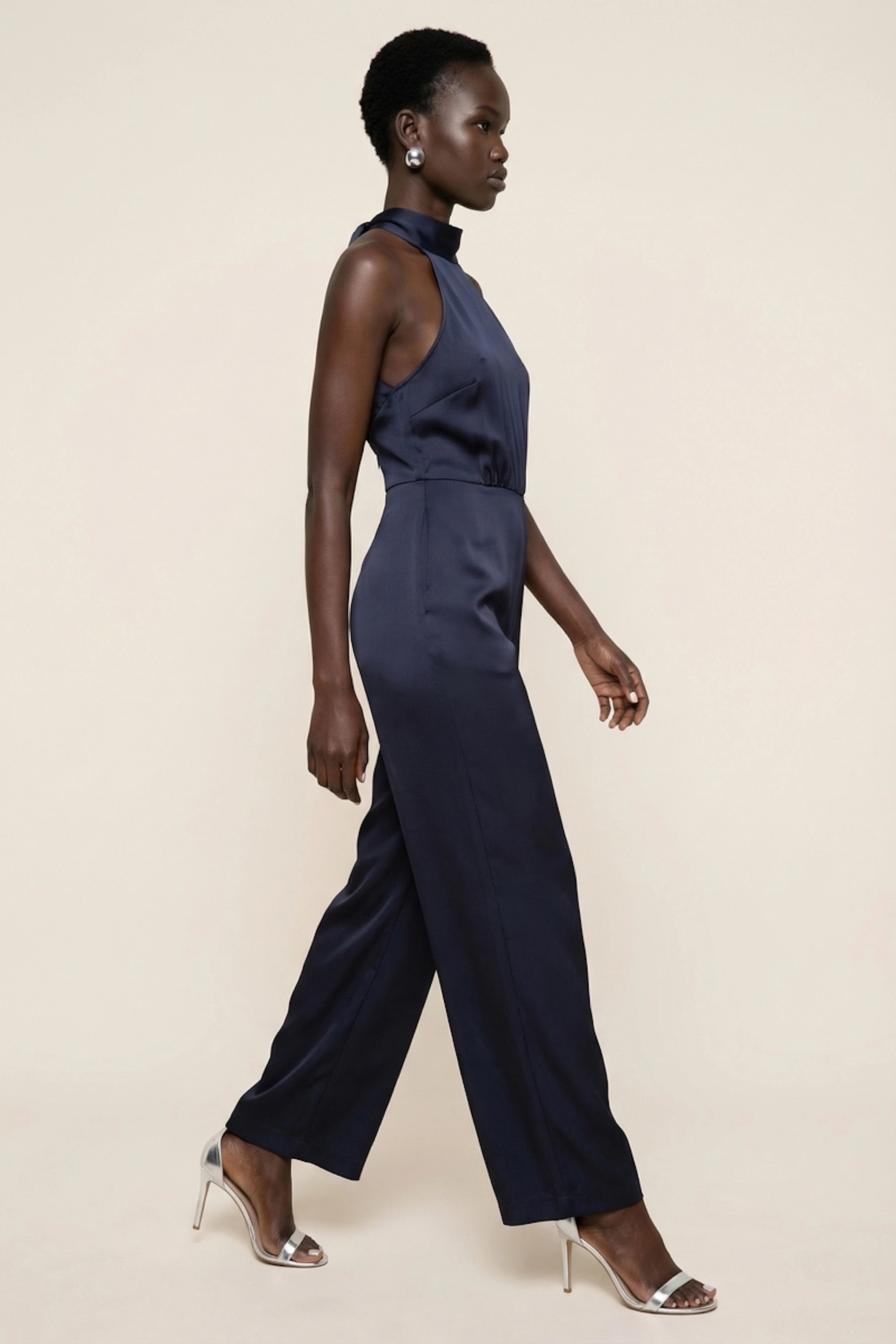 Machen Sie einen schicken Look, indem Sie diesen Jumpsuit mit Pumps und goldenen Ohrringen kombinieren. Perfekt für den Winter. - Marineblauer Jumpsuit aus Satin - Träger zum Binden im Rücken - Gerade Beine - Eng anliegende Passform - Geschlitzte Seitentaschen - Reißverschluss an der Seite - Die Länge der Innennaht beträgt 76,2 cm bei Größe S Hauptmaterial: Elastische Mischung aus recyceltem Polyester. Dieses Produkt ist GRS-zertifiziert. Jeder Schritt in der Lieferkette hat strenge soziale, ökologische und chemische Anforderungen erfüllt.