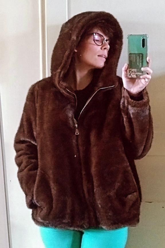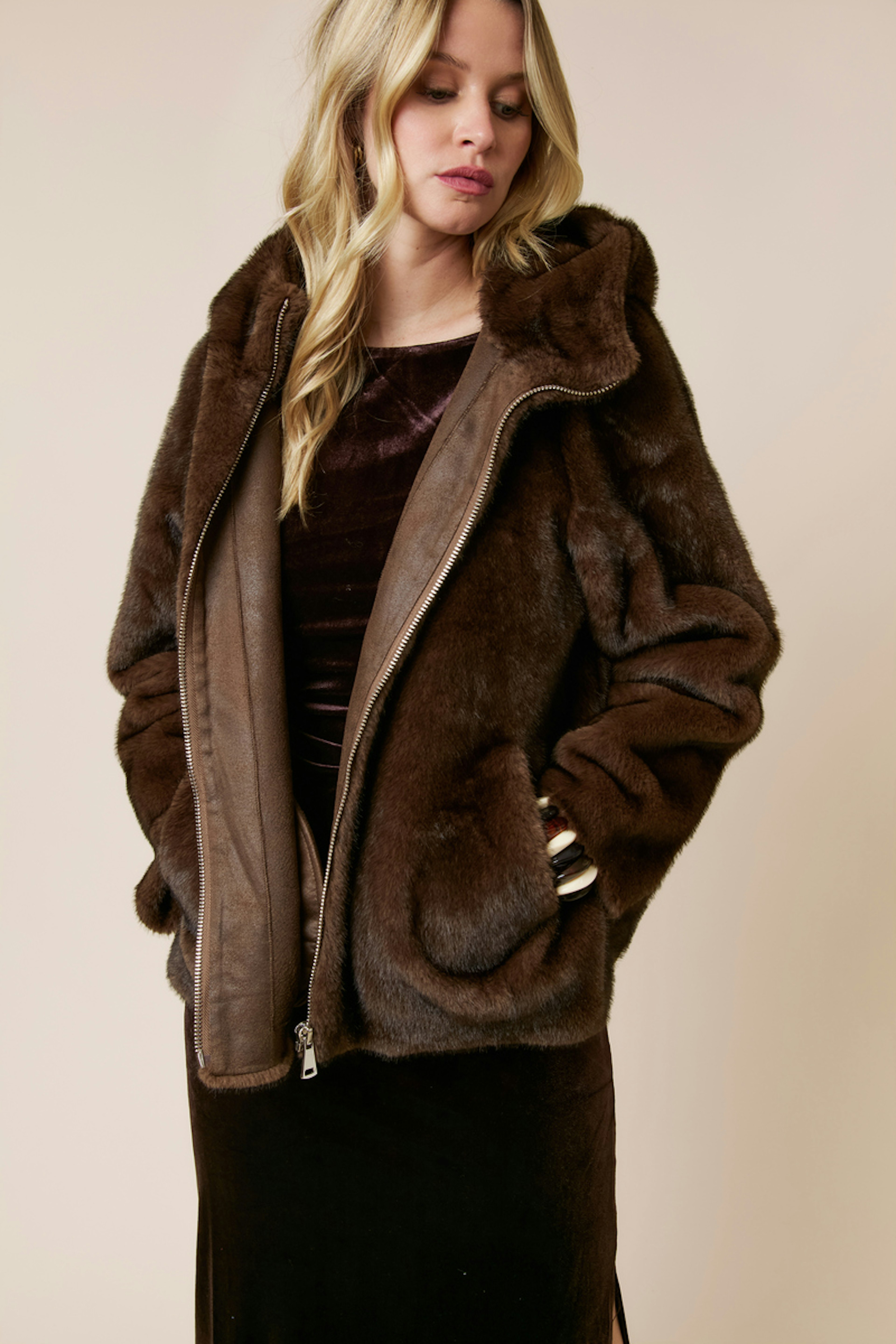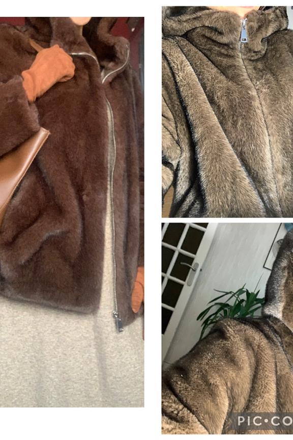 Für einen schicken und gemütlichen Look kombiniere diese Jacke mit Skinny Jeans und Stiefeletten aus Leder. Ideal für den Winter! • Gemütliche Jacke aus Kunstfell • Weite und bequeme Passform • Integrierte Kapuze für mehr Wärme • Praktischer Reißverschluss • Warme braune Farbe
