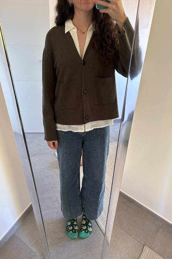 Trage diese khakifarbene Weste mit high-waist Jeans und Stiefeln fรผr einen schick-lรคssigen Look. Ergรคnze den Look mit goldfarbenem Schmuck fรผr einen Hauch von Eleganz. โข Weste mit langen รrmeln โข Gerade Passform โข V-Ausschnitt โข Knopfverschluss โข Aufgesetzte Taschen