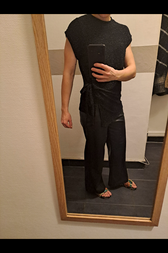 Peppere dieses schicke Oberteil mit einer schmalen Hose und Pumps für einen unvergesslichen Abend. • Schwarzes Top • Seitlich gebundener Gürtel • Kurze Ärmel • Figurbetonte Passform • Subtile Eleganz