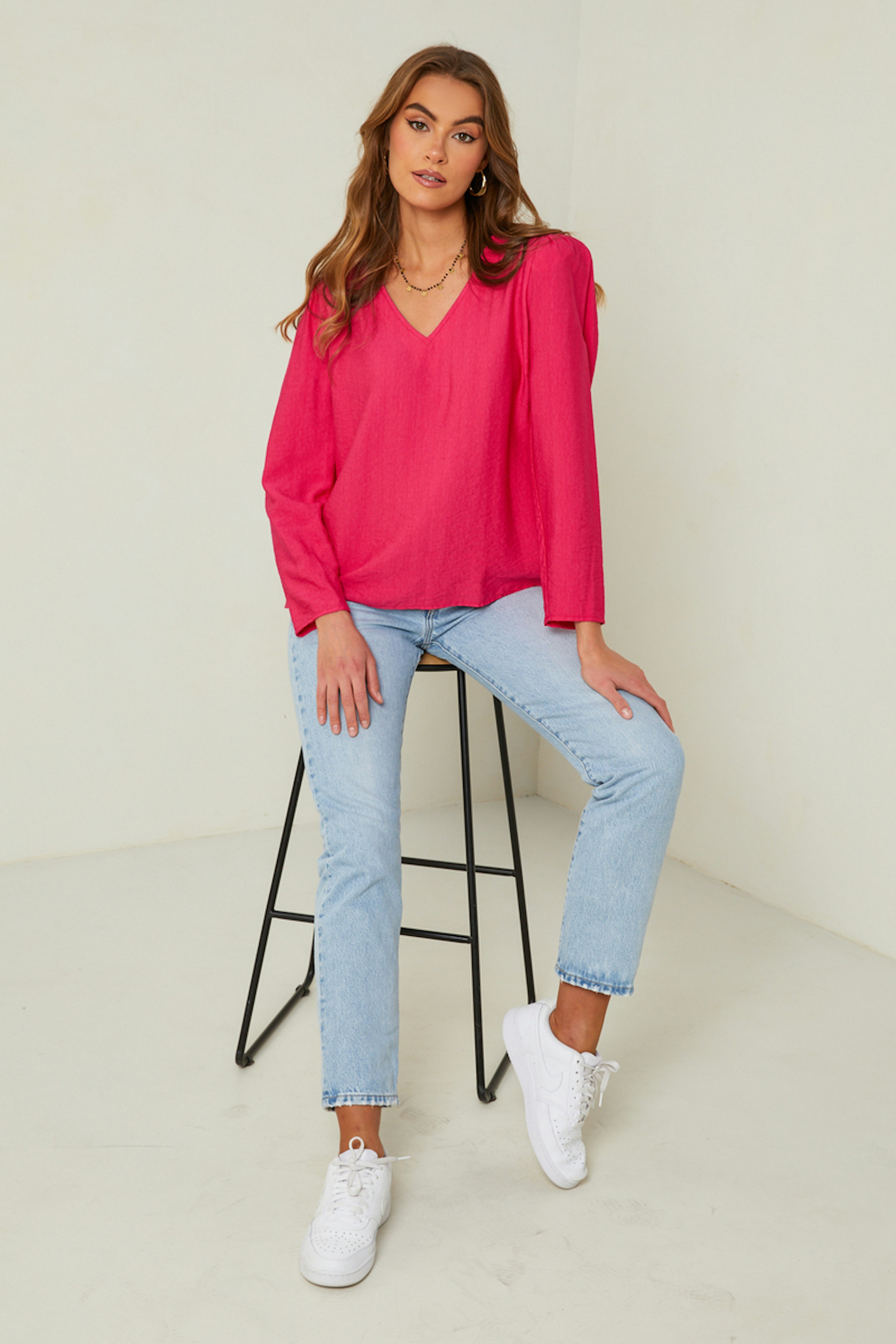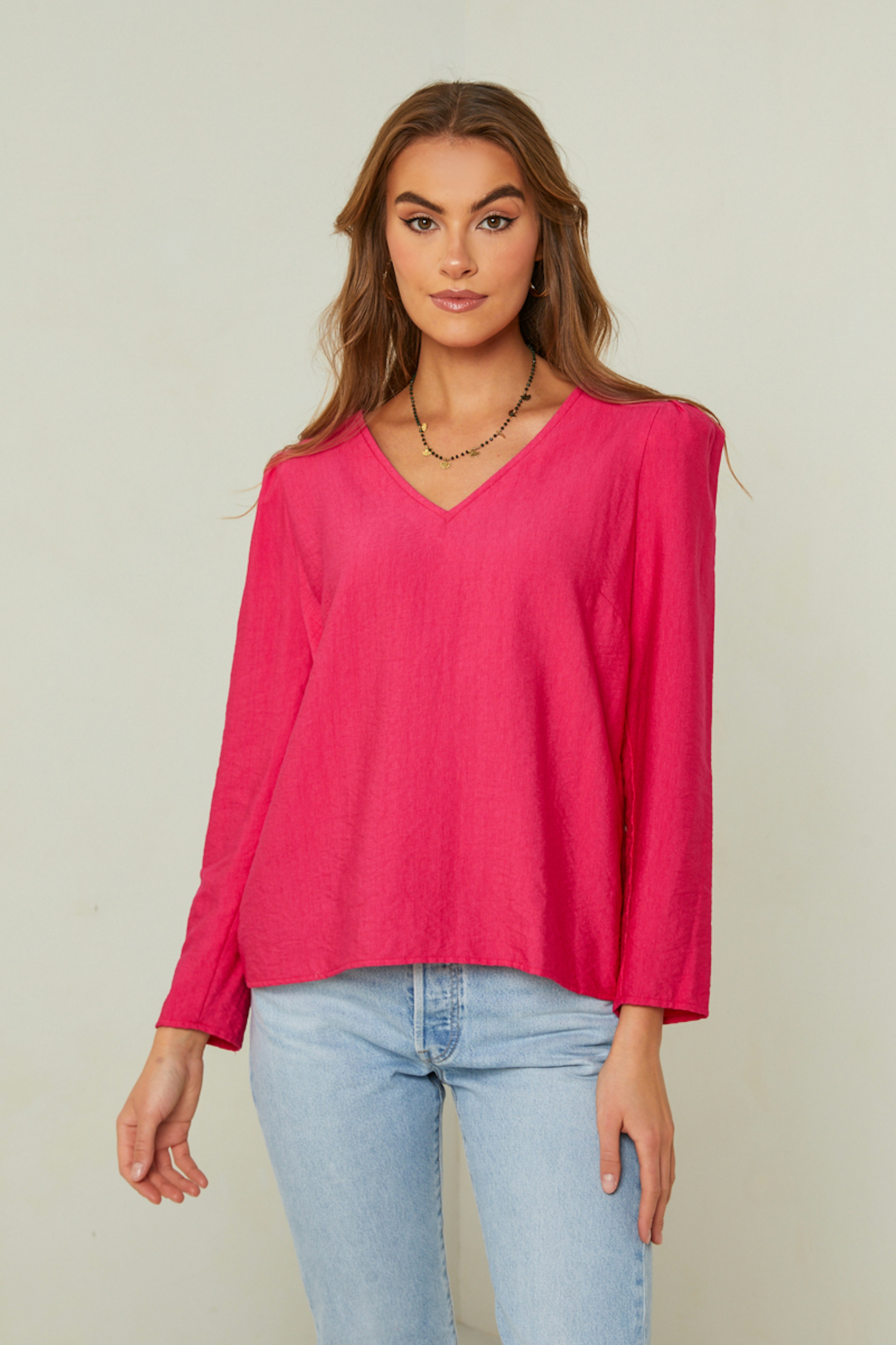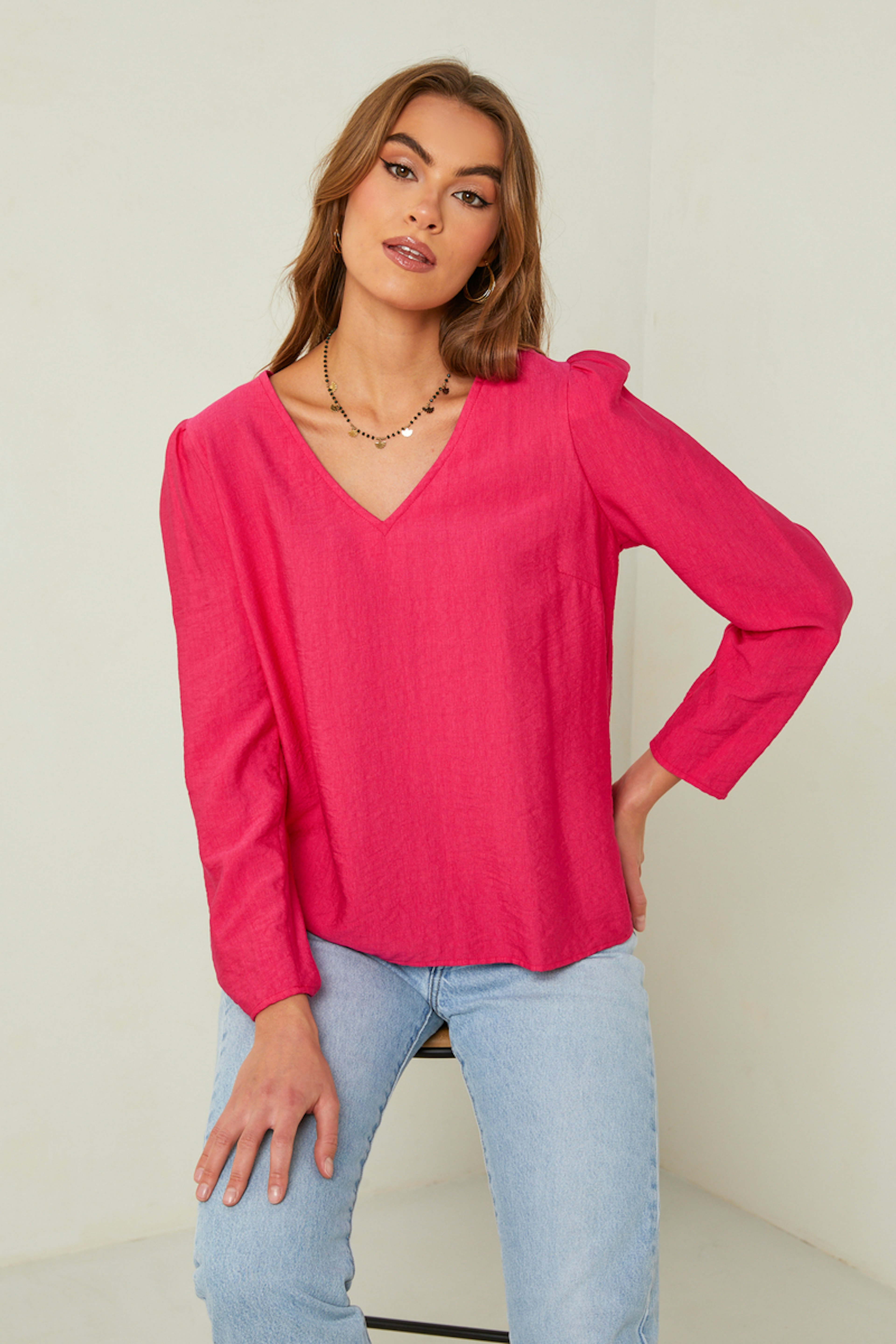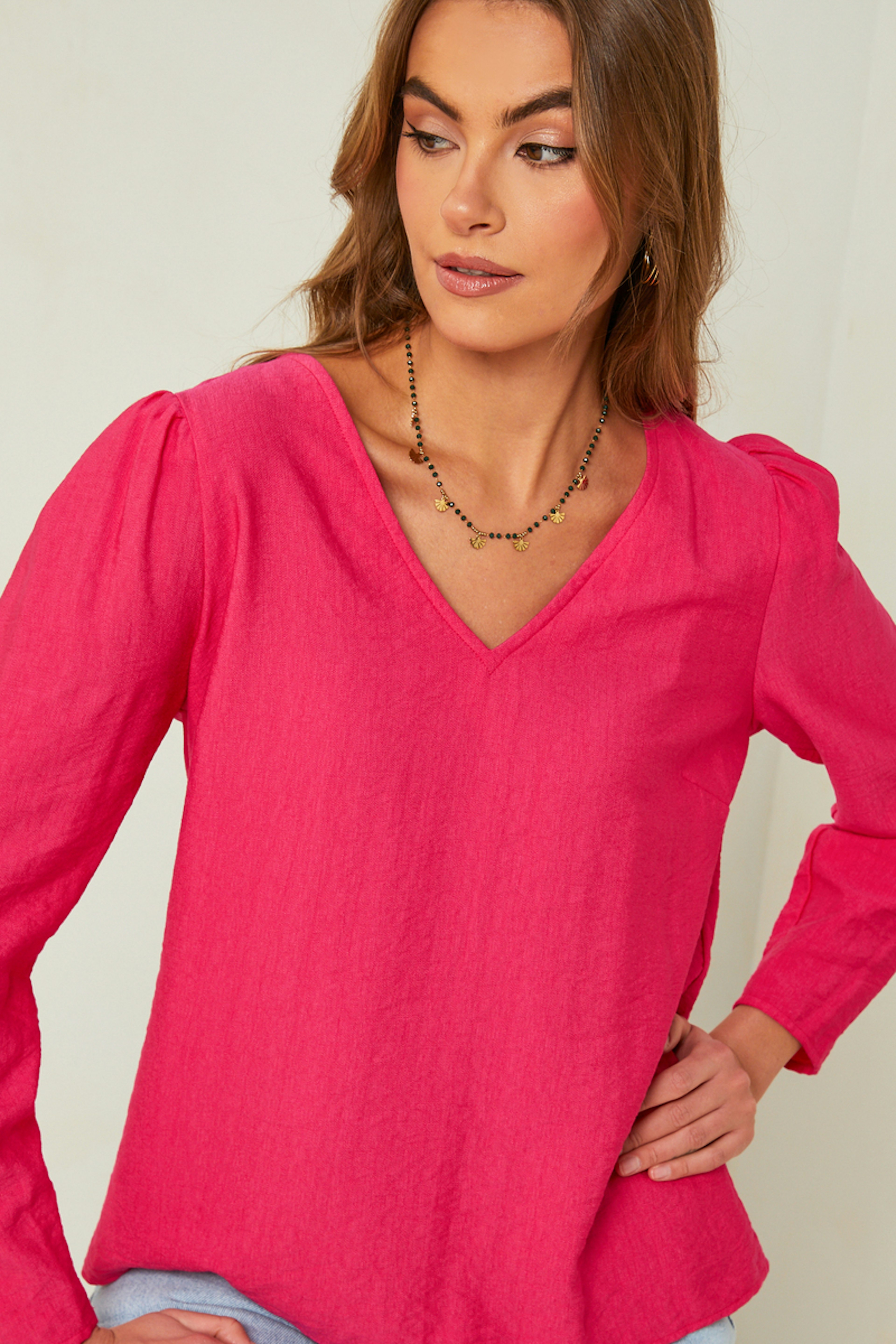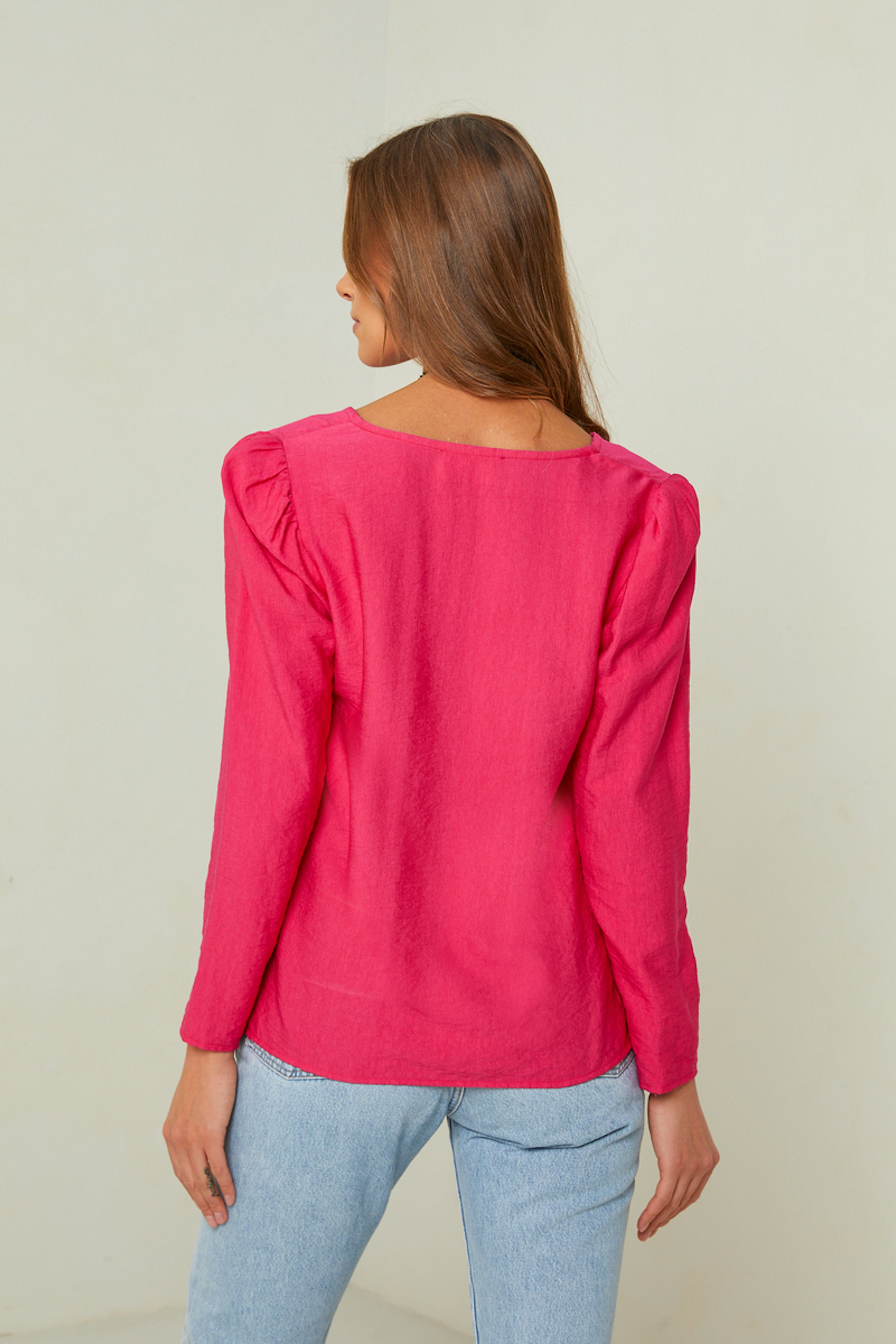 โข Pinkfarbene Bluse โข Lange รrmel โข V-Ausschnitt โข Gerfurchte Schulterpolster โข Klassischer Schnitt โข Hergestellt in Frankreich