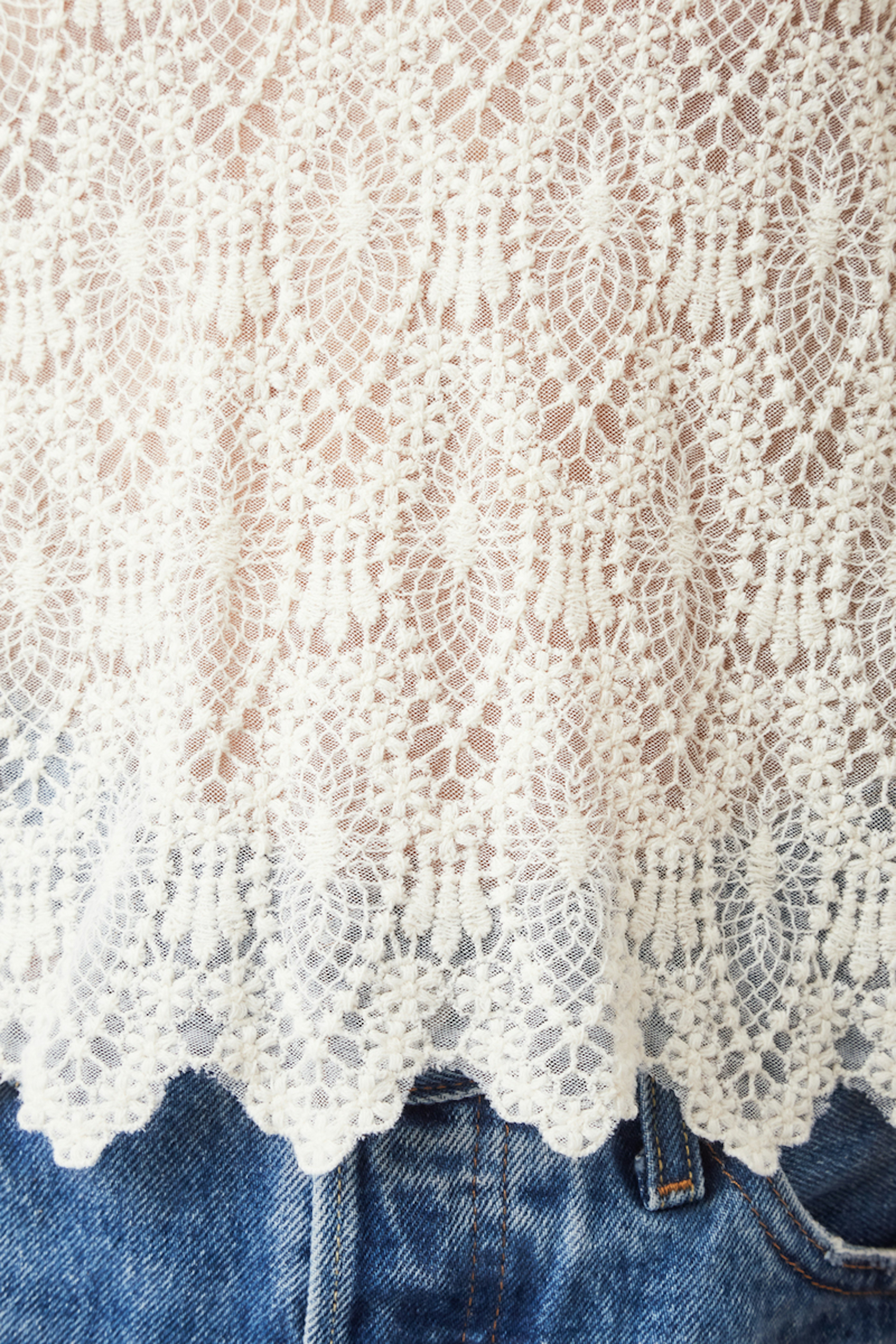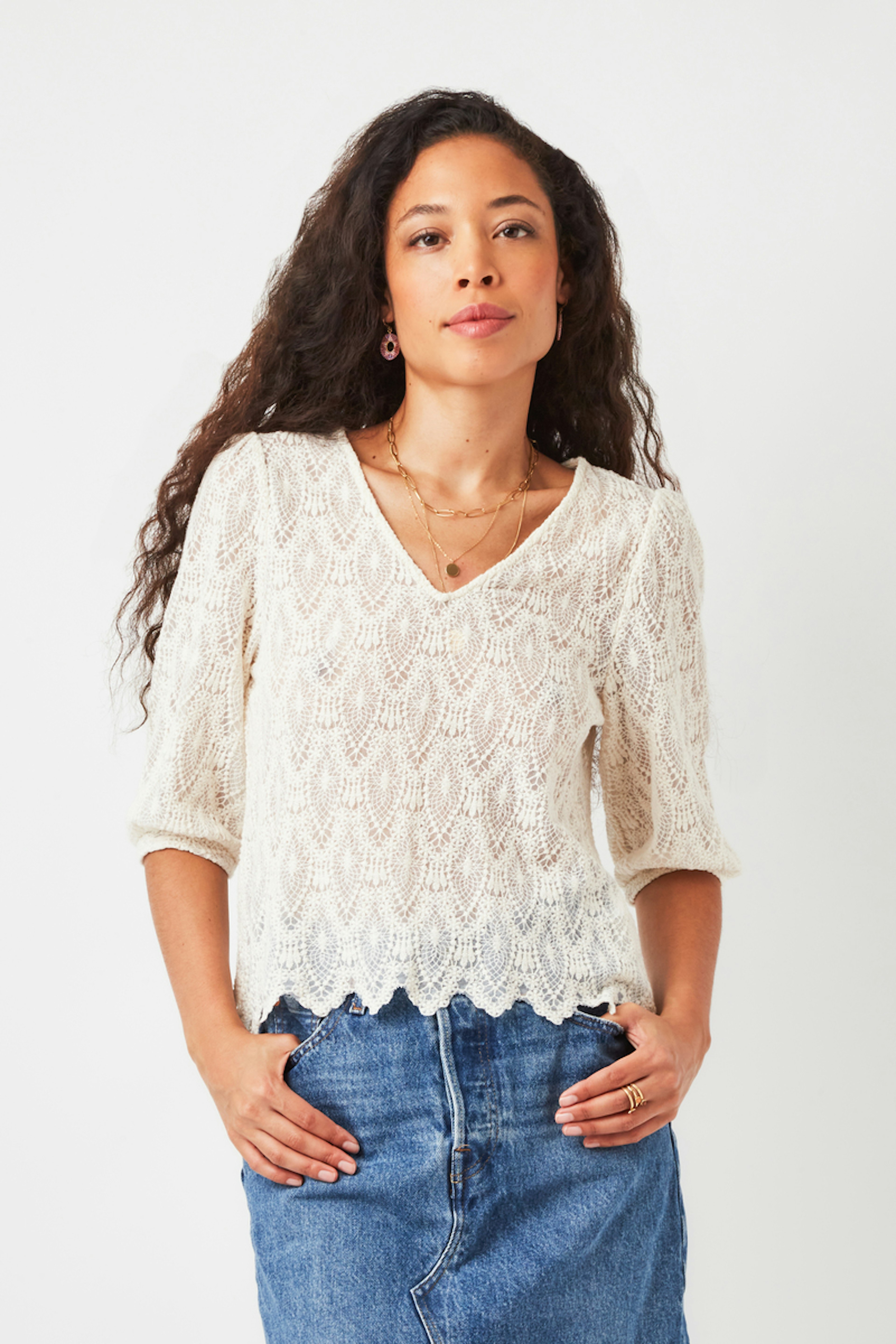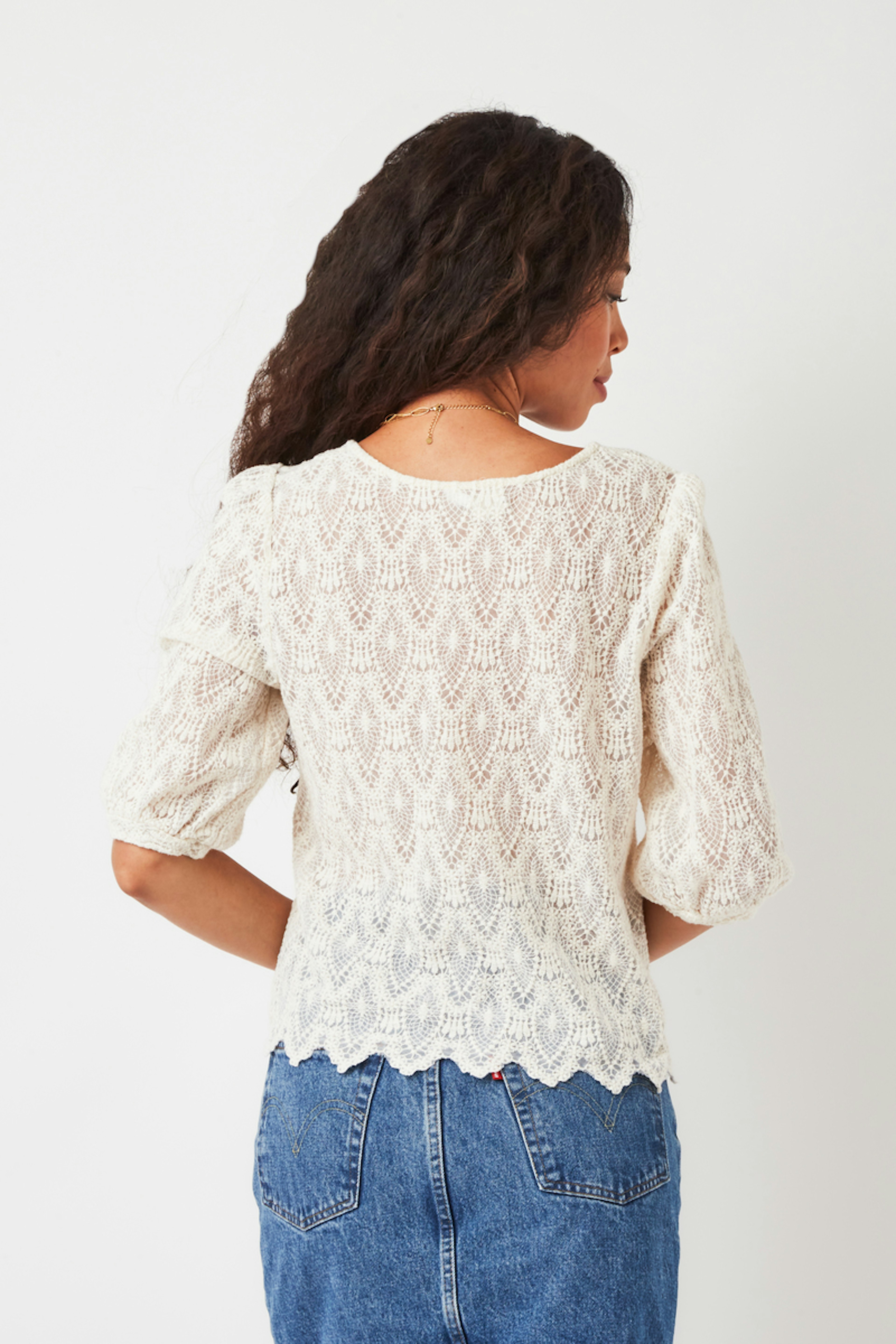 โข Weiรes, mit Spitze gefรผttertes Oberteil โข V-Ausschnitt โข รrmel 3/4 โข Unterkรถrper gewelltes Finish โข Gerader Schnitt