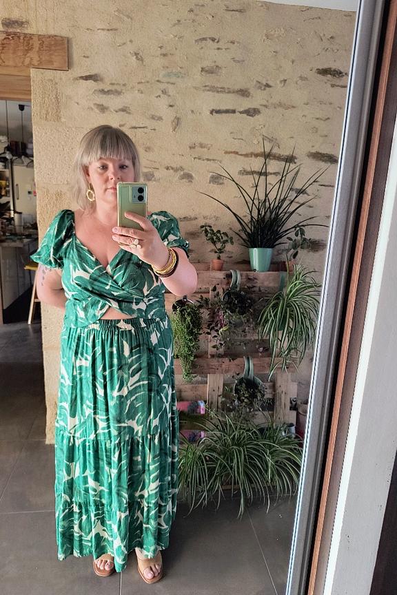 Fรผr einen schicken Sommerlook wรคhlen Sie dieses grรผn bedruckte Cropped Top mit einem flieรŸenden, hochtaillierten Rock und Sandalen mit Absรคtzen. Perfekt fรผr einen sonnigen Tag oder einen lรคssigen Sommerabend. - Cropped Top - Freier Ausschnitt - Kurze ร„rmel - Tropischer Druck