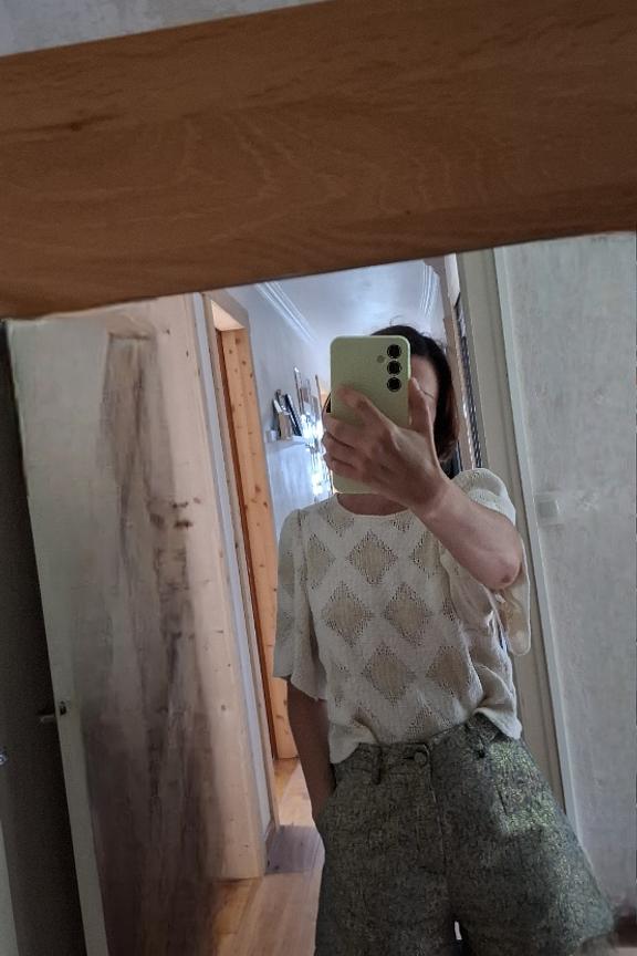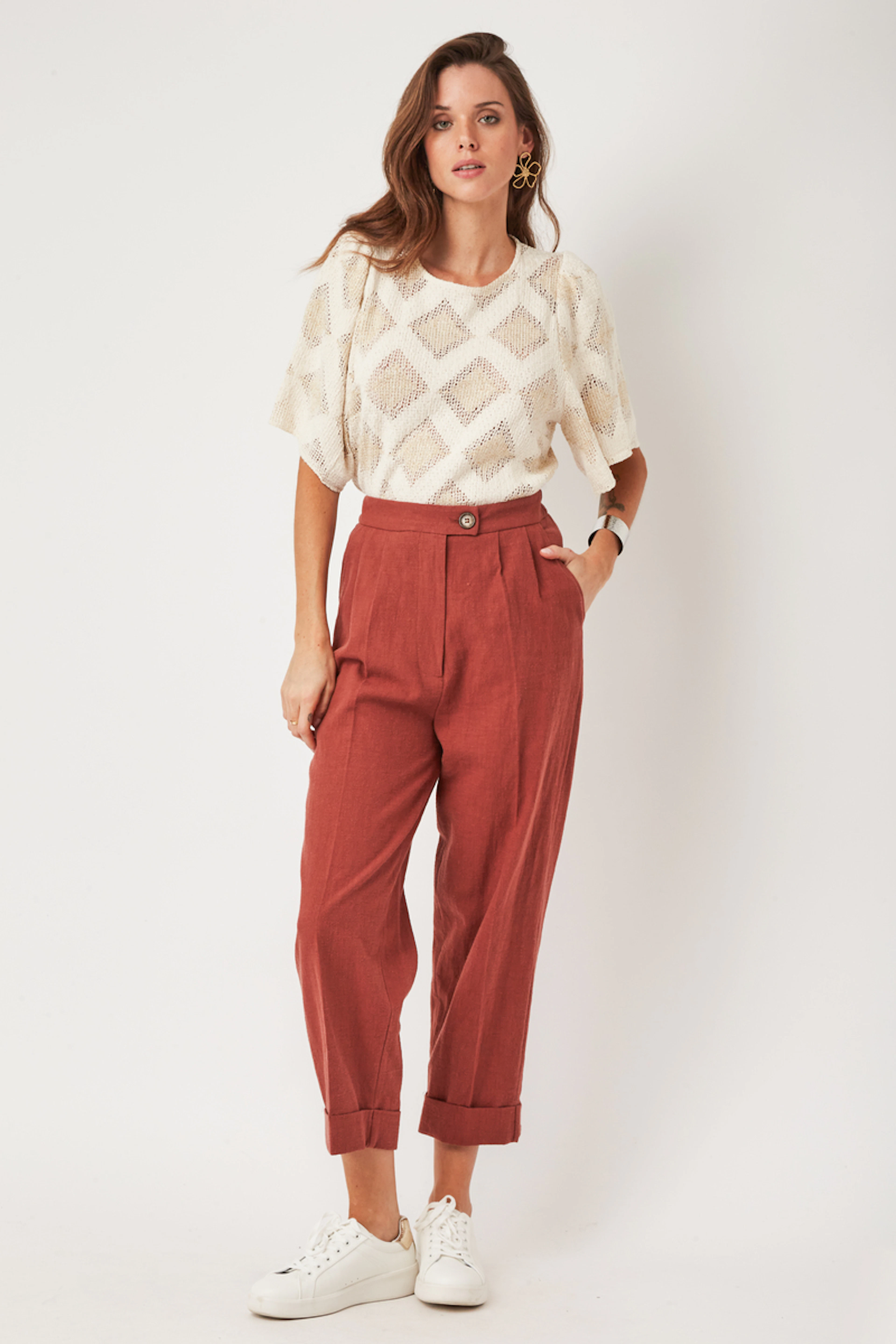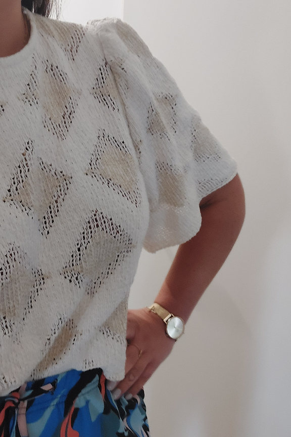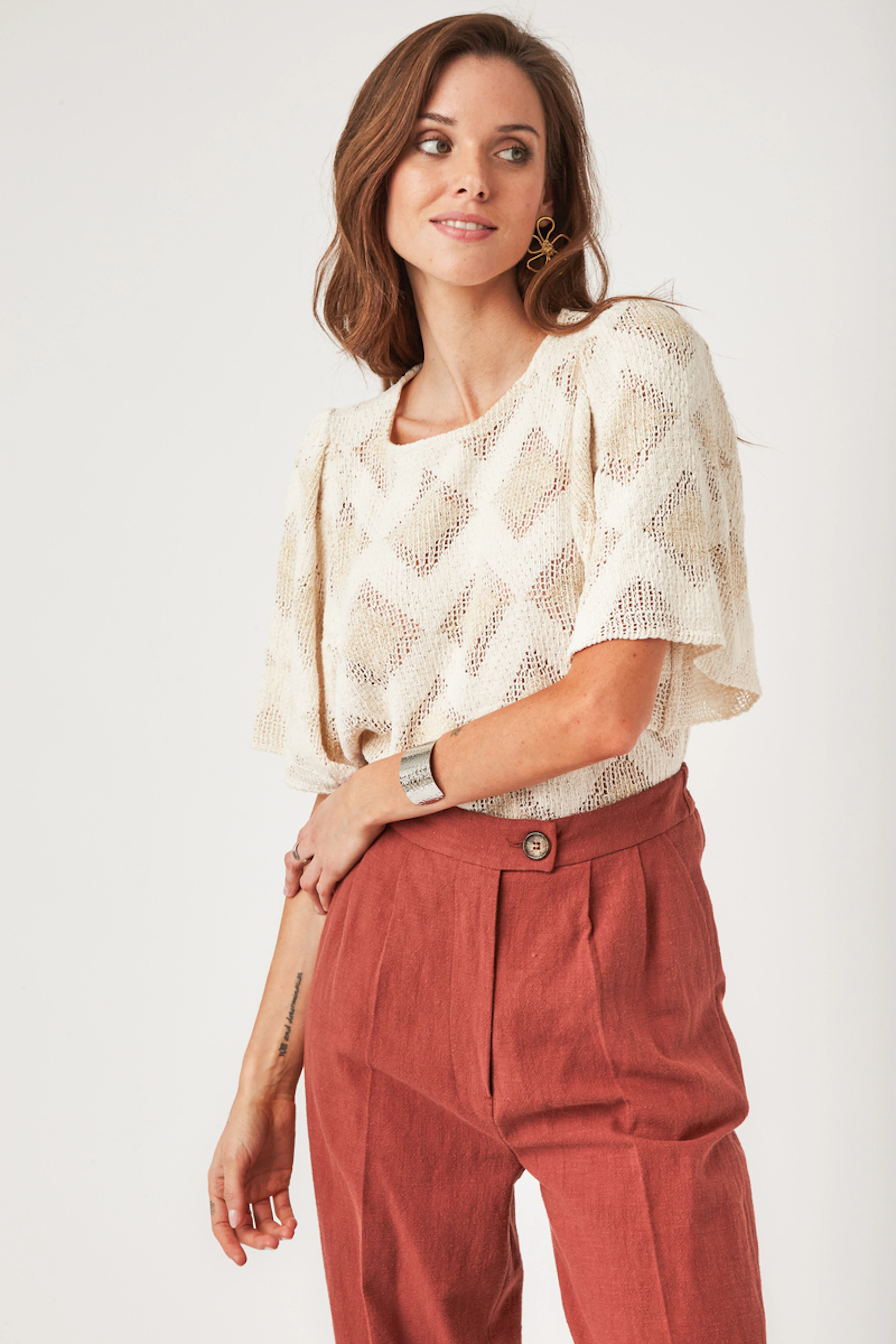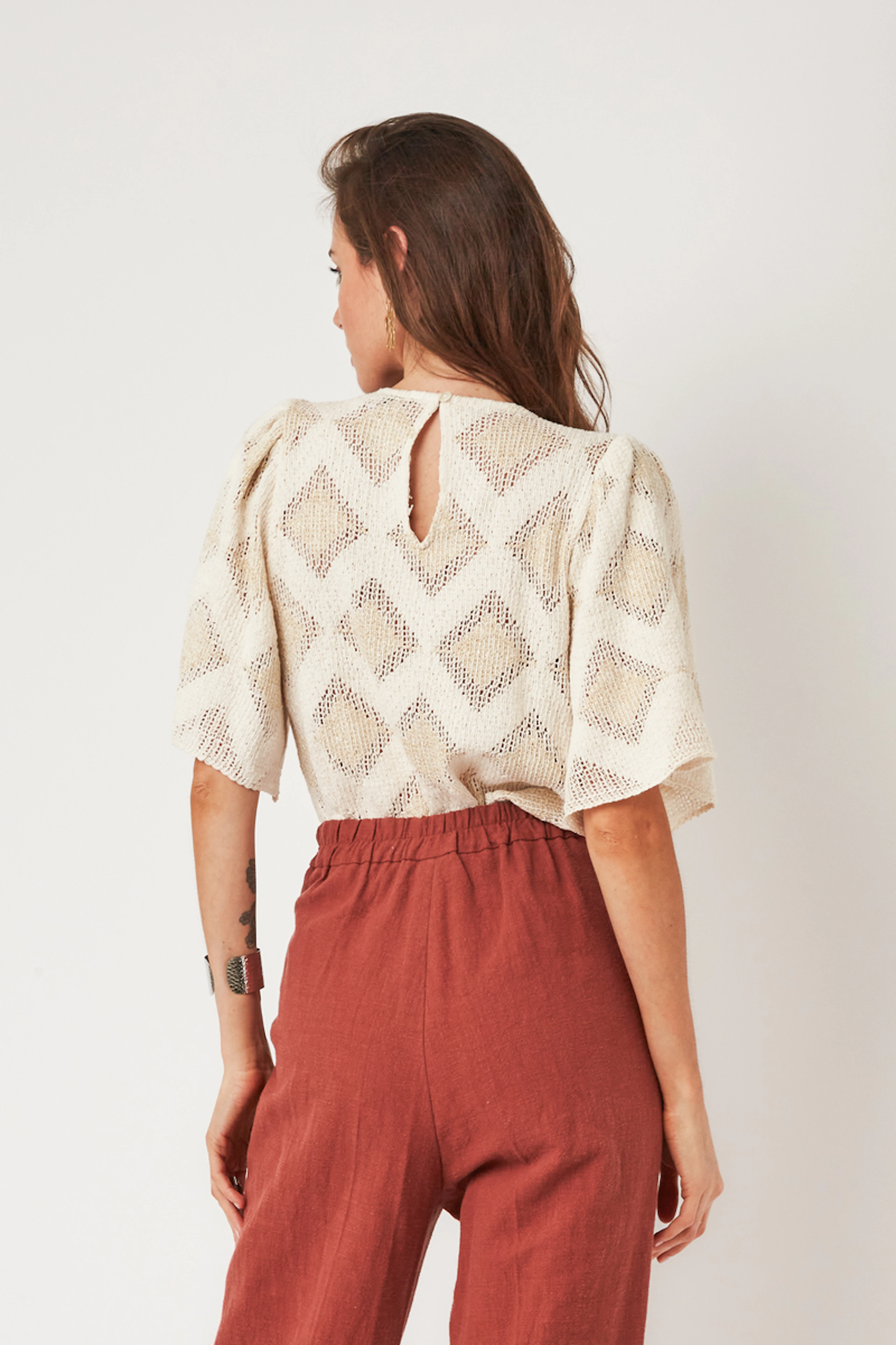 Mykonos-Bluse - ein elegantes und bequemes Trendteil. Diese Bluse mit kurzen, ausgestellten Ärmeln, einem weiten Kragen und einer Öffnung im Rücken mit einem goldenen Knopf kombiniert einen trendigen Look mit einem weichen, hochwertigen Materialgefühl dank ihrer Zusammensetzung aus geflochtener Baumwolle, 78% Baumwolle, 15% Polyester und 7% anderen Fasern. Die in Frankreich hergestellte Bluse ist pflegeleicht (Waschen bei 30 ° C) und passt sich jedem Stil an, während sie Ihnen einen unvergleichlichen Tragekomfort bietet.