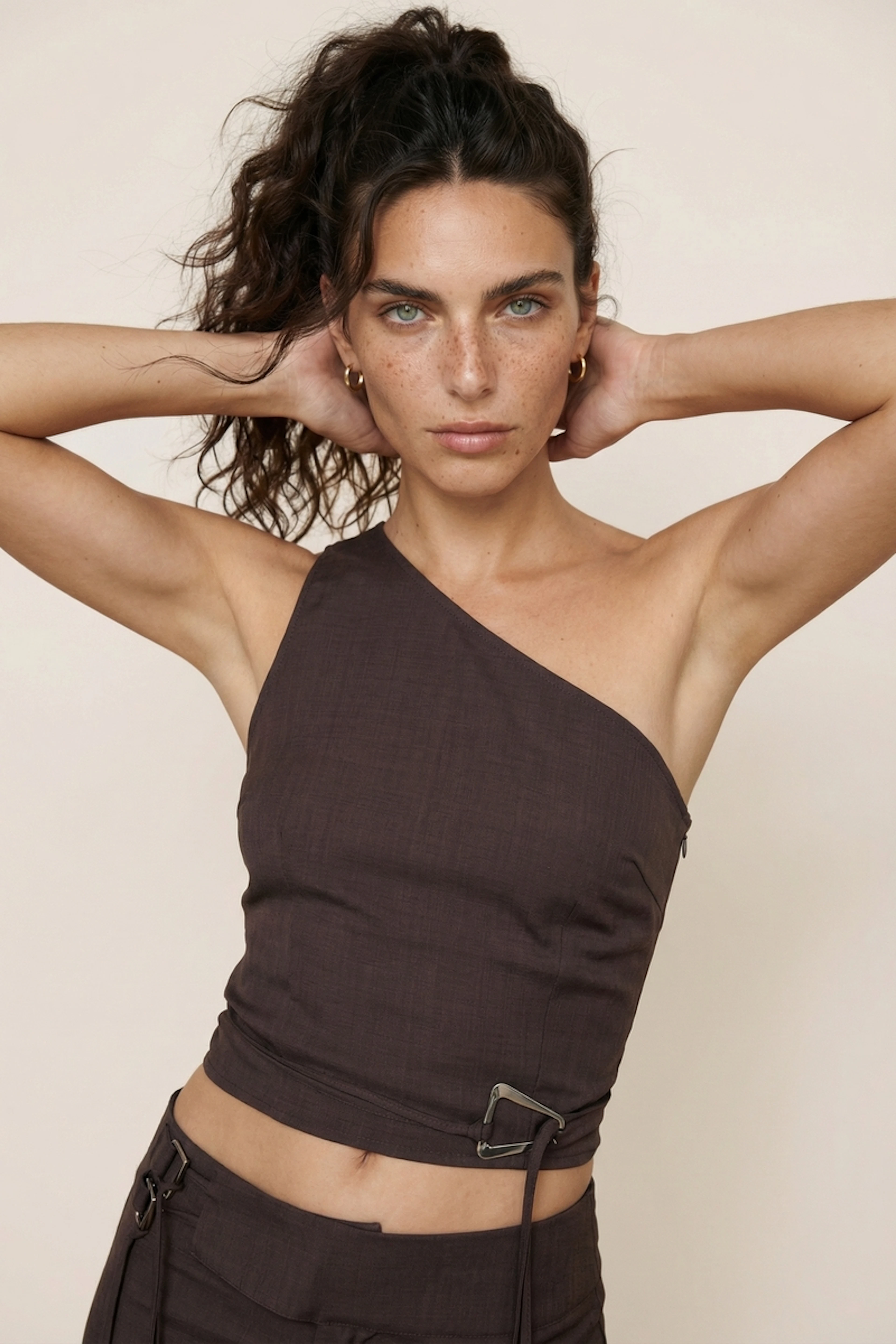 Kombiniere dieses Oberteil mit einer hochgeschnittenen Hose für einen absolut schicken und sommerlichen Look. • Asymmetrisches Oberteil • Ein Träger • Figurbetonter Schnitt • Seitenverschluss mit Schlaufen • Subtile und raffinierte Textur