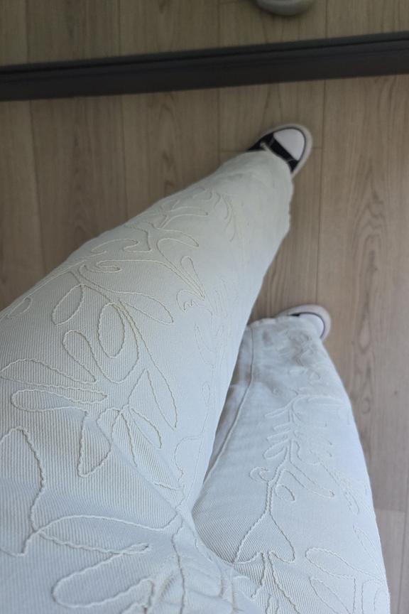"Sehr netter beigefarbener Jean, etwas groß in der Größe. Die Stickmuster sind schön, das ist mal was anderes als die klassischen beigen Jeans."