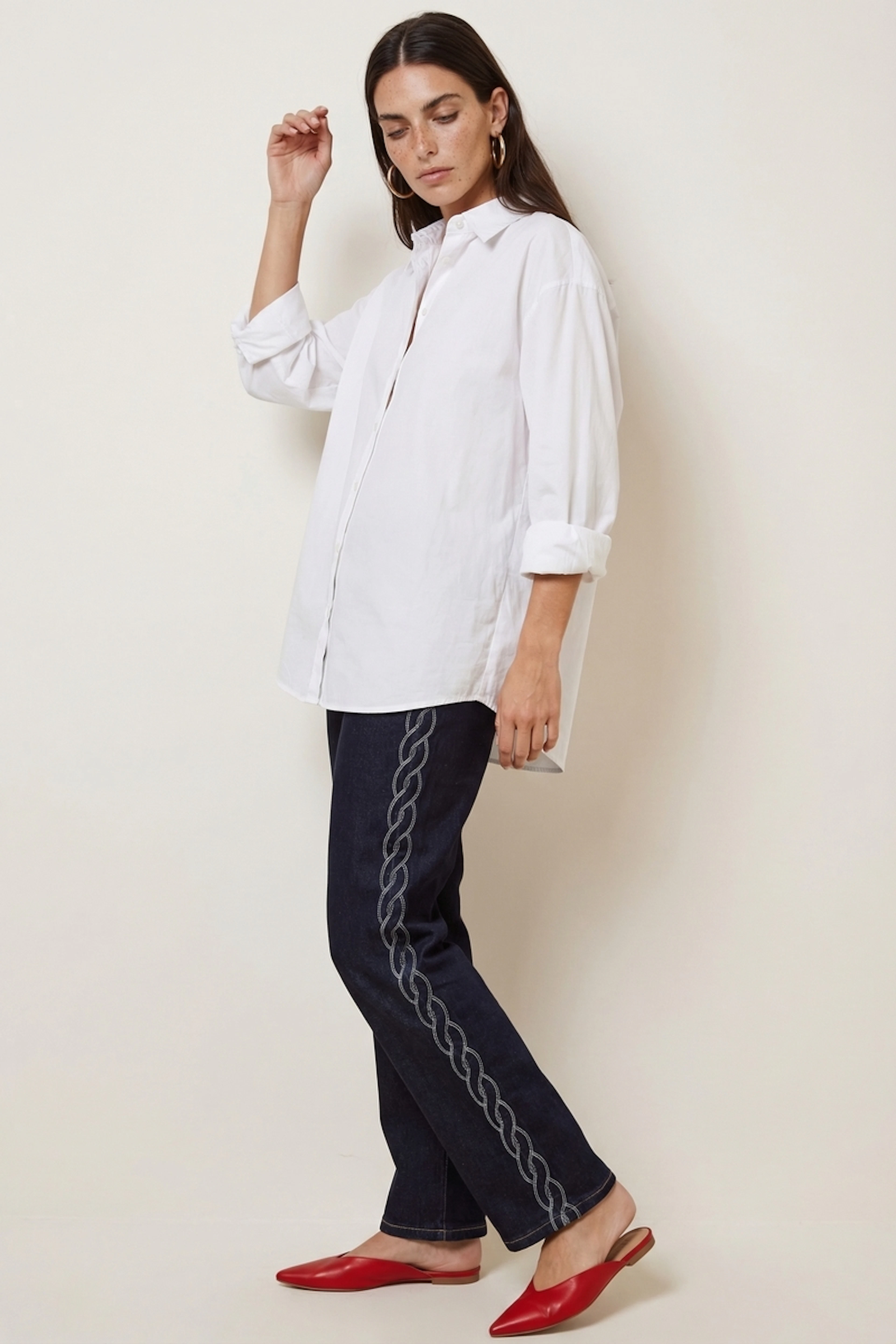 Trage diese jeans mit einem weiten pullover und stiefeln für einen perfekten chic look in jeder saison. • Gerade jeans • Bequeme passform • Besticktes muster an der seite • Standard bund • Klassische länge