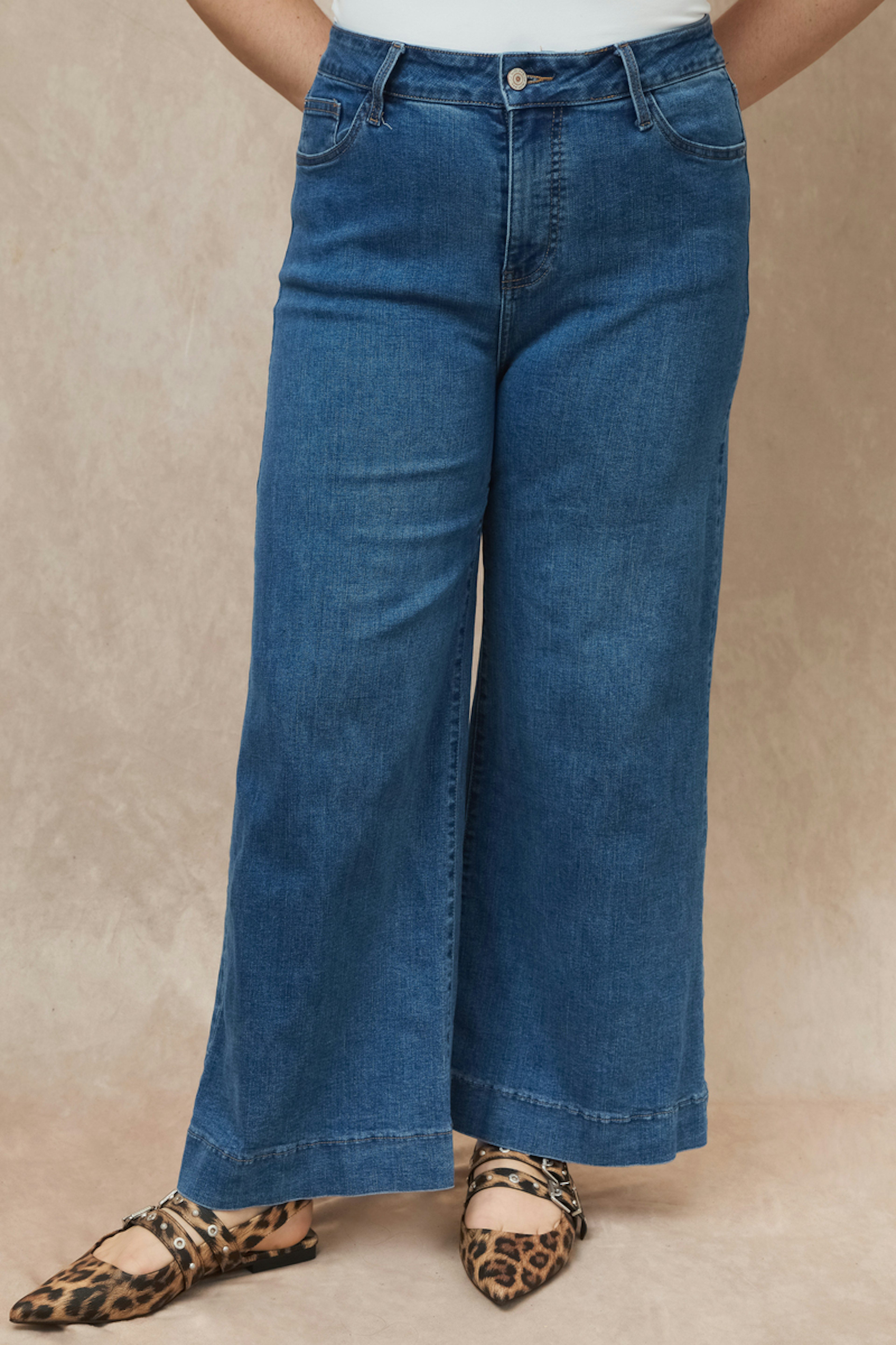 Kombinieren Sie diese ausgestellte Jeans mit einer fließenden Bluse und Mokassins für einen schick-lässigen Look, der sowohl für den Herbst als auch für den Frühling perfekt ist. - Ausgestellte Jeans aus Denim - Hohe, formende Taille - Wide-Leg-Schnitt - Sorgfältige Verarbeitung