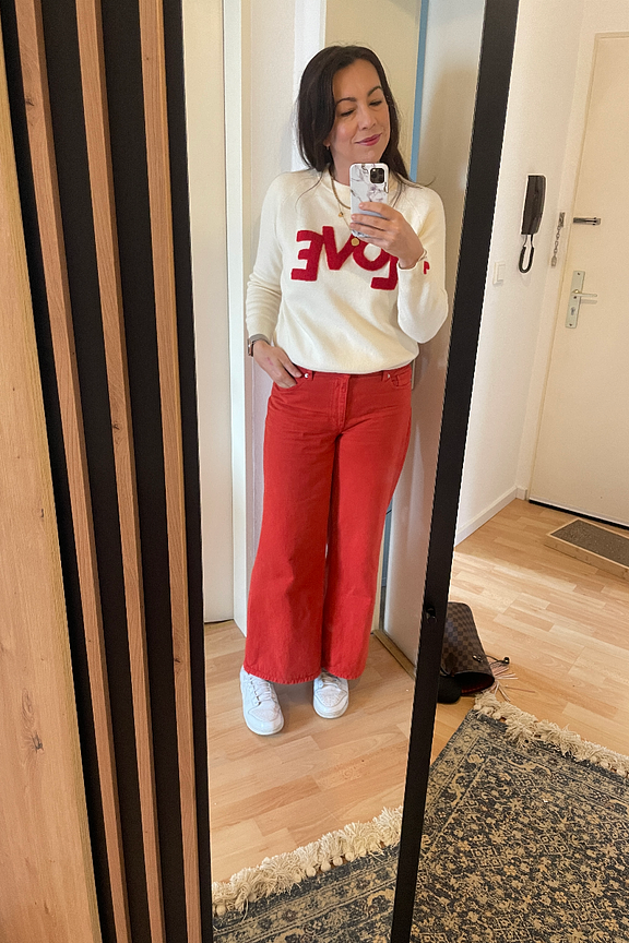 "Die gewünschte Größe passt sehr gut. Die Hose ist nicht das gleiche Rot wie auf dem Foto (heller), aber es ist eine sehr schöne Hose. Sie ist bequem."