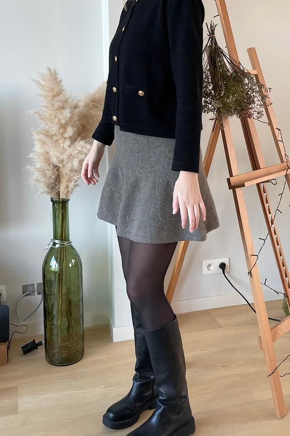 Kombiniere diesen rock mit einem weichen, gestrickten pullover und lederstiefeln fรผr einen schicken Look an kรผhlen Tagen. โข Kurzer rock โข Ausgestellte form โข Hohe taille โข Strukturierten stoff โข Perfekt fรผr den winter