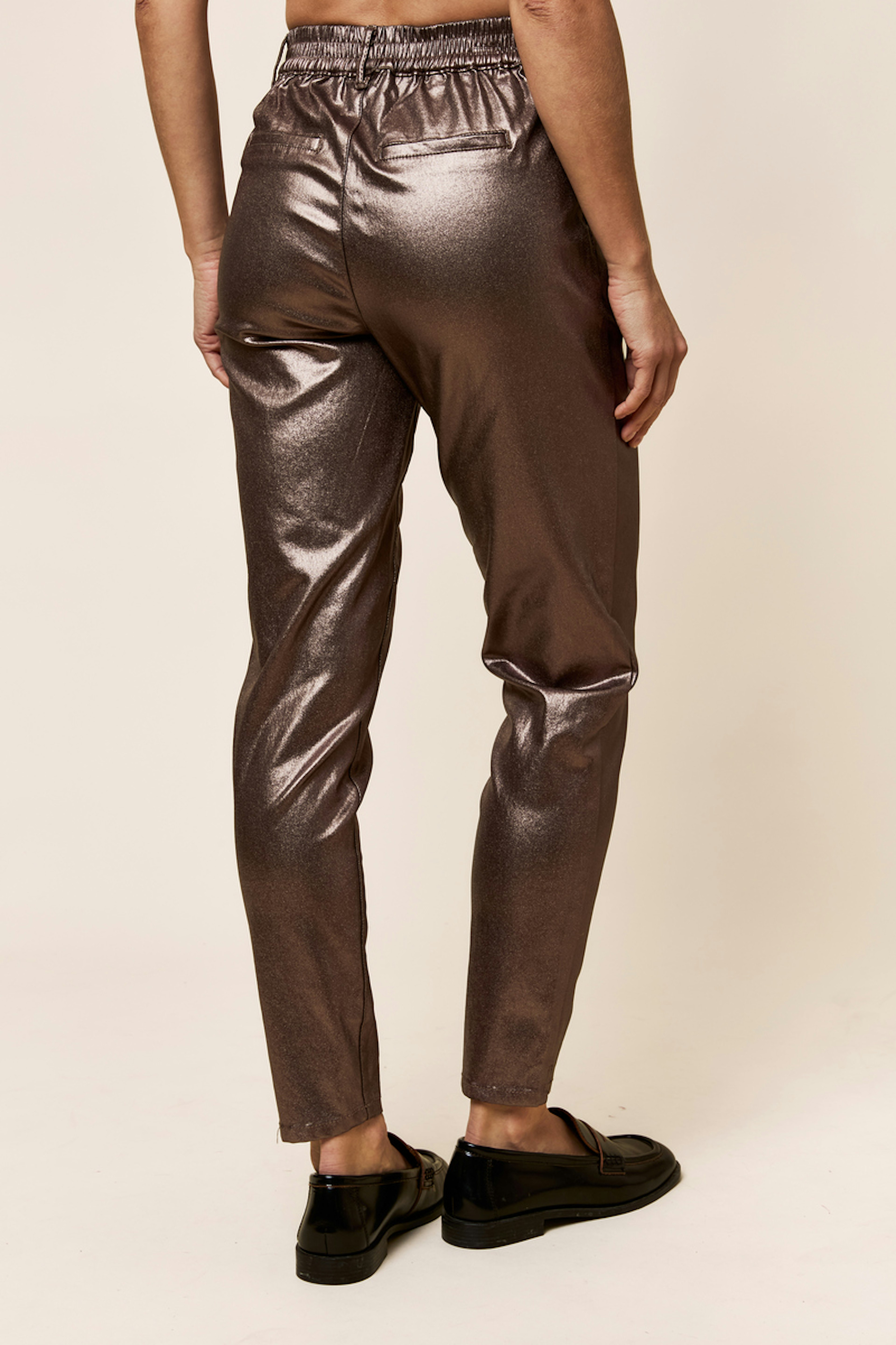 Kombiniere diese schicke Hose mit einer fließenden weißen Bluse und Absatzstiefeln für einen eleganten Look, ideal für den Winter. • Hose mit glatter Oberfläche • Elastischer Bund • Weite Passform • Mittlere Taille • Metallischer Effekt