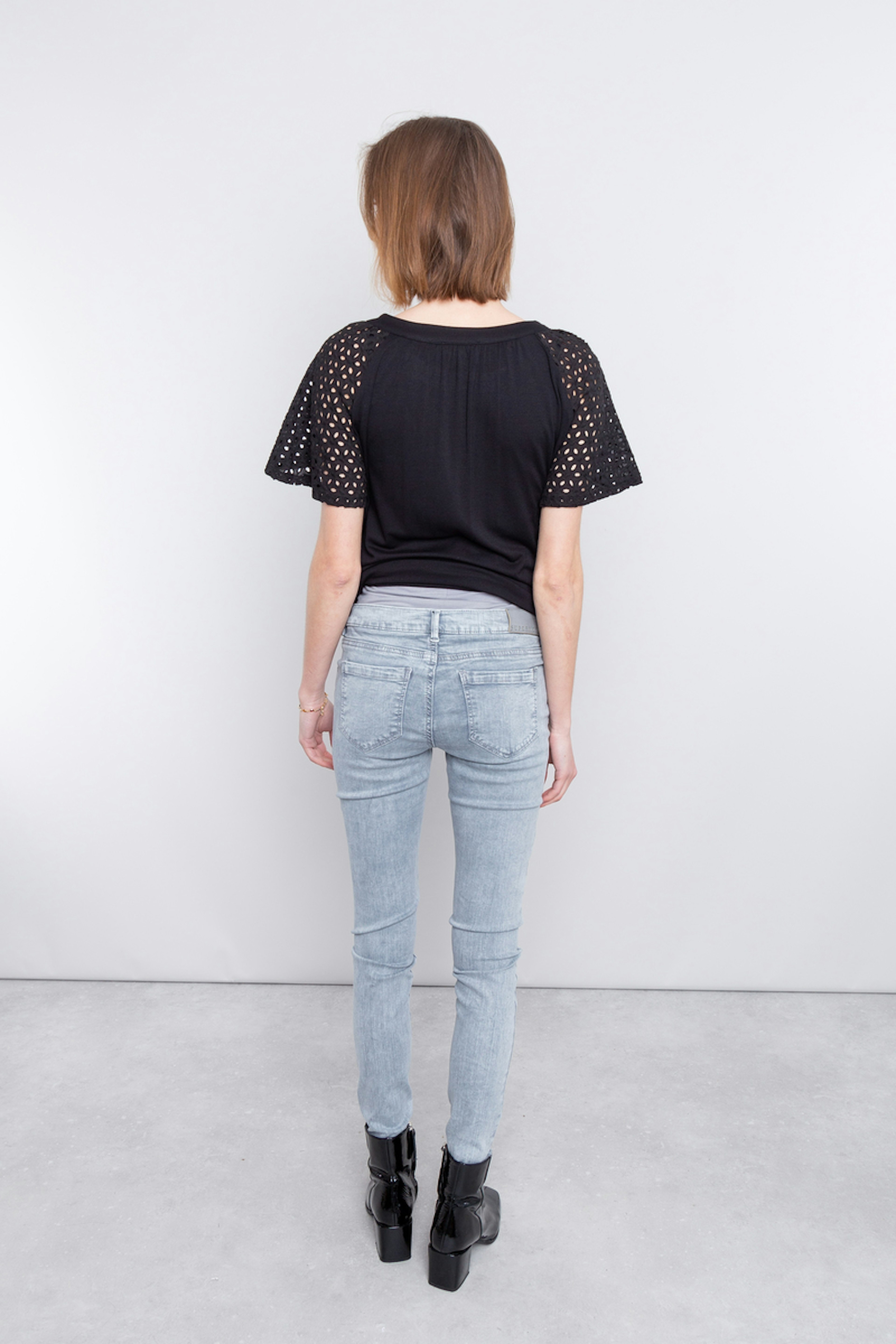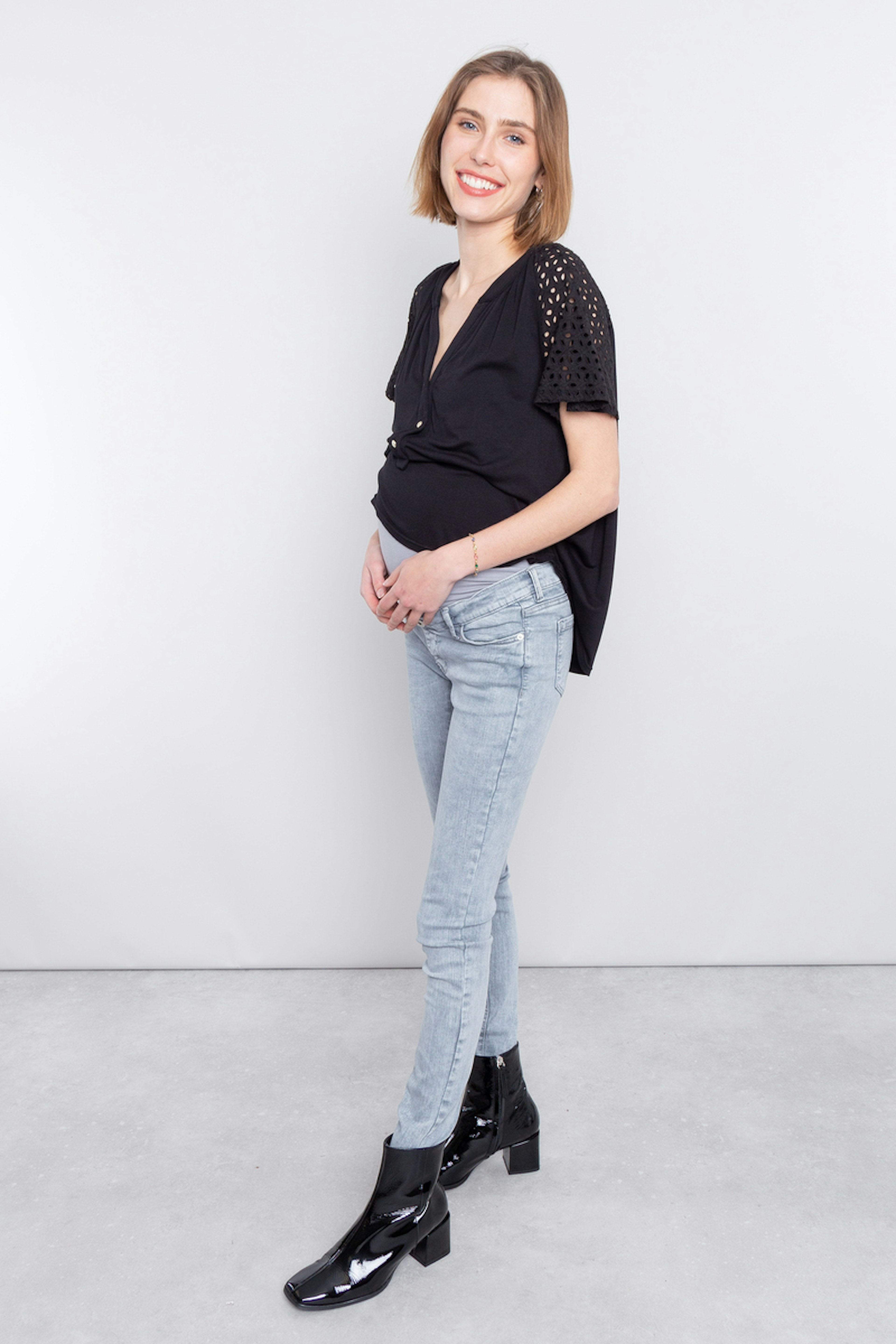 โข Hellgraue Schwangerschaftsjeans โข Schmaler Schnitt โข Komfortables Stirnband zur Bauchstรผtze โขTaschen