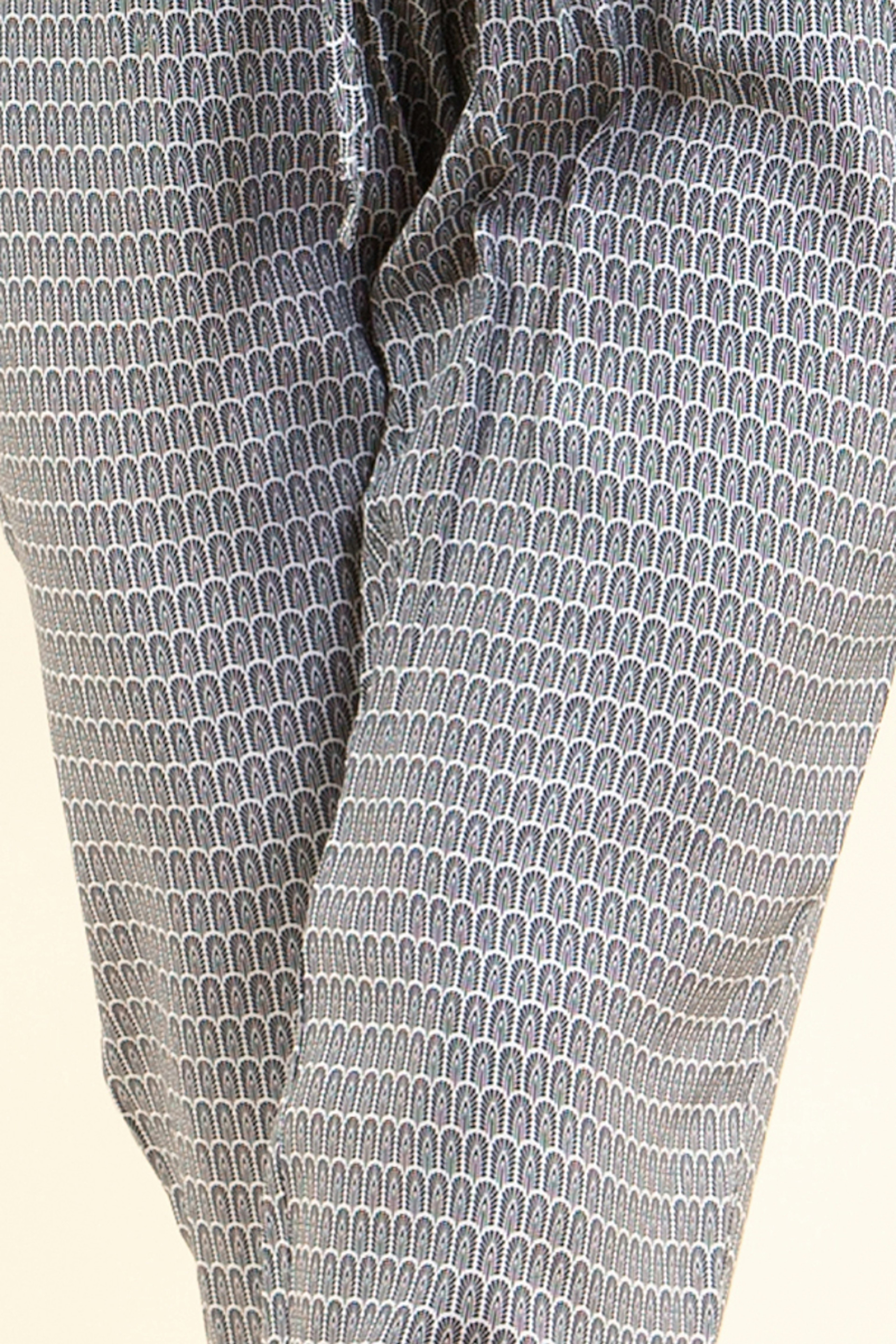 Schwangerschaftshose aus einem ultraleichten und flieรŸenden Material mit einem schรถnen marineblauen Palmettenprint. Elastischer Bund mit Bindeband. Diese Hose fรผr schwangere Frauen ist in der Sommersaison sehr angenehm zu tragen und lรคsst sich leicht kombinieren. Es ist Oeko-Tex-zertifiziert.