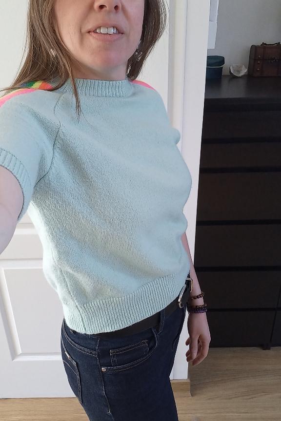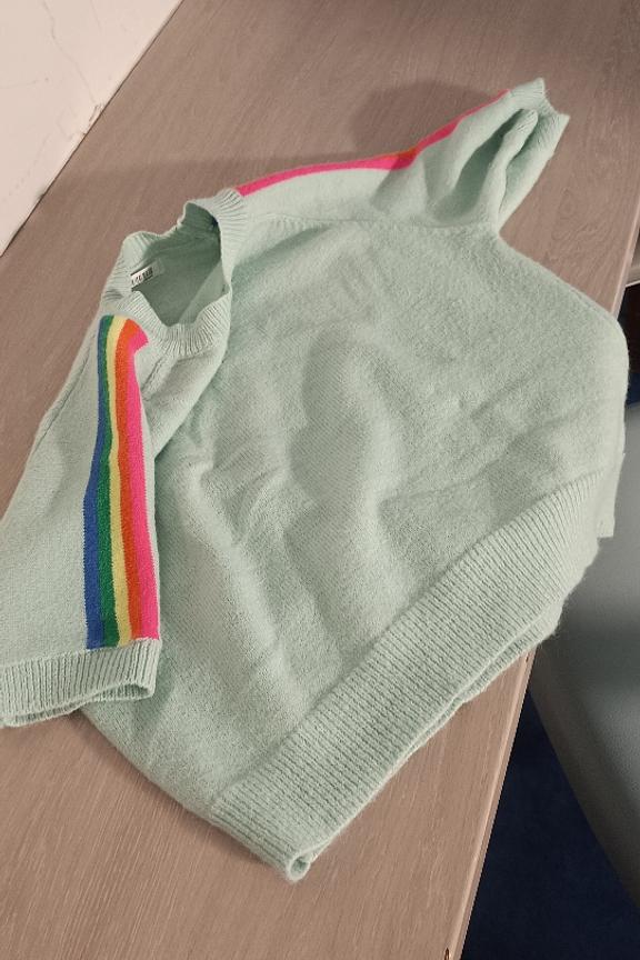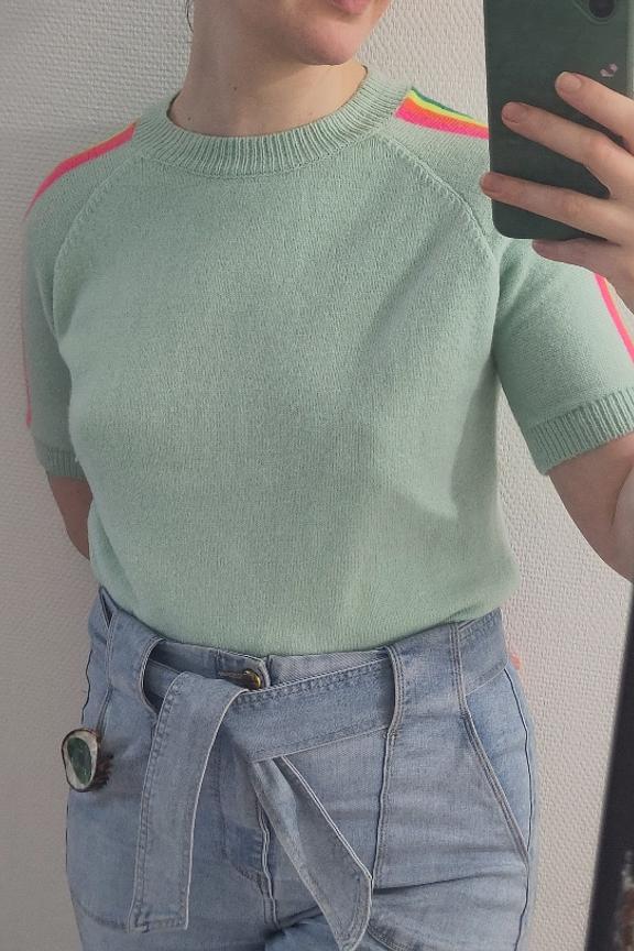 Verleihen Sie Ihrem Outfit mit diesem grรผnen Pullover einen frischen Touch. Kombinieren Sie ihn mit einer hochgeschnittenen Jeans fรผr einen lรคssigen, modischen Look. - Pullover mit kurzen รrmeln - Farbiger Streifen an den รrmeln - Klassischer Rundhalsausschnitt - Gerader Schnitt - Leuchtendes Pastellgrรผn