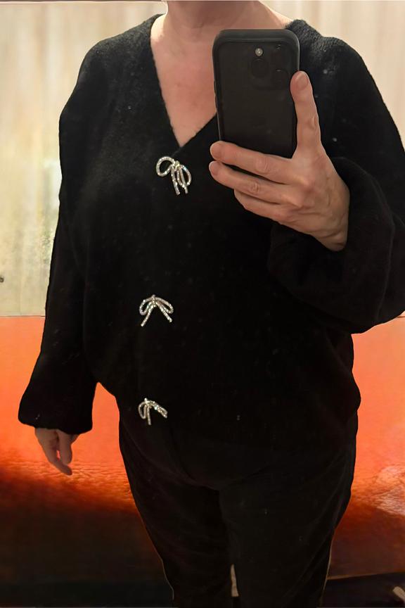 Setze einen schicken Akzent in deinem Outfit mit diesem schwarzen pullover. Kombiniere ihn mit einer slim jeans und boots für eine entspannte Eleganz in diesem Winter. • Pullover mit langen Ärmeln • Mäßige Passform • V-Ausschnitt • Dekorative Schleifendetails • Weicher und bequemer Stoff