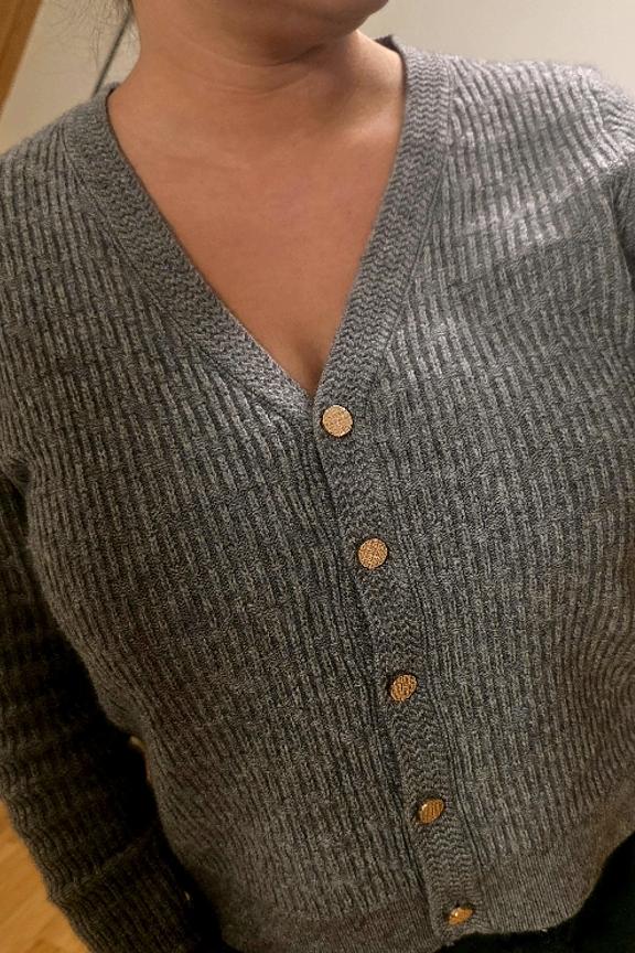 Kombiniere diesen grauen Cardigan mit einer hohen Jeans und Ankle Boots fรผr einen schicken und lรคssigen Look, perfekt fรผr den Winter. โข Pullover โข V-Ausschnitt โข Zentrale Knopfverschluss โข Lange รrmel โข Gerippter Abschluss