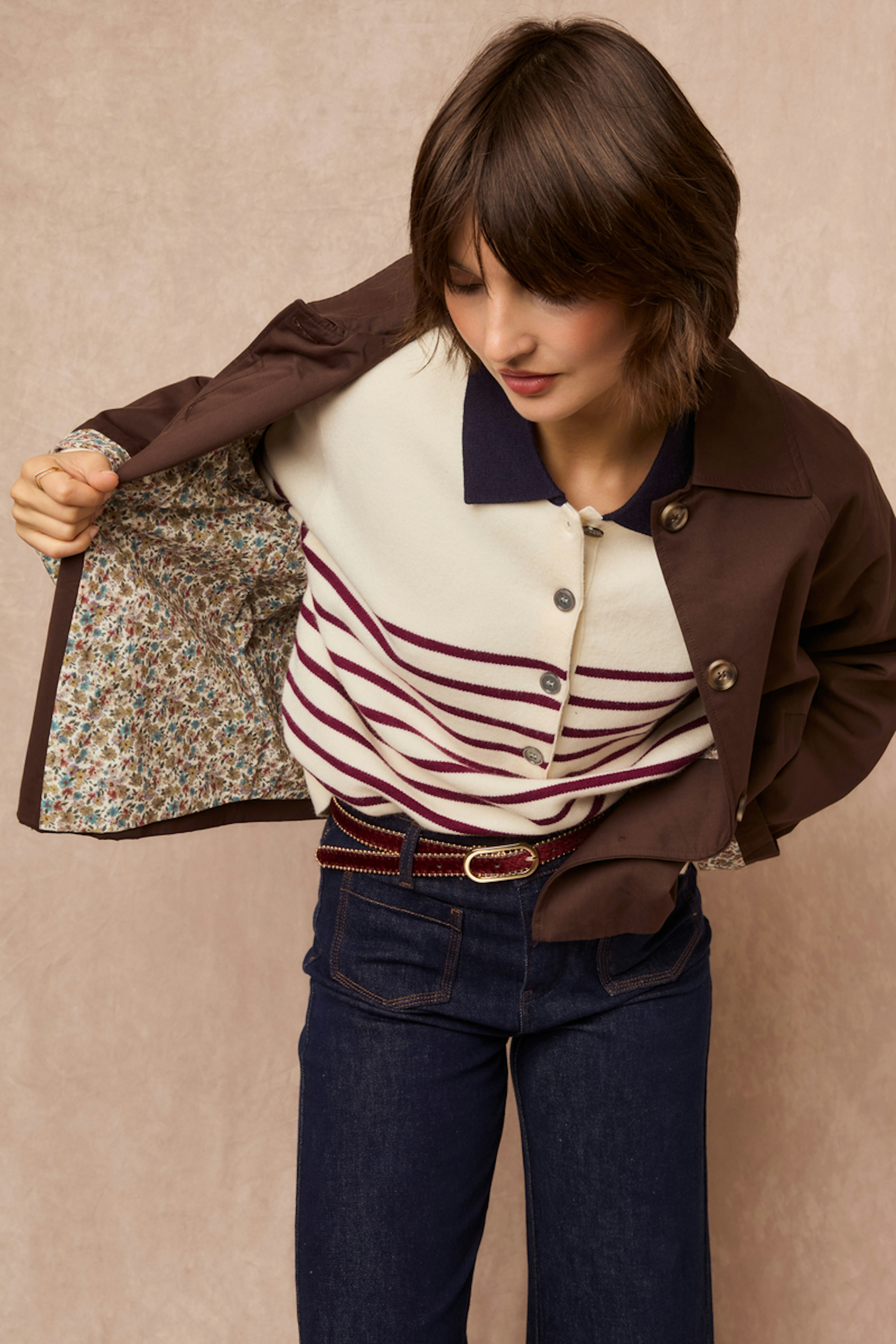 Trage diesen gestreiften Pullover mit einer hochbundigen Jeans und Stiefeln für einen schicken Look im Winter. • Wollpullover • Hemdblusenkragen • Knöpfe auf der Vorderseite • Lange Ärmel • Streifenmuster