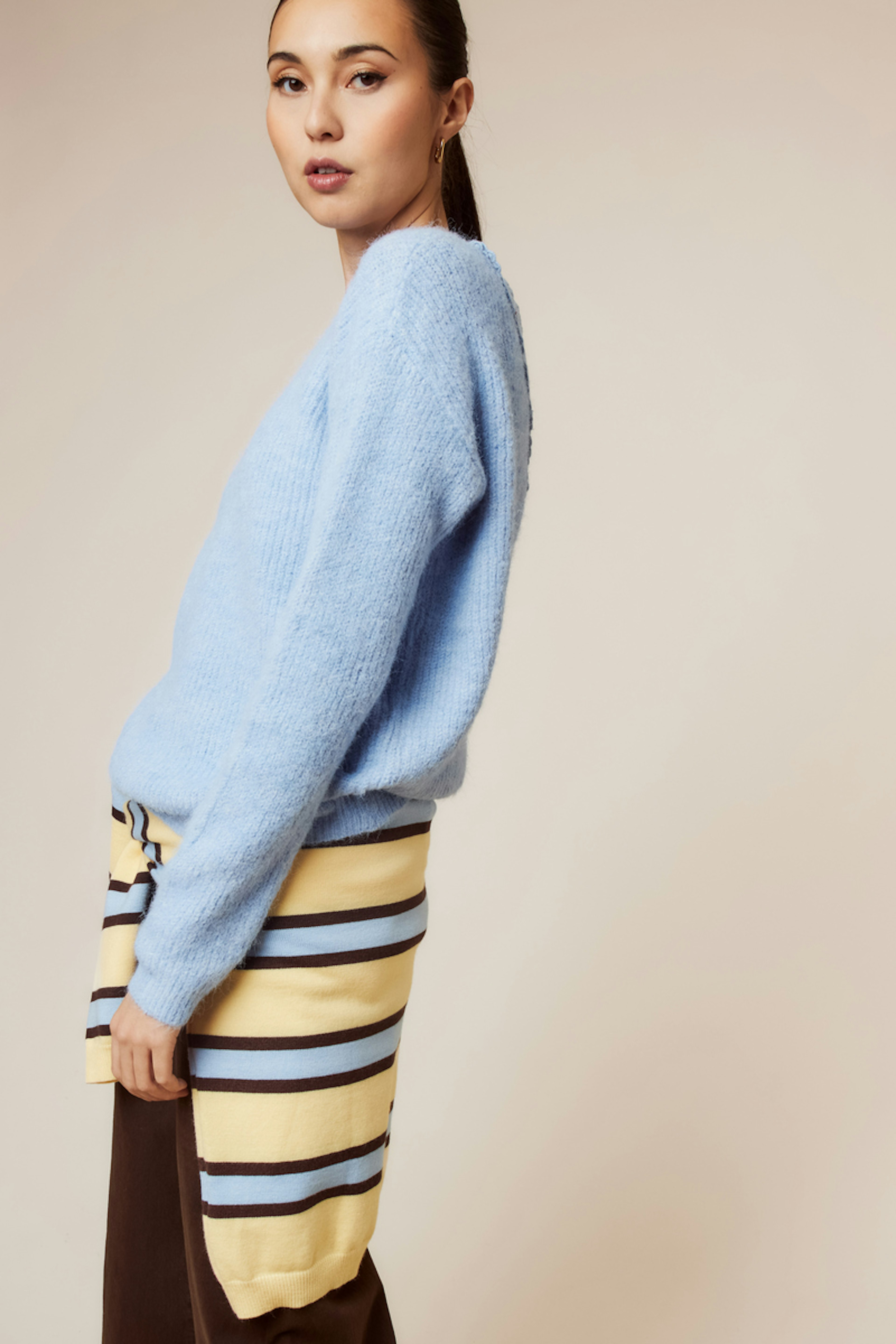 Kombiniere diesen blauen pullover mit einem lederrock fรผr einen schicken Winterlook. โข Strukturiertes Oberteil โข V-Ausschnitt hinten โข Lange รrmel โข Spitze Detail โข Sanfte und trendige Blautรถne