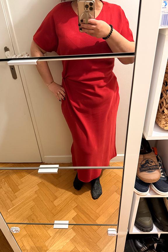 Trage dieses Kleid mit schwarzen Stiefeln für einen schicken Look im Winter. Eine zarte halskette verleiht einen Hauch von Eleganz. • Gerade geschnittenes Kleid • Kurze Ärmel • Midi-Länge • Raffung in der Taille • Knallige rote Farbe