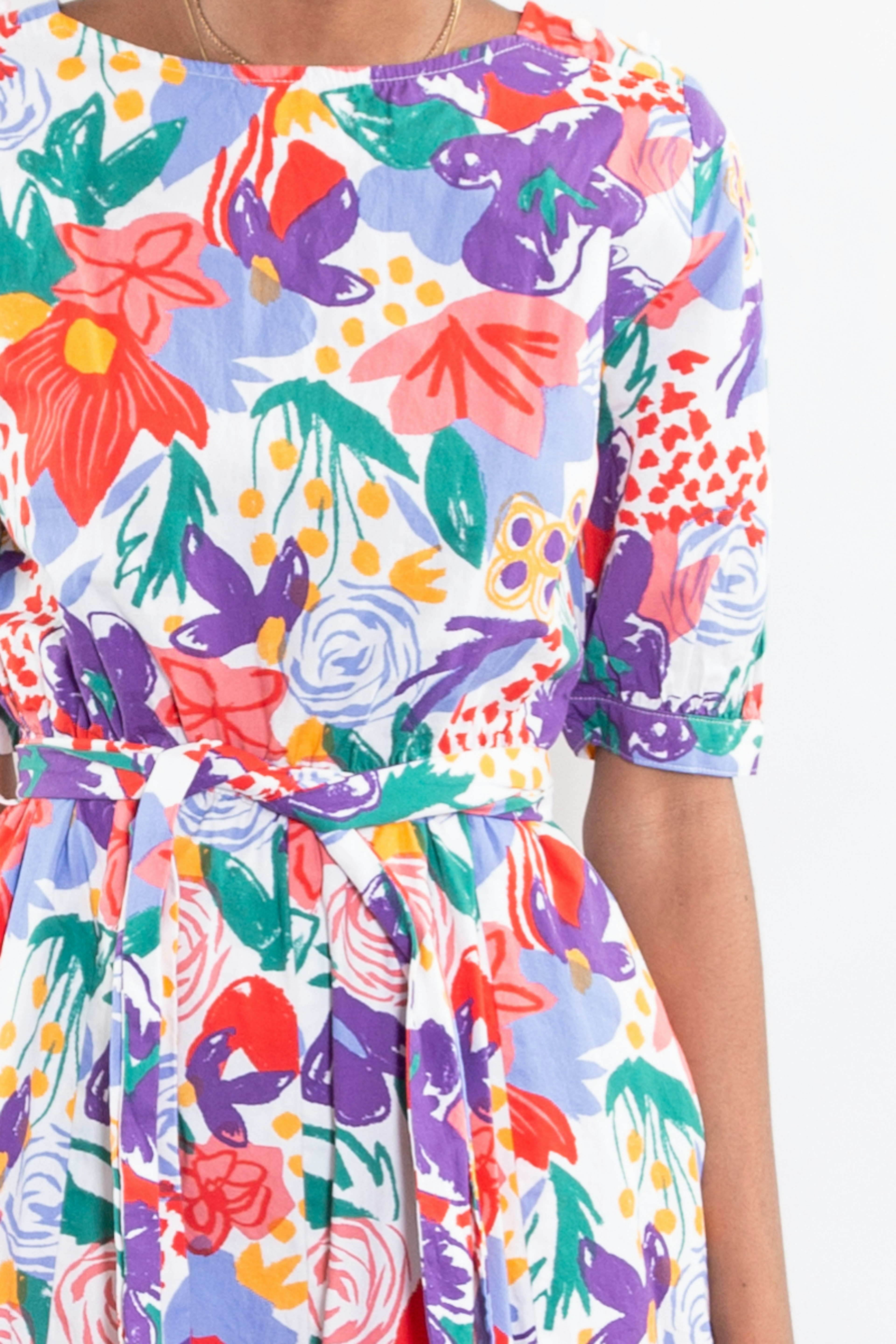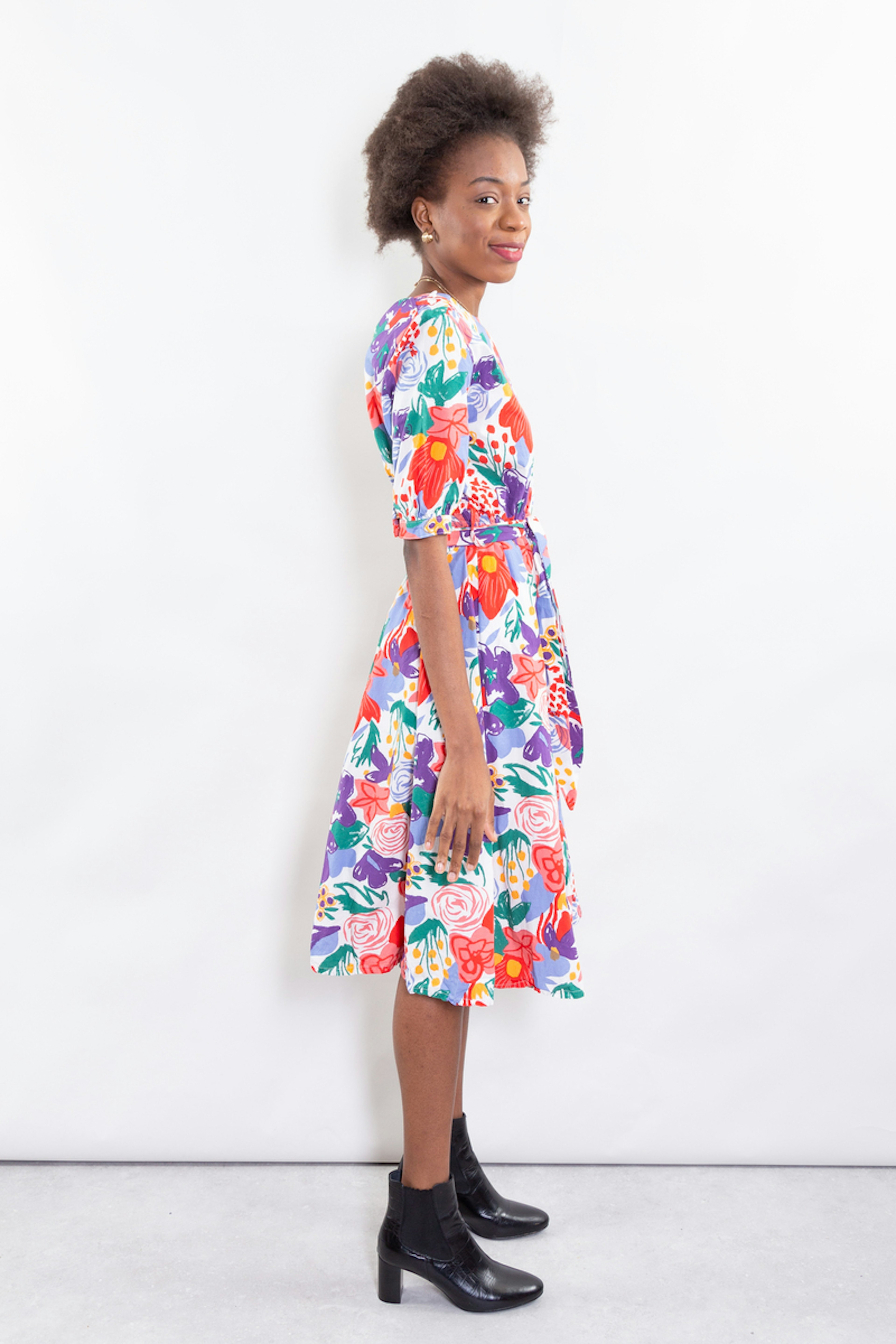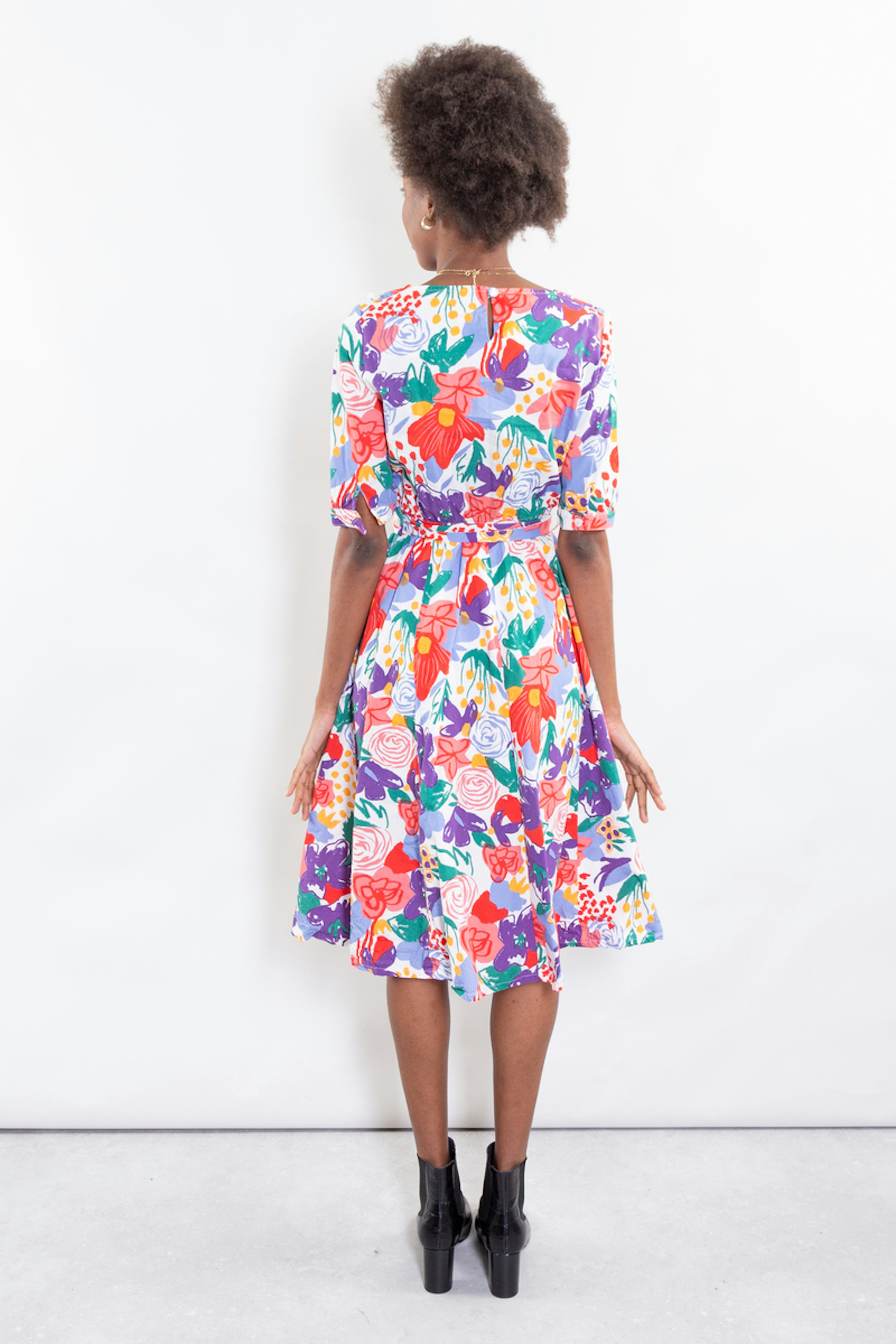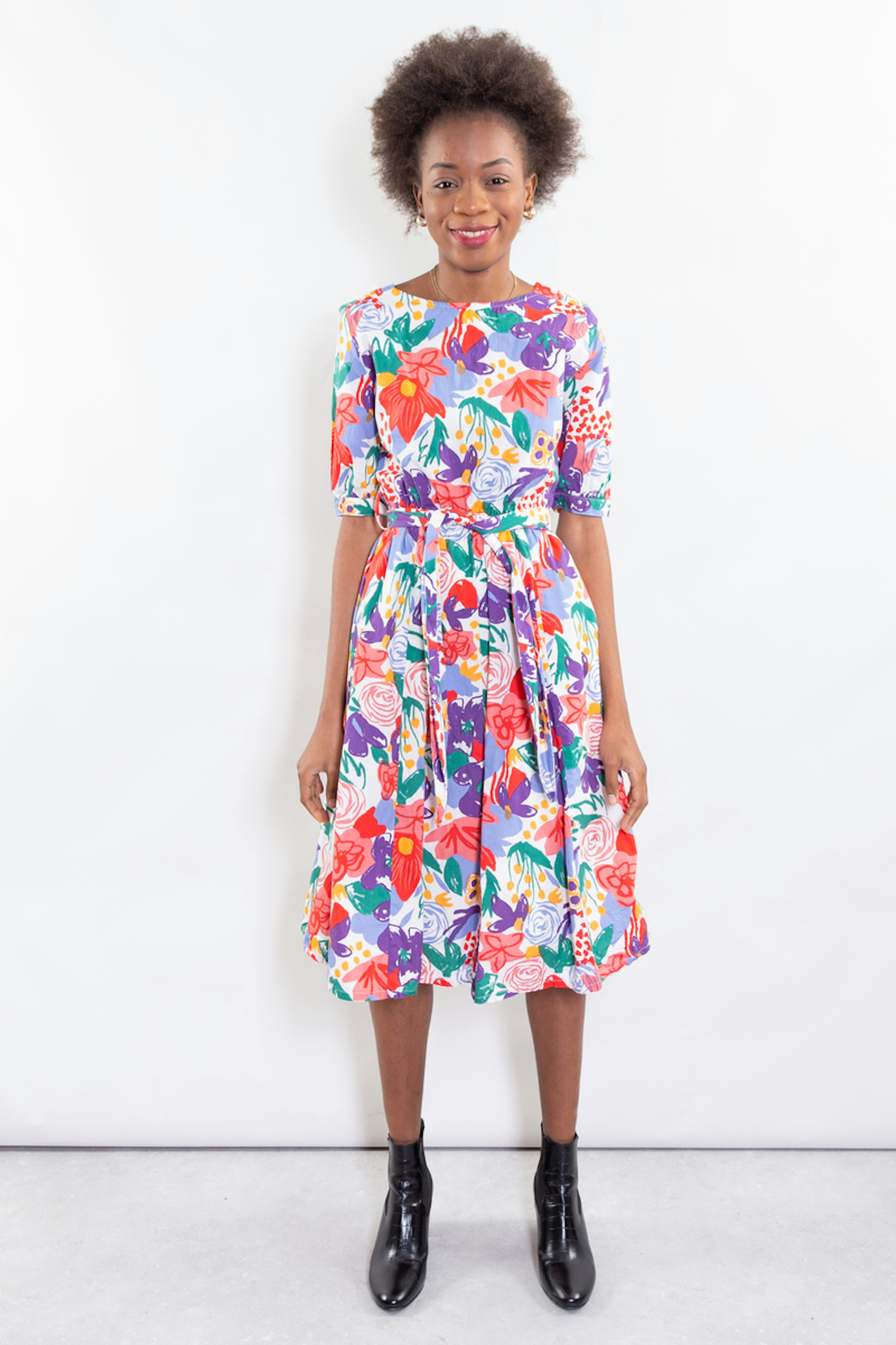 "Farbenfrohes Kleid, hรผbsches Muster und origineller Vintage-Schnitt"