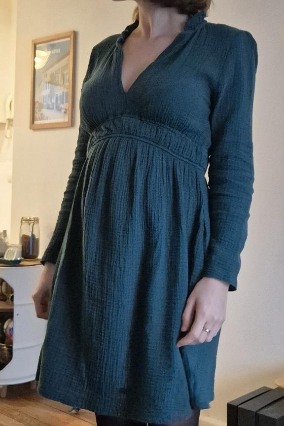 Dieses schicke und elegante Umstandskleid ist perfekt, um Ihre Silhouette in diesem Winter zu betonen. Kombinieren Sie es mit Stiefeletten und einer kuscheligen Strickjacke für einen raffinierten Look! - Umstandskleid aus Baumwolle - Empire-Schnitt - Lange Ärmel - V-Ausschnitt - Farbe Grün