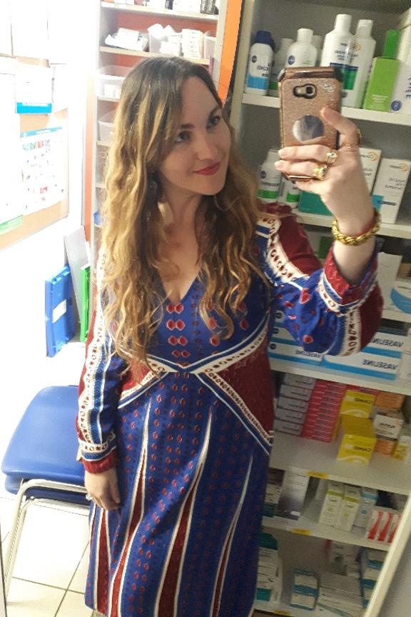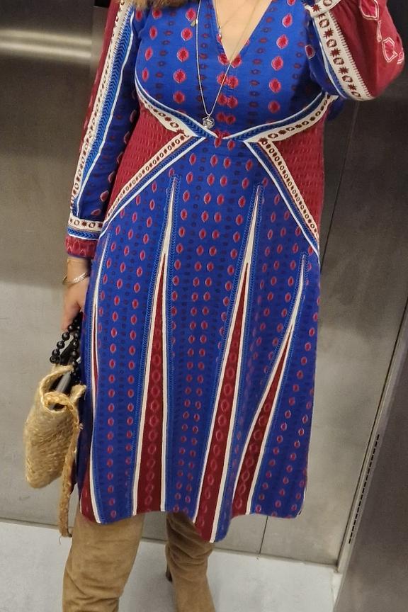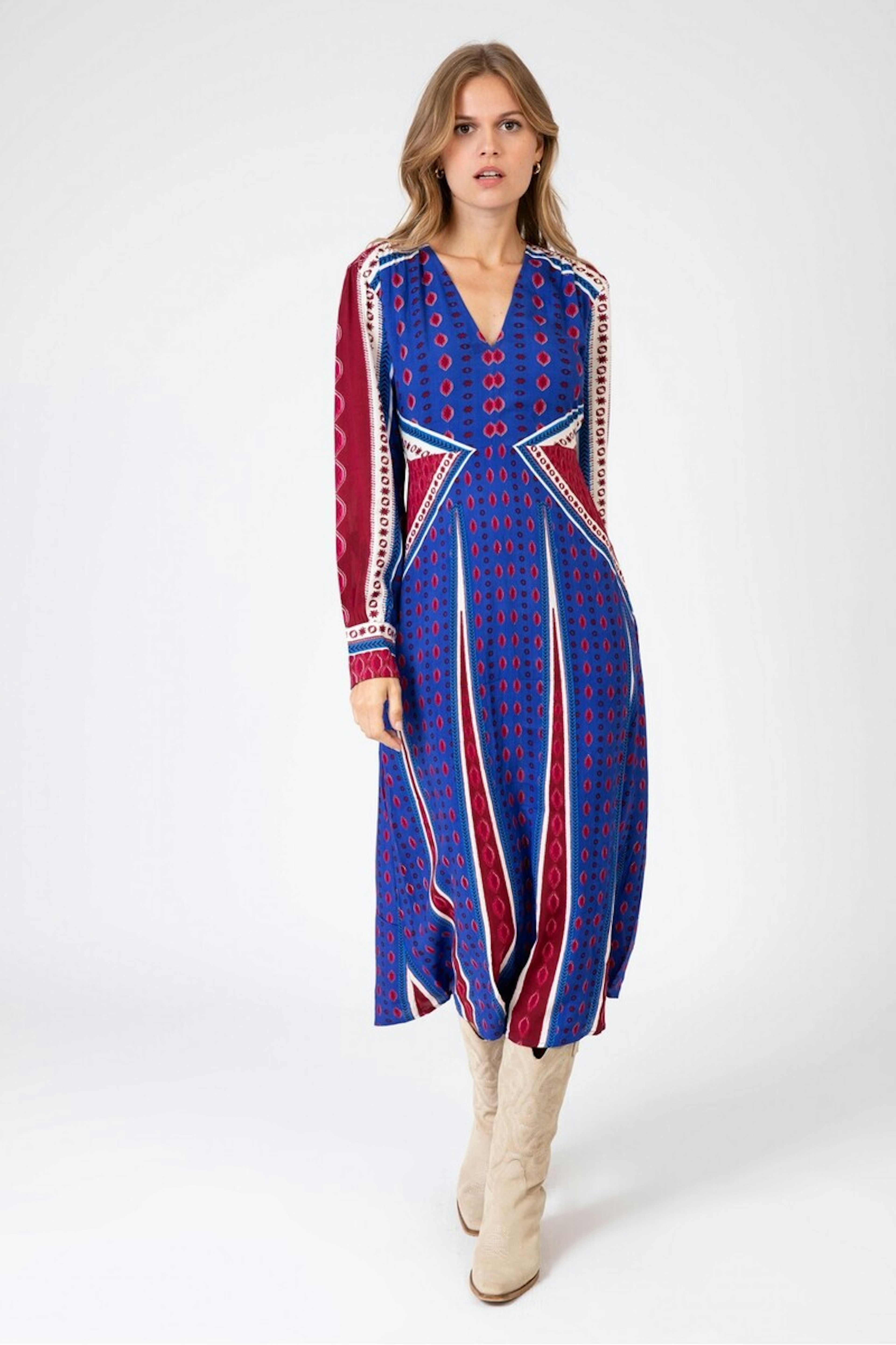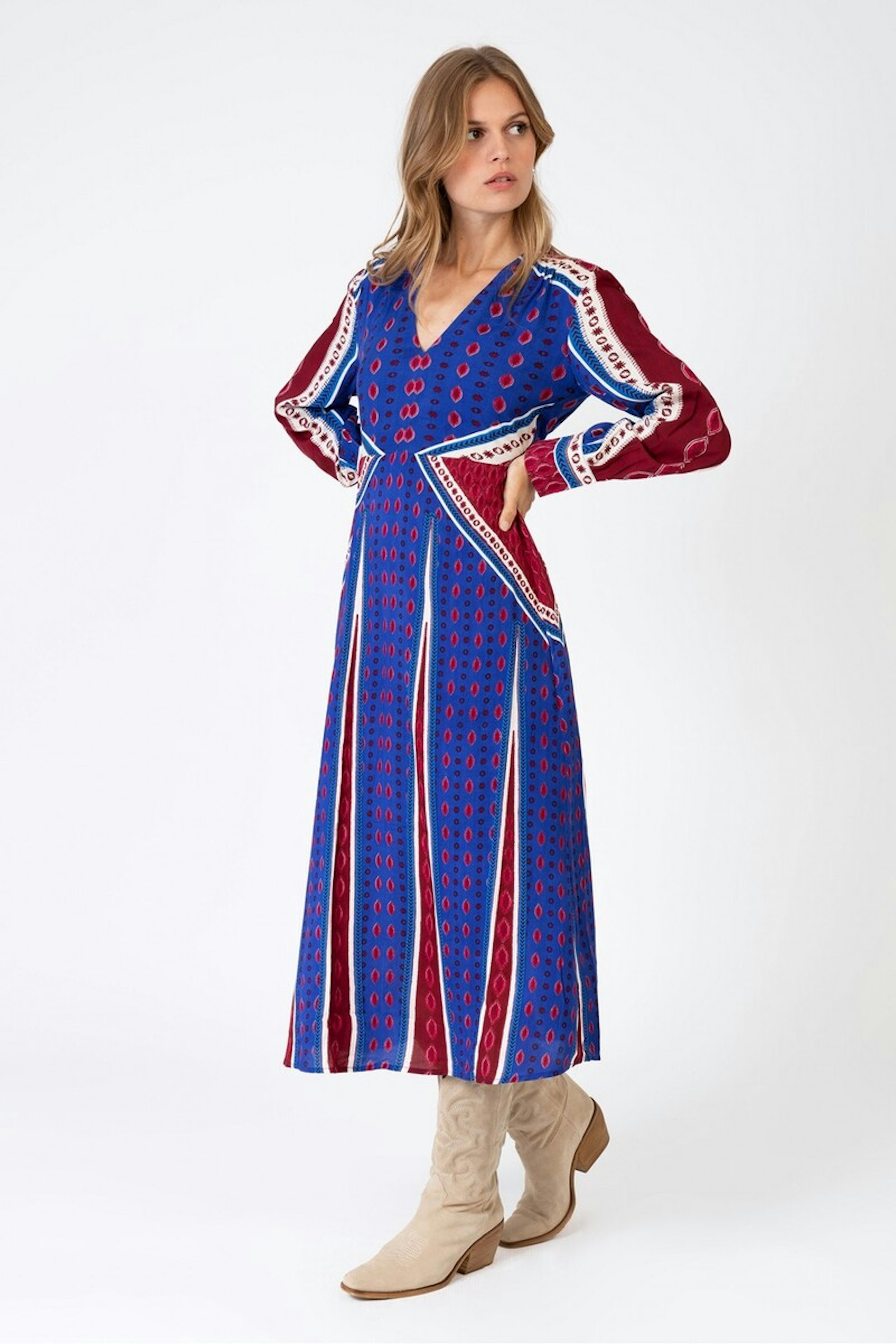 - Blau und rot bedrucktes Midikleid - Lange รrmel mit Abschlรผssen an den Hemdmanschetten - Platzierte Drucke - V-Ausschnitt - Elastischer Bund - Produktlรคnge ab Schulter bei Grรถรe S: 125 cm.