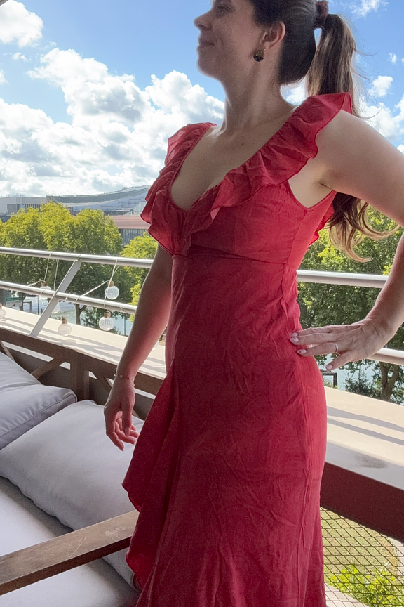 Kombinieren Sie dieses lange Seidenkleid mit goldenen Sandalen und einer passenden Clutch fรผr einen mรผhelosen Sommerlook. - Langes Kleid aus Seide - V-Ausschnitt - Hรผbscher Schlitz - Volants am Ausschnitt und am Schlitz - Gefรผttertes Kleid Modell fรคllt klein aus, bevorzugen Sie die nรคchstgrรถรere Grรถรe.