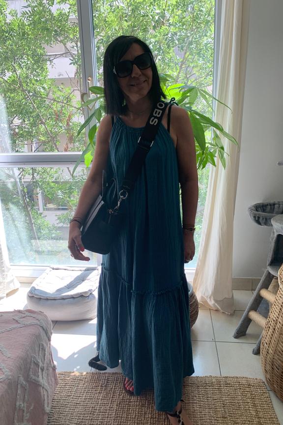 "Schรถnes Kleid, coole Farbe, knรถchellang und dick. Das Material aus Baumwollgaze macht es wirklich bequem und angenehm zu tragen. Das Kleid ist sehr gut verarbeitet und hat eine gute Passform."