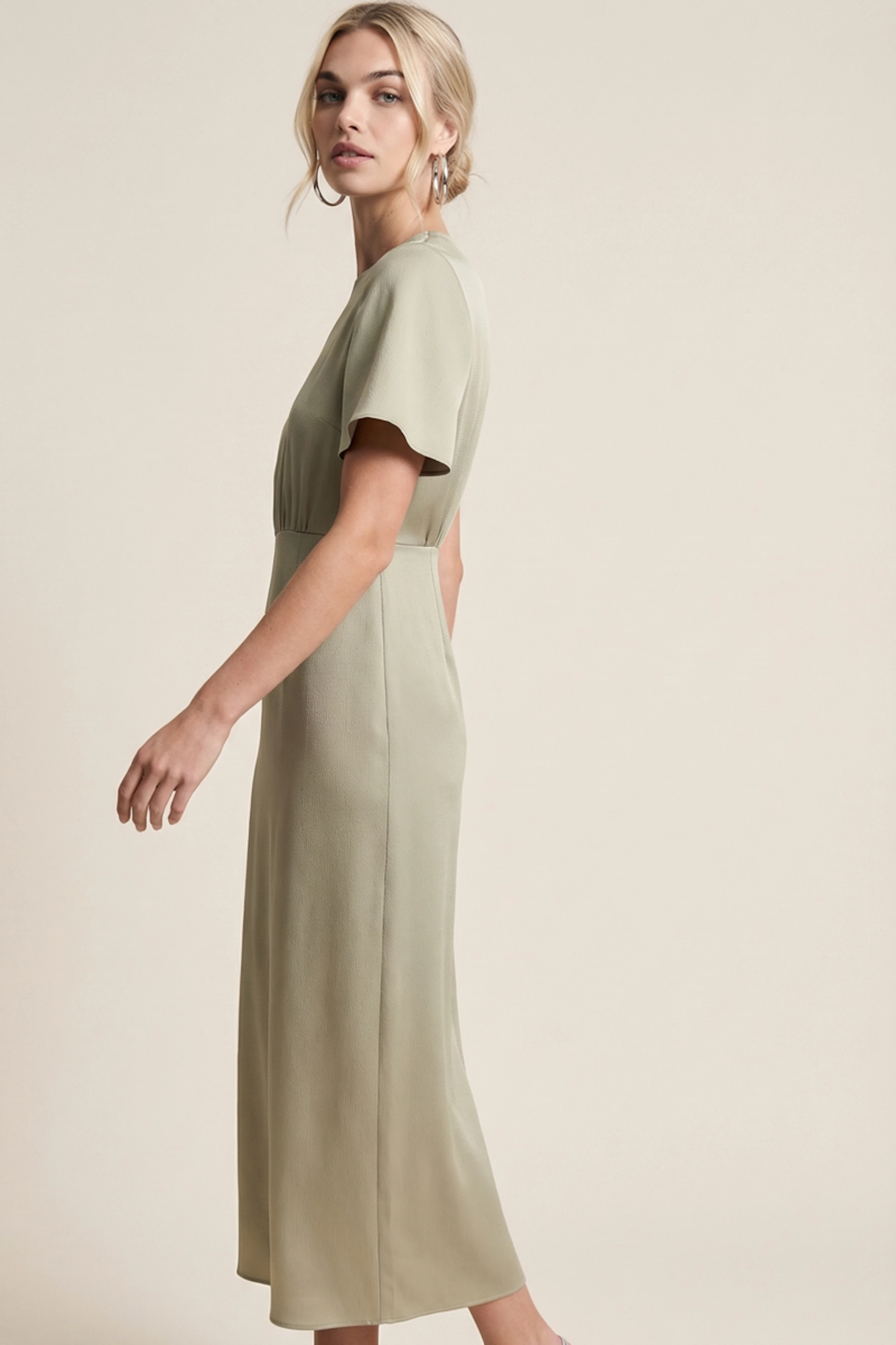 Kombinieren Sie dieses Kleid mit hochhackigen Sandalen und einer geflochtenen Tasche für einen schicken Sommerlook. - Langes Kleid - Gerader Schnitt - Kurze, ausgestellte Ärmel - Leicht betonte Taille - Elegante Khaki-Farbe