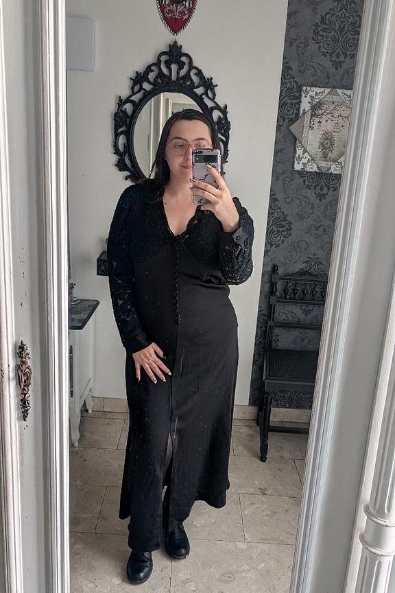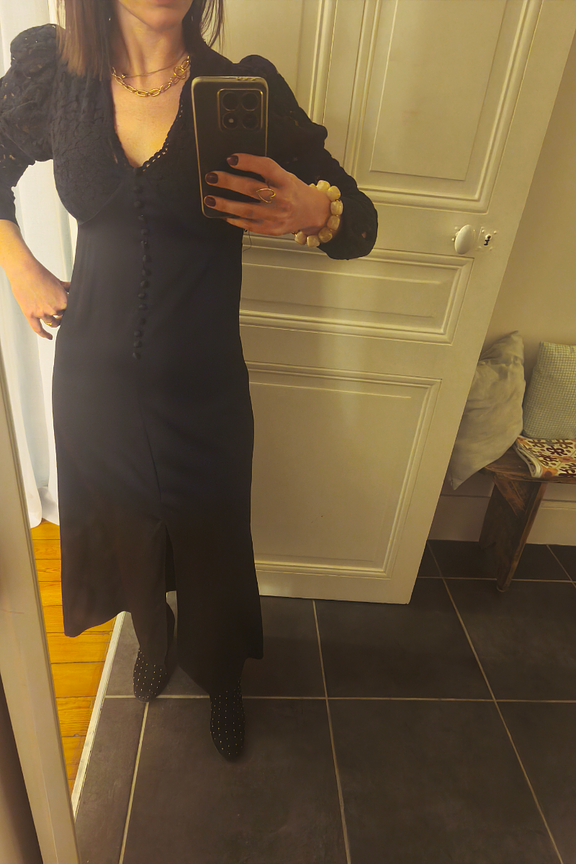 Fügen Sie goldene Ohrringe und Ankle Boots hinzu, um einen schicken Look zu kreieren, der zu jeder Jahreszeit perfekt ist. - Langes Kleid - Ärmel aus Spitze - V-Ausschnitt - Schlitz am Oberschenkel - Knopfleiste auf der Vorderseite