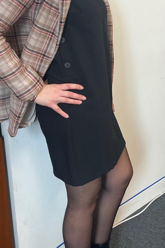 Trage dieses schicke Kleid mit silbernen Ohrringen und High Heels für einen raffinierten und zeitlosen Look. Perfekt für jede Saison. • Kurzes Kleid • Gerader Schnitt • Ärmellos • Seitliche Knopfschließe • Elegante schwarze Farbe