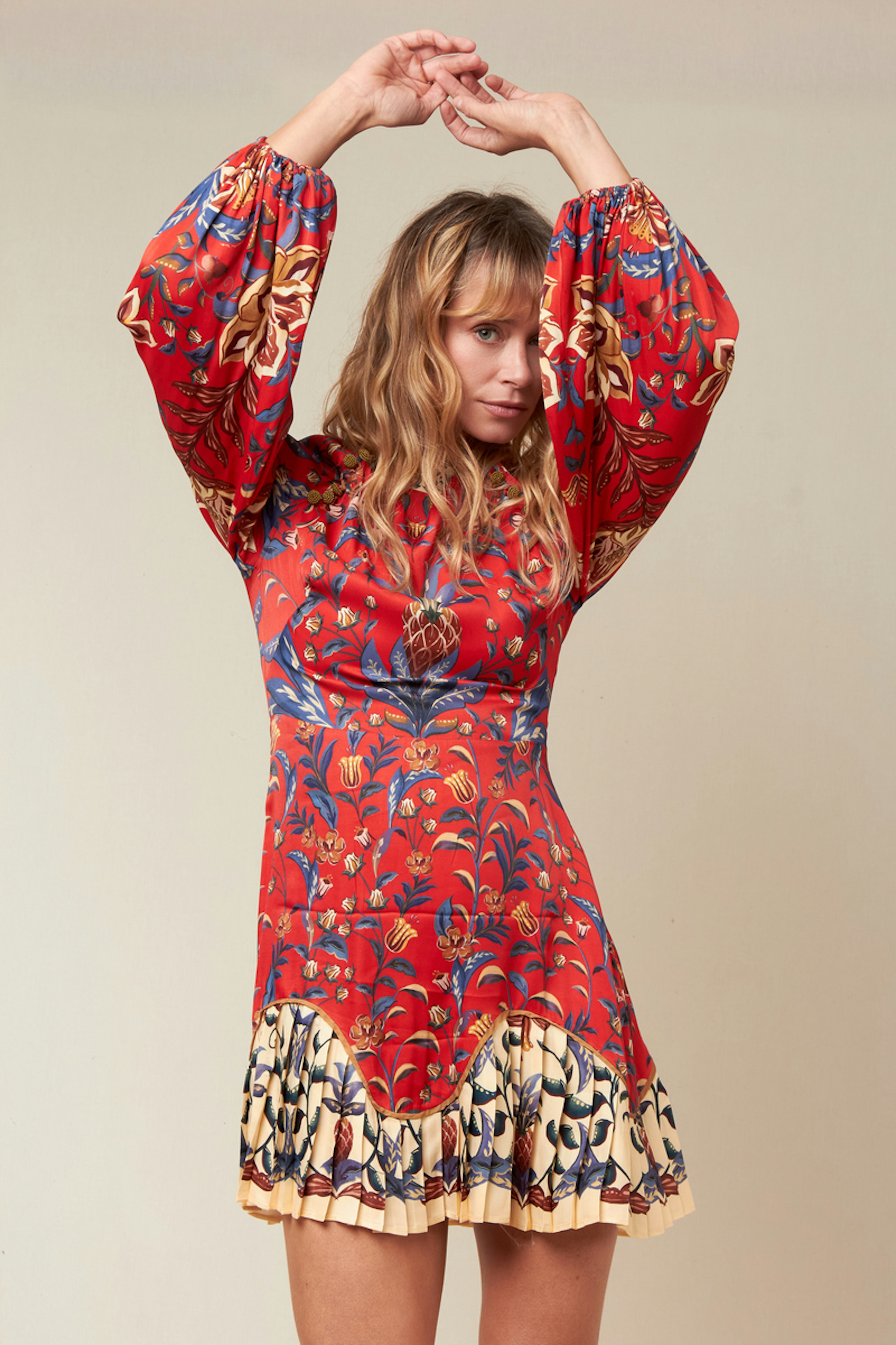 Im Winter verleihe diesem Kleid den letzten Schliff mit hohen Stiefeln und einem Camel-Mantel für einen schicken und mutigen Look. • Kurzes Kleid aus fließendem Stoff • Taillierte Passform • Puffärmel • Rundhalsausschnitt • Lebhaftes Blumenmuster