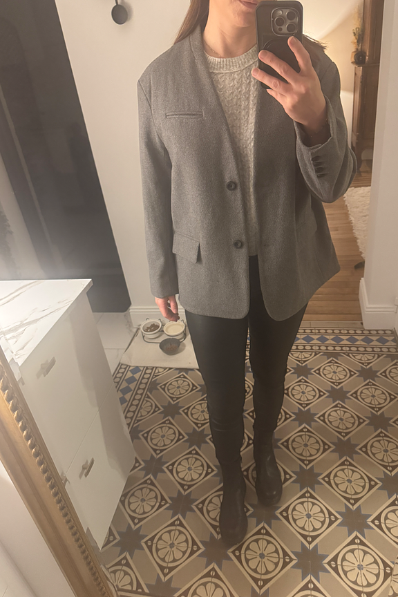 “The wool material makes this blazer a chic asset for cold days! Not too fitted at the waist, so I paired it with slim jeans. Nice item, heavy, warm and quite loose. Comfortable while still being acceptable in the office!”
