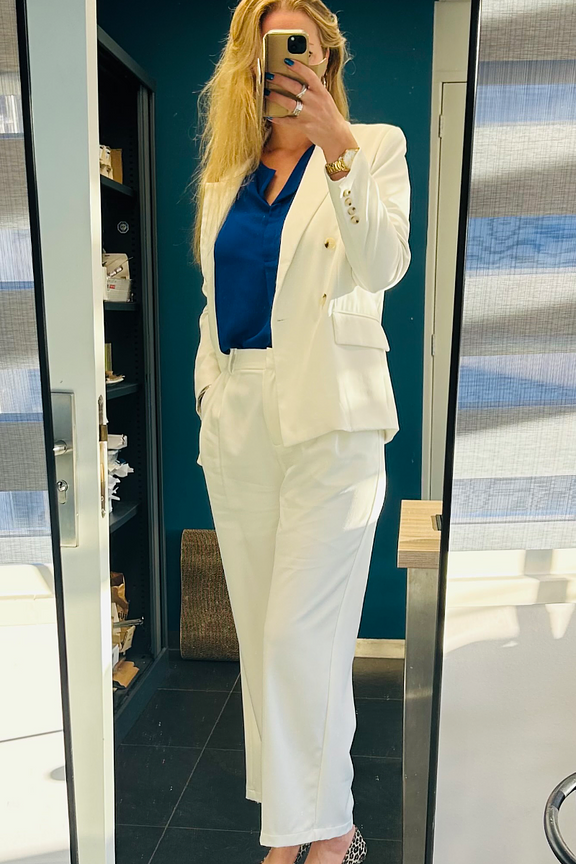 Emphasize your elegance by pairing this blazer with raw slim jeans and camel leather ankle boots. Ideal for summer evenings or at the office. • White blazer • Tailored cut • Double-breasted • Structured shoulders • Gold button detail