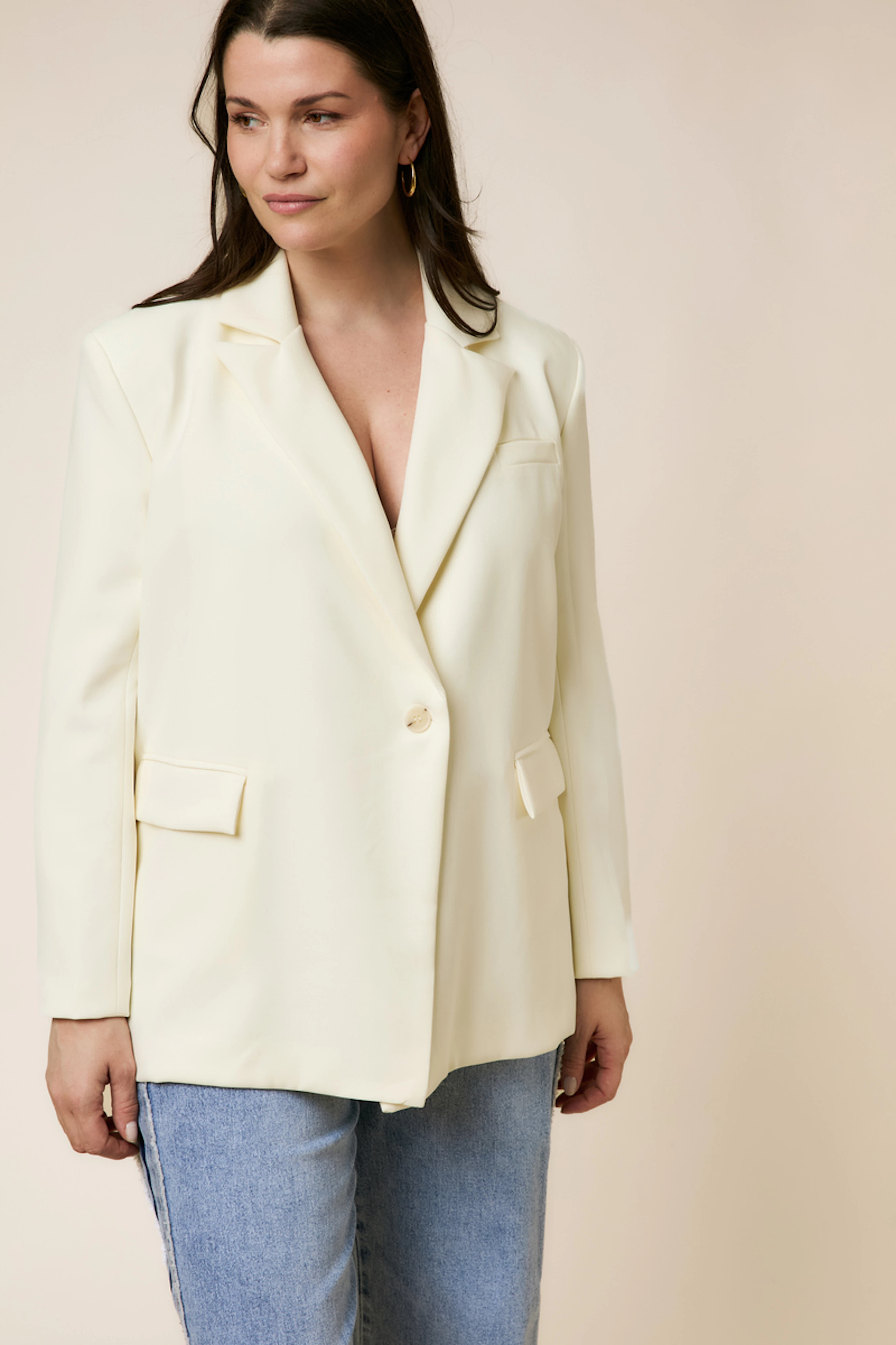 Pair this beige blazer with straight jeans and heeled sandals for a chic summer look. • Long-sleeved blazer • Oversized fit • Single-button closure • Flap pockets • Integrated shoulder pads