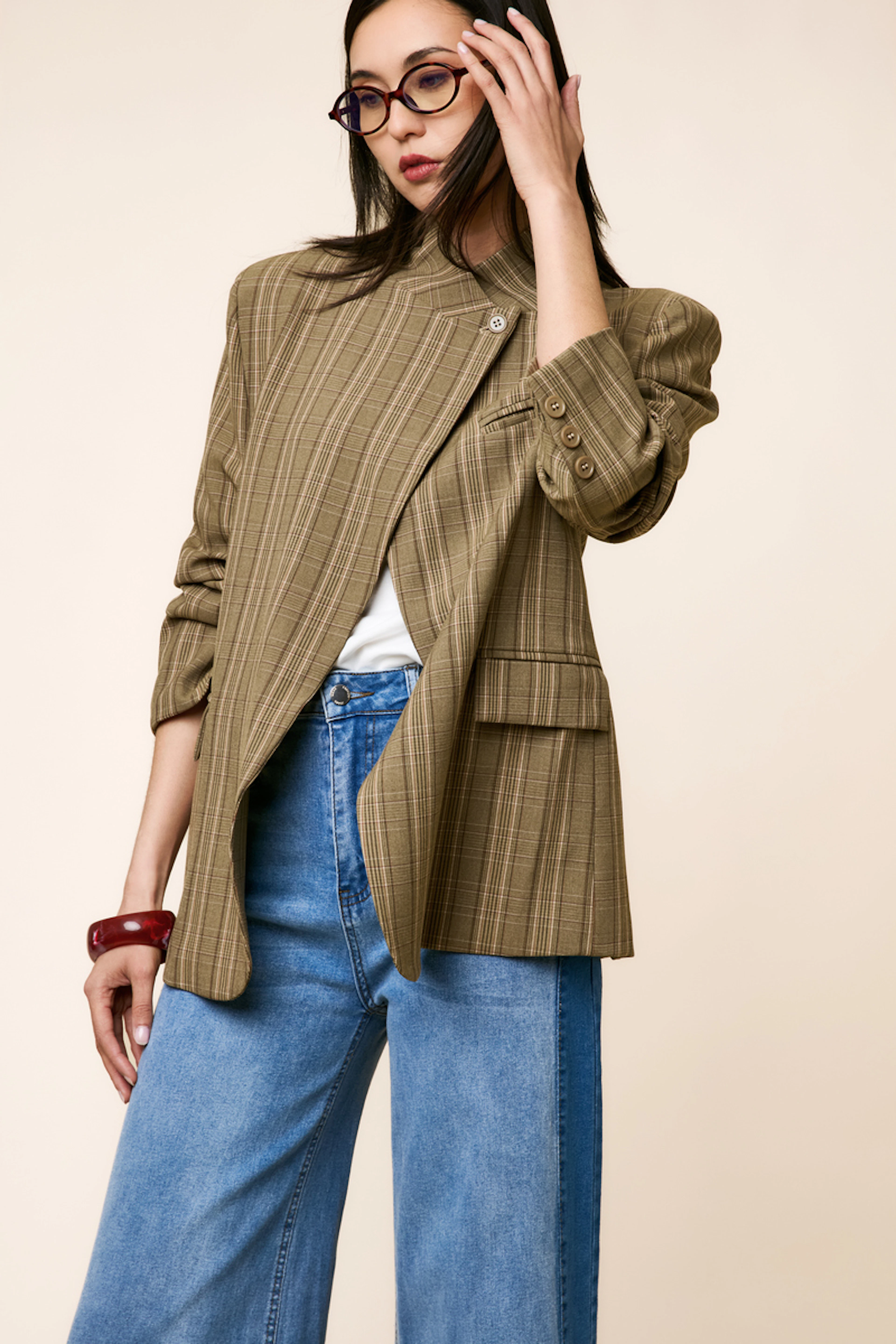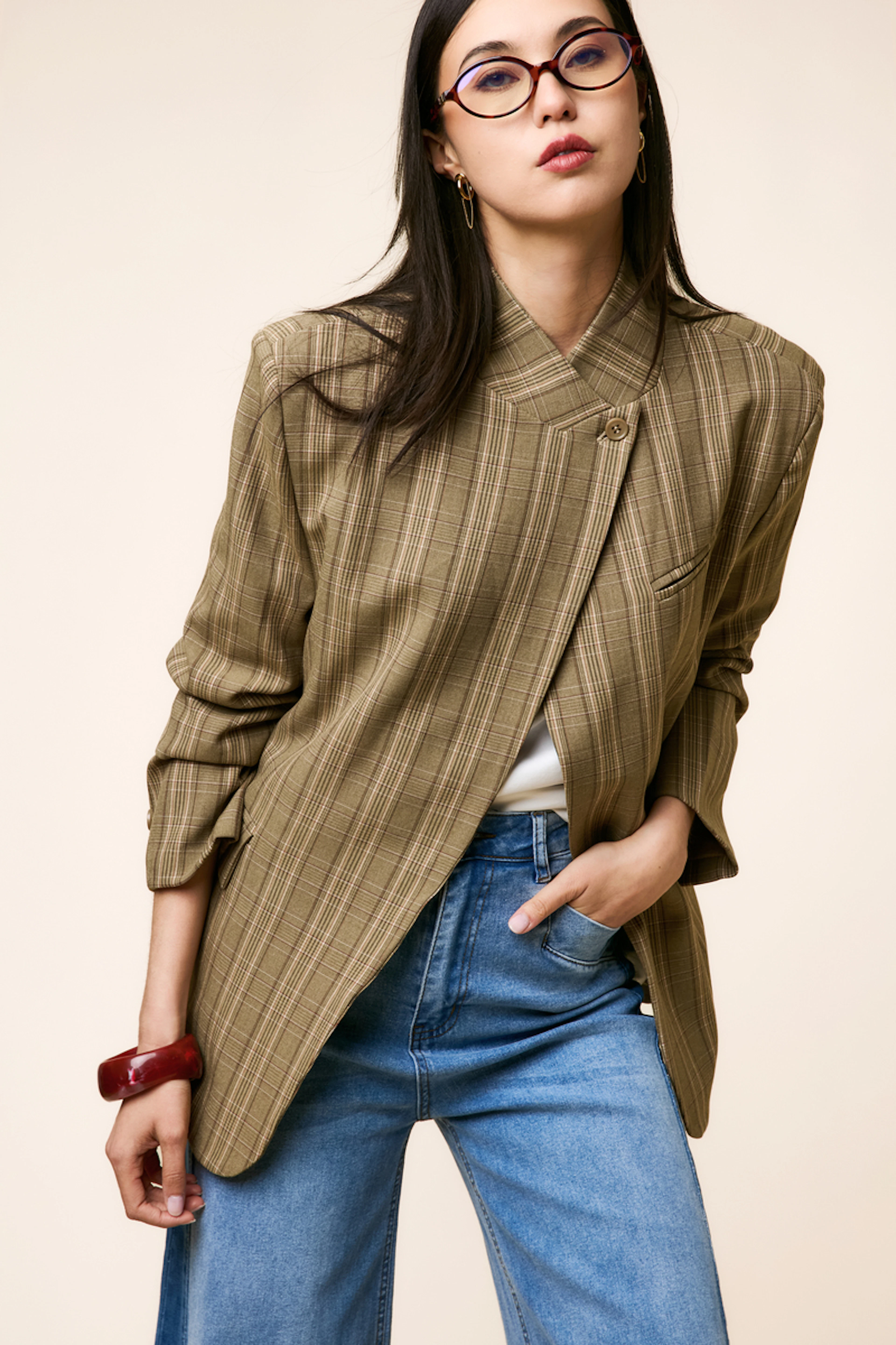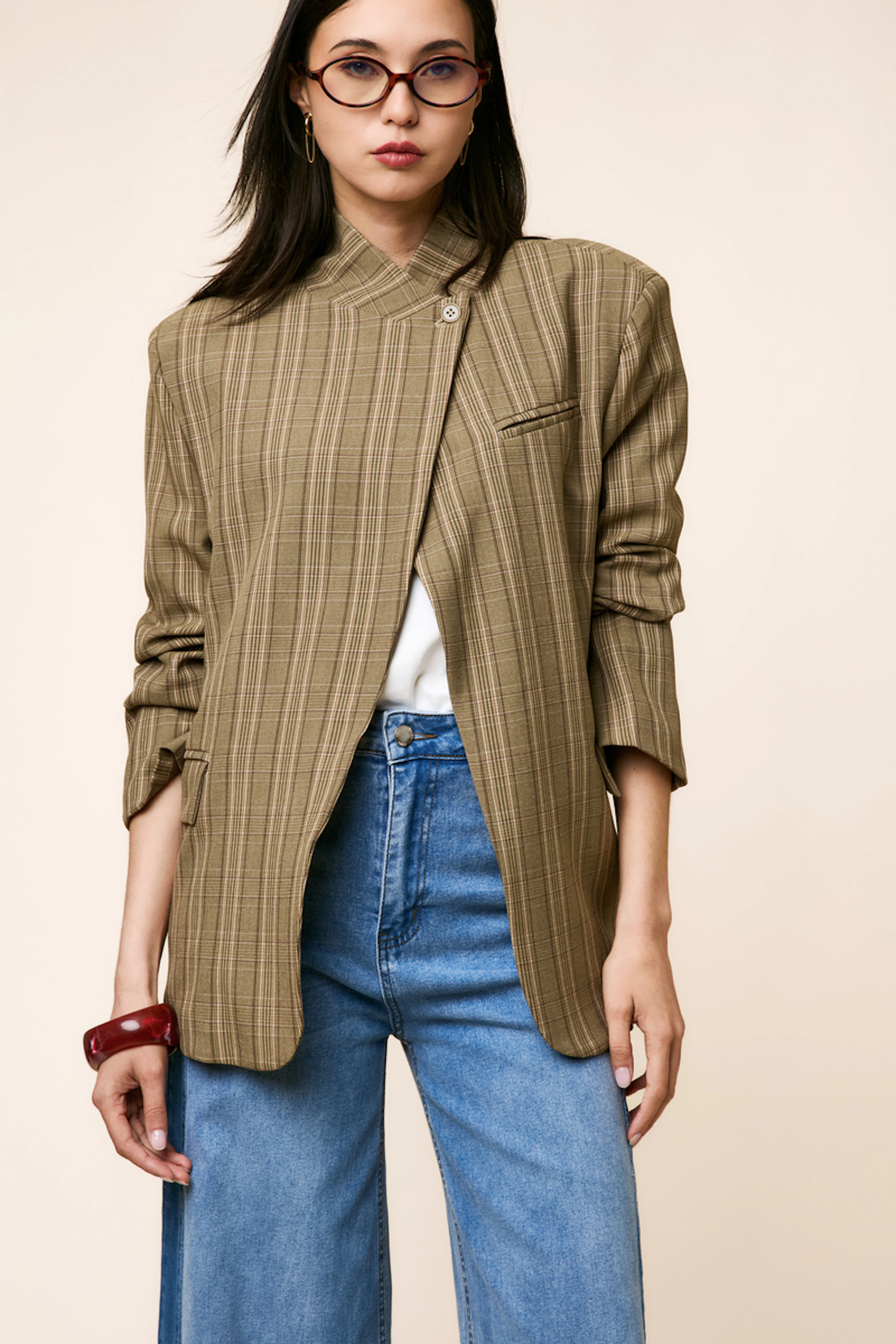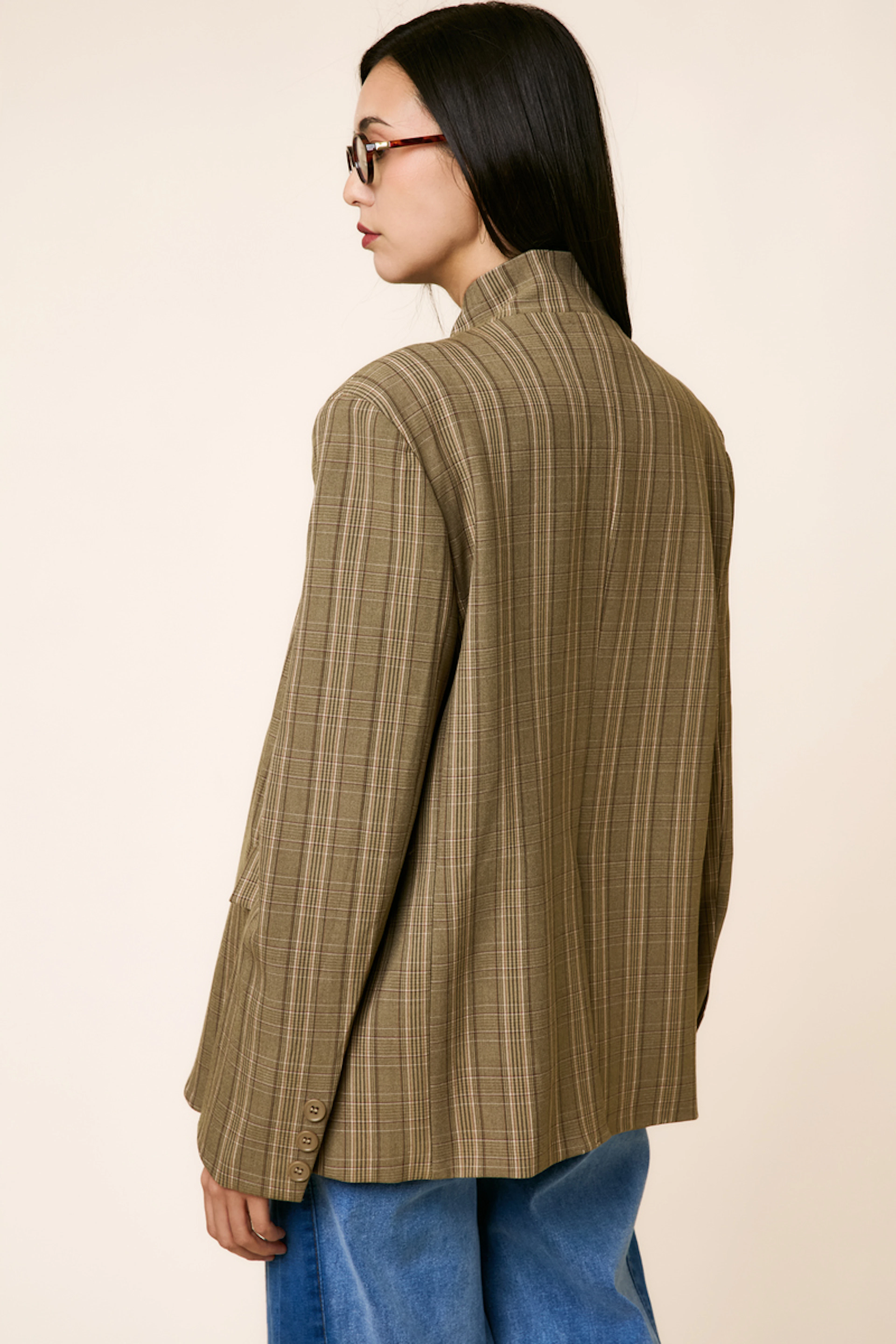 Wear this blazer with high-waisted jeans and ankle boots for a chic and cool look, perfect for any season. • Blazer • Straight cut • Mao collar • Long sleeves • Checkered pattern