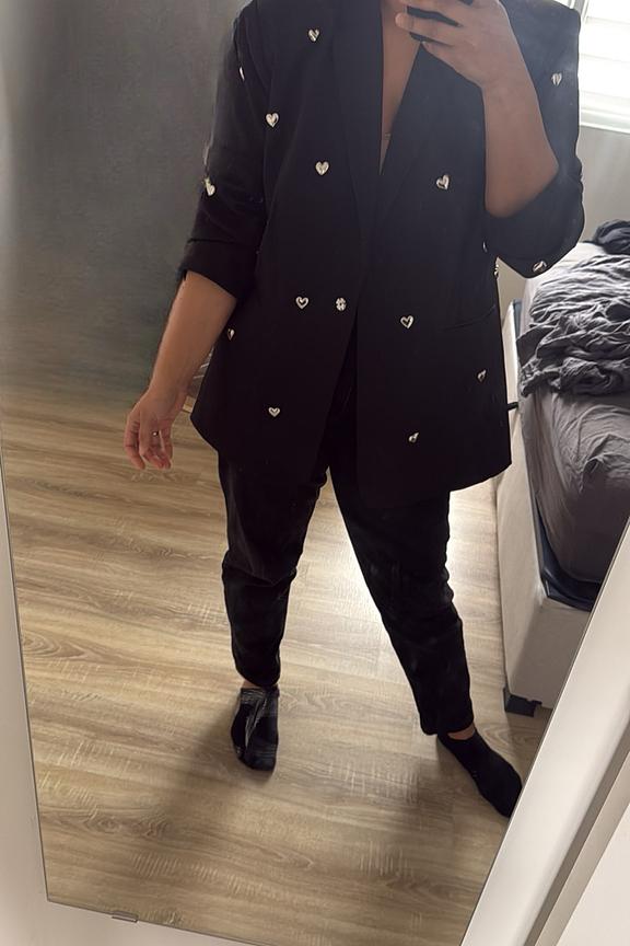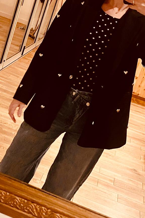 Pair this blazer with high-waisted pants and heels for a chic and modern look. Perfect for elegant evenings. • Printed blazer • Oversize cut • Button closure • Structured shoulders • Heart-shaped metal details