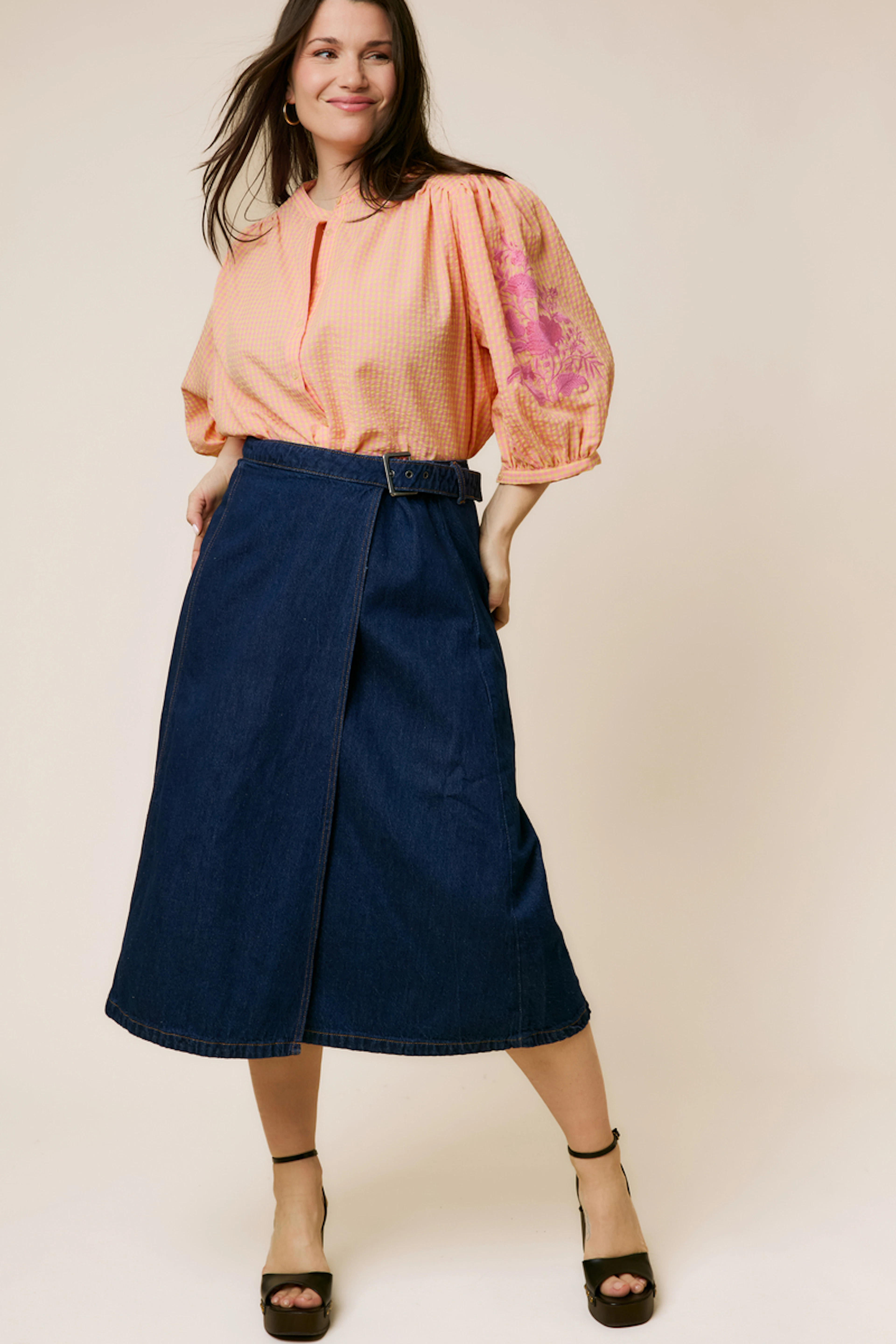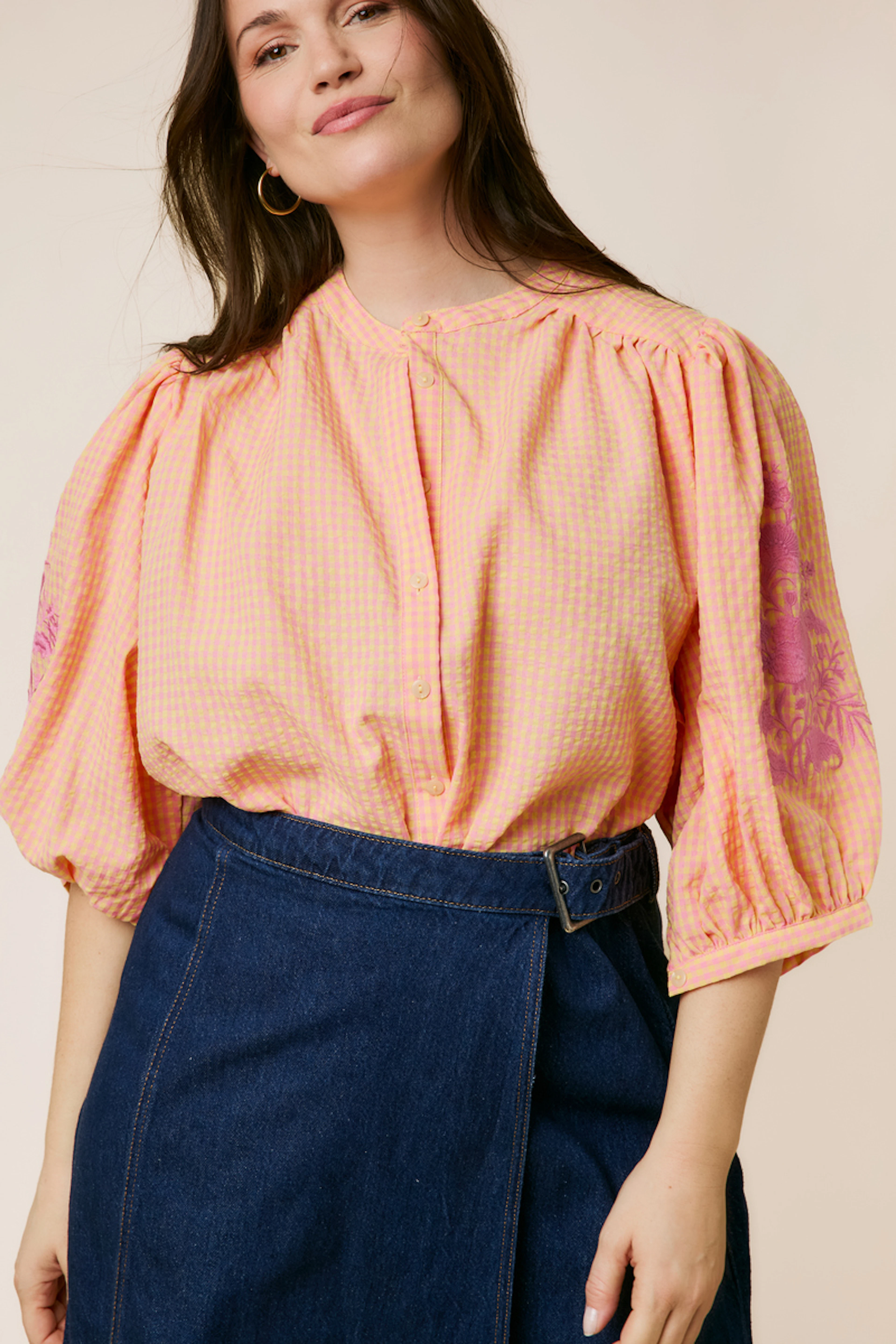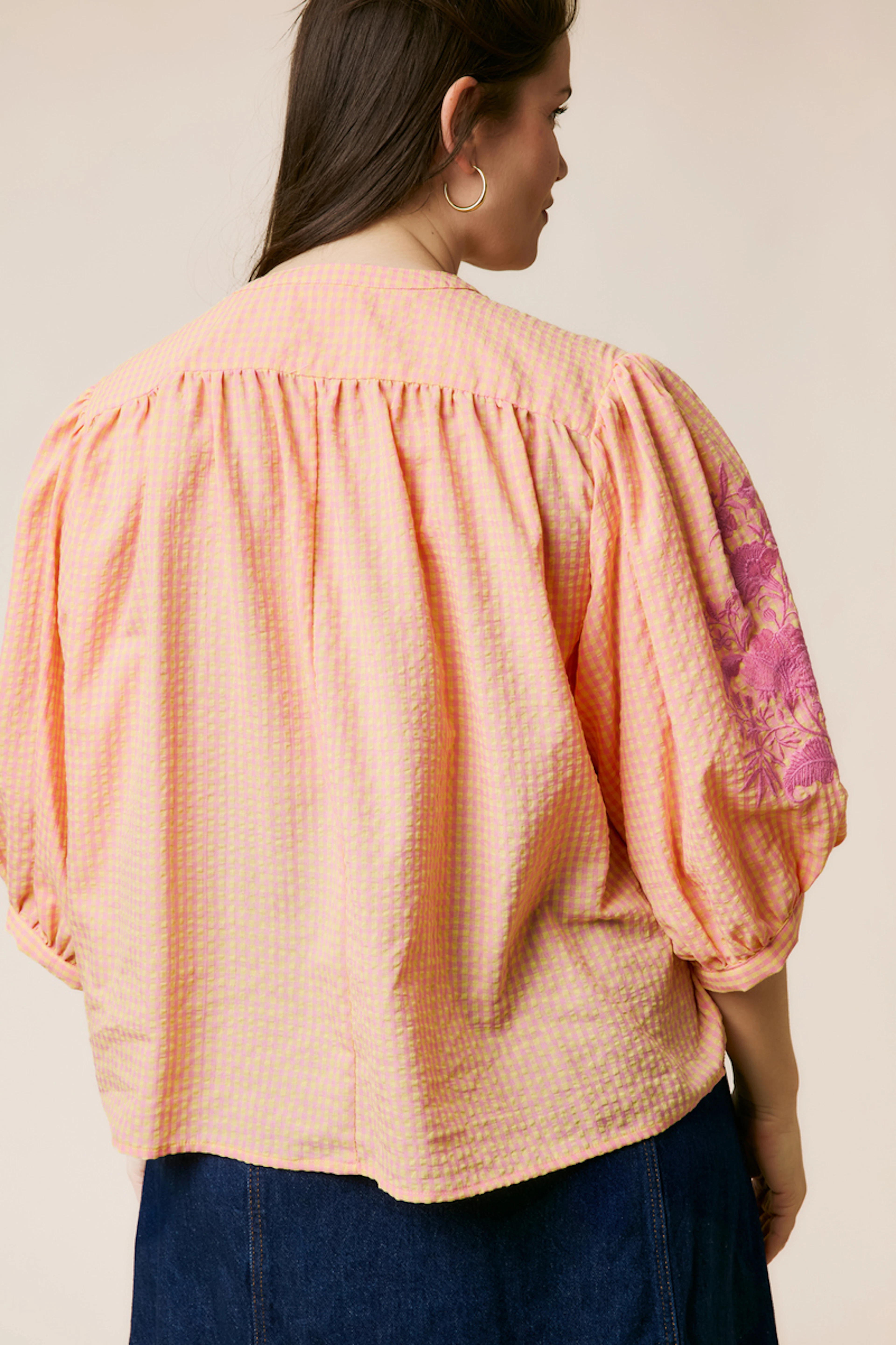 Pair this blouse with a denim skirt and sandals for a relaxed yet chic summer look. • Puff sleeve blouse • Loose and flowy fit • Delicate round neckline • Yellow gingham print • Floral embroidery on sleeve