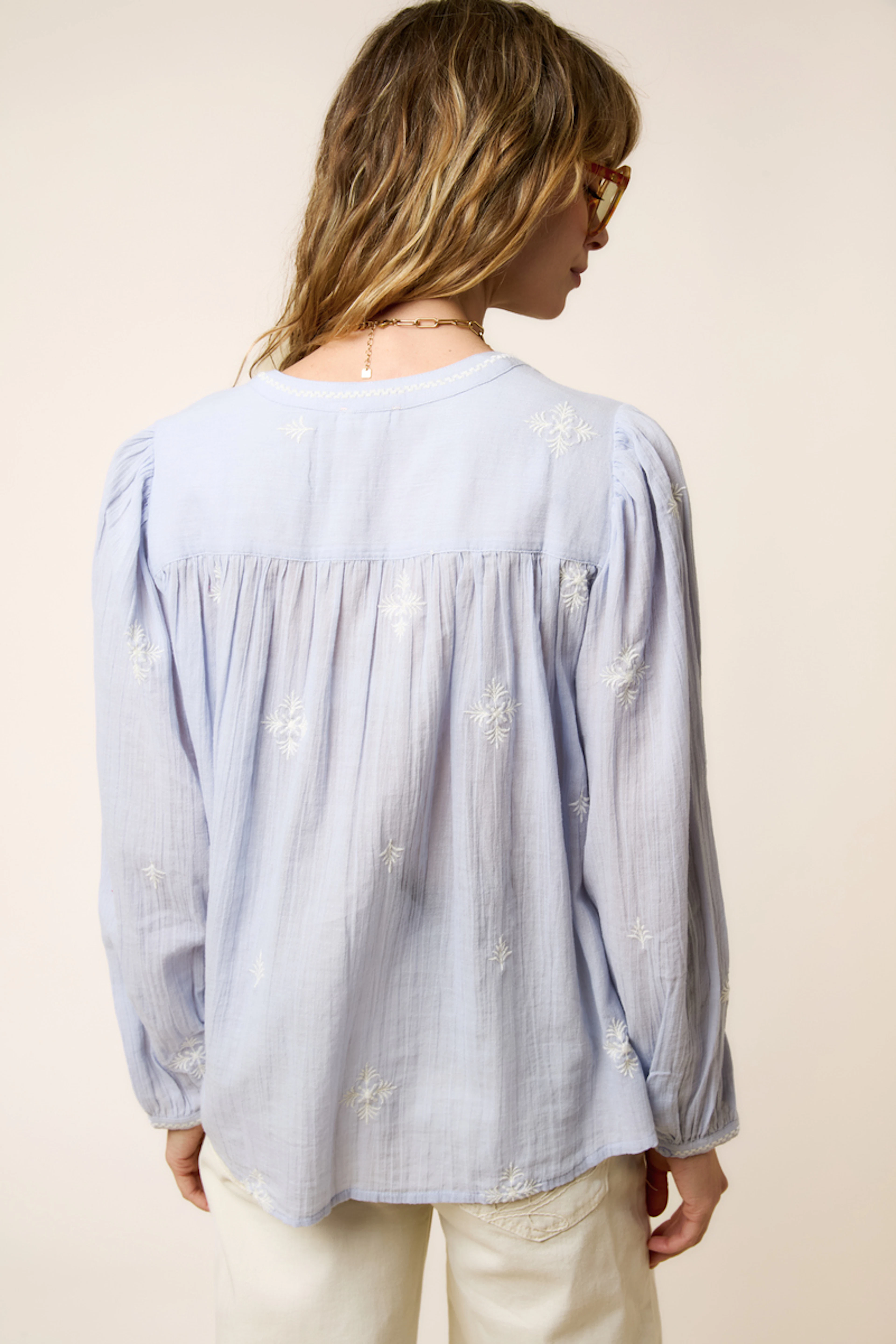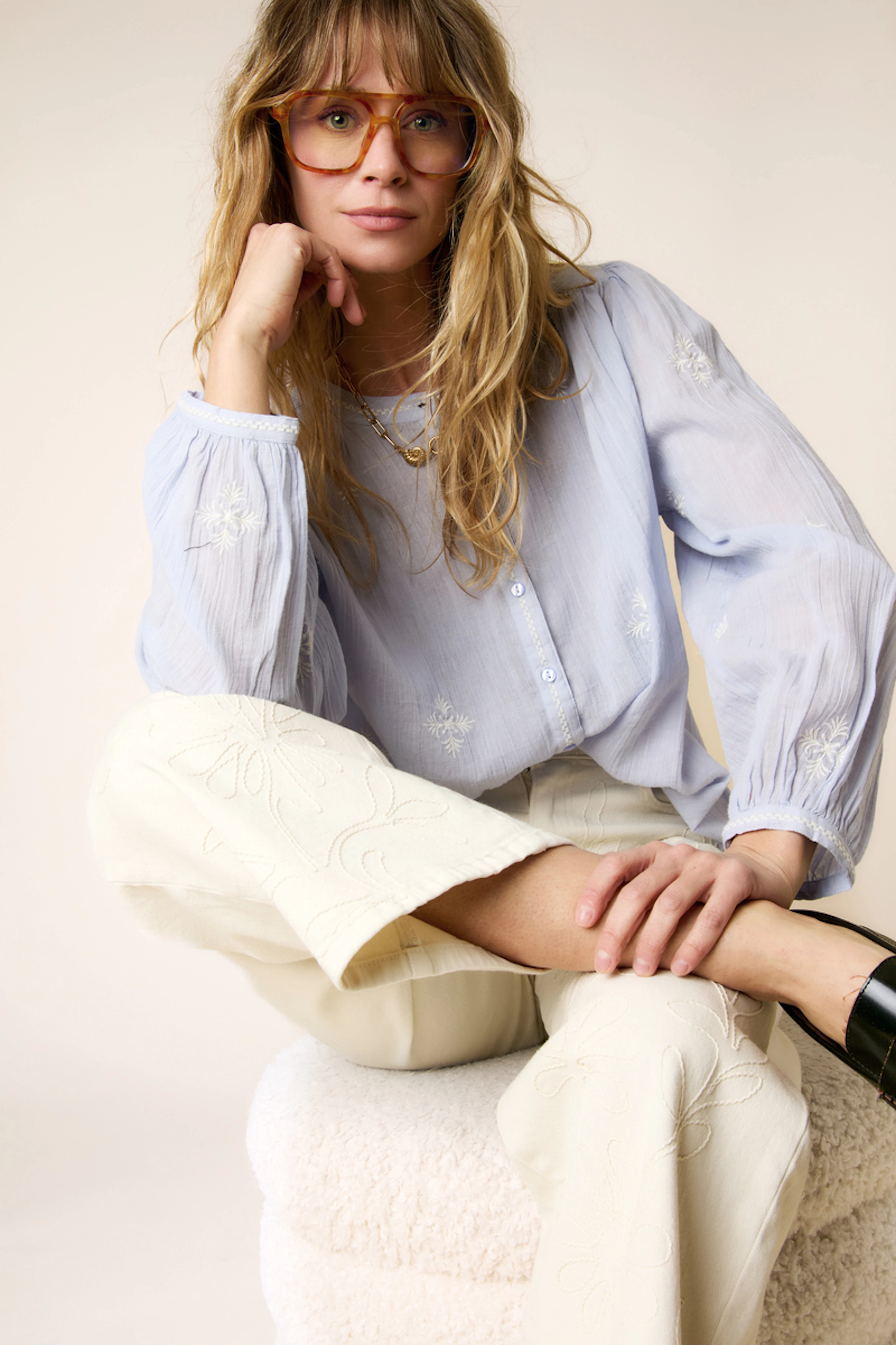 Style this blouse with white jeans and sandals for a refreshing summer look that's effortlessly chic.\n\n• Cotton blouse\n• Puff long sleeves\n• Buttoned collar\n• Delicate pleats on the front\n• Floral print pattern