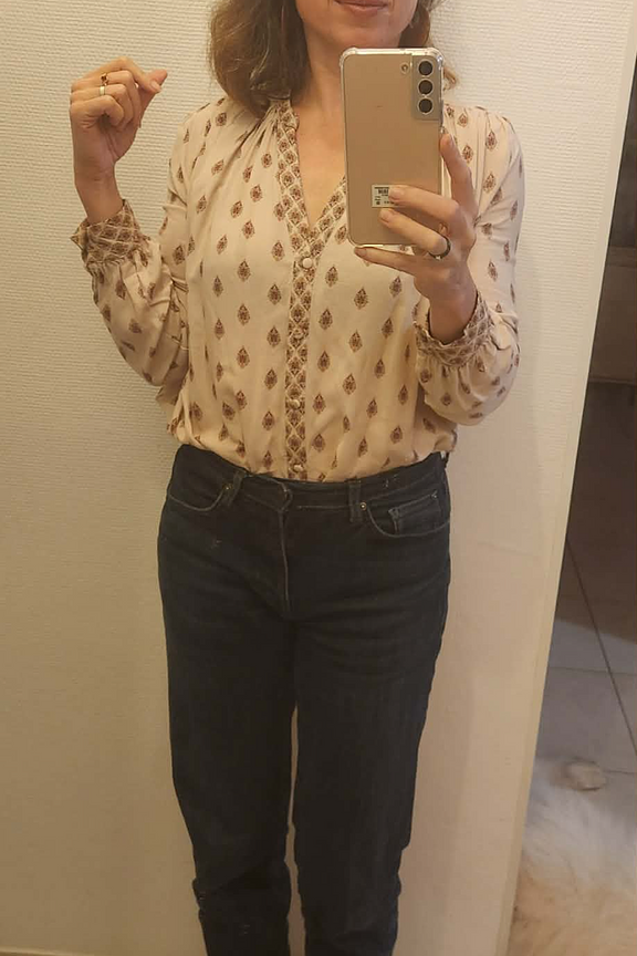 Add a bohemian touch to your outfit with this printed blouse. Pair it with slim jeans and ankle boots for a chic and relaxed look, perfect for all seasons. • Loose blouse • Puffed long sleeves • V-neck • Printed pattern • Embellished hem
