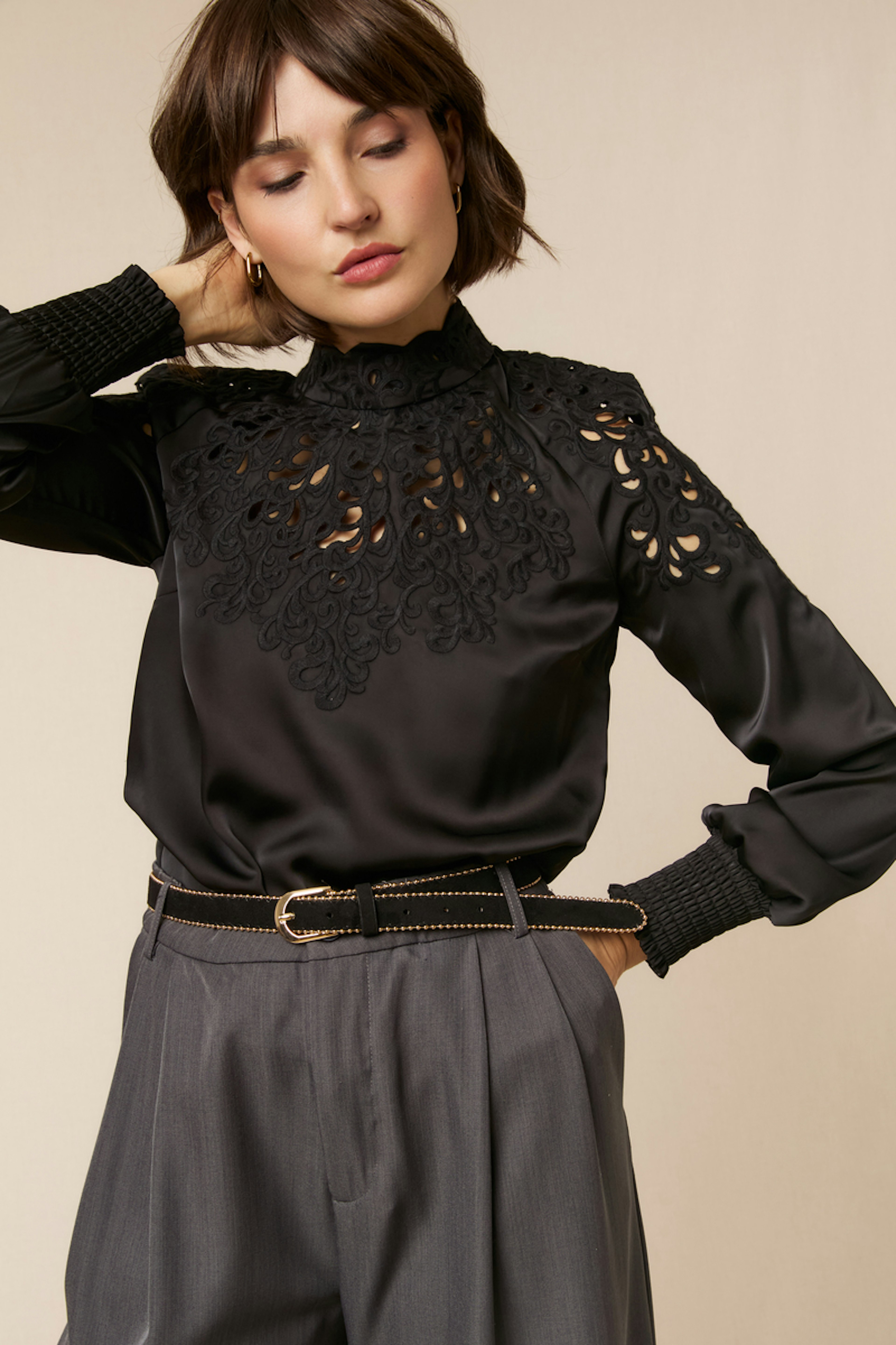 Add a touch of elegance to your outfit by pairing this blouse with high-waisted jeans and chic ankle boots. Perfect for any season. • Flowing blouse • High collar with embroidery • Puff long sleeves • Smocked cuffs • Refined openwork cutouts