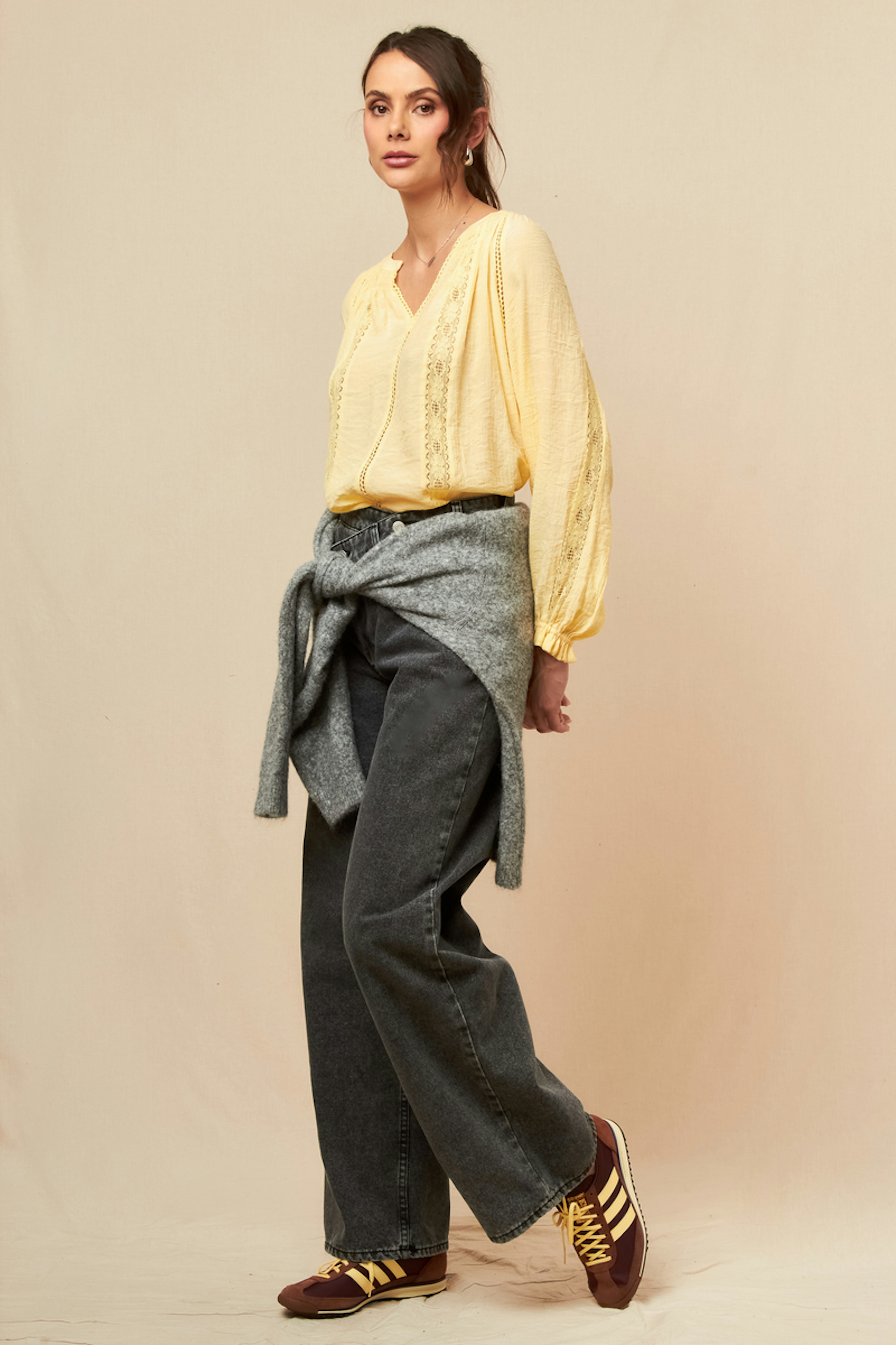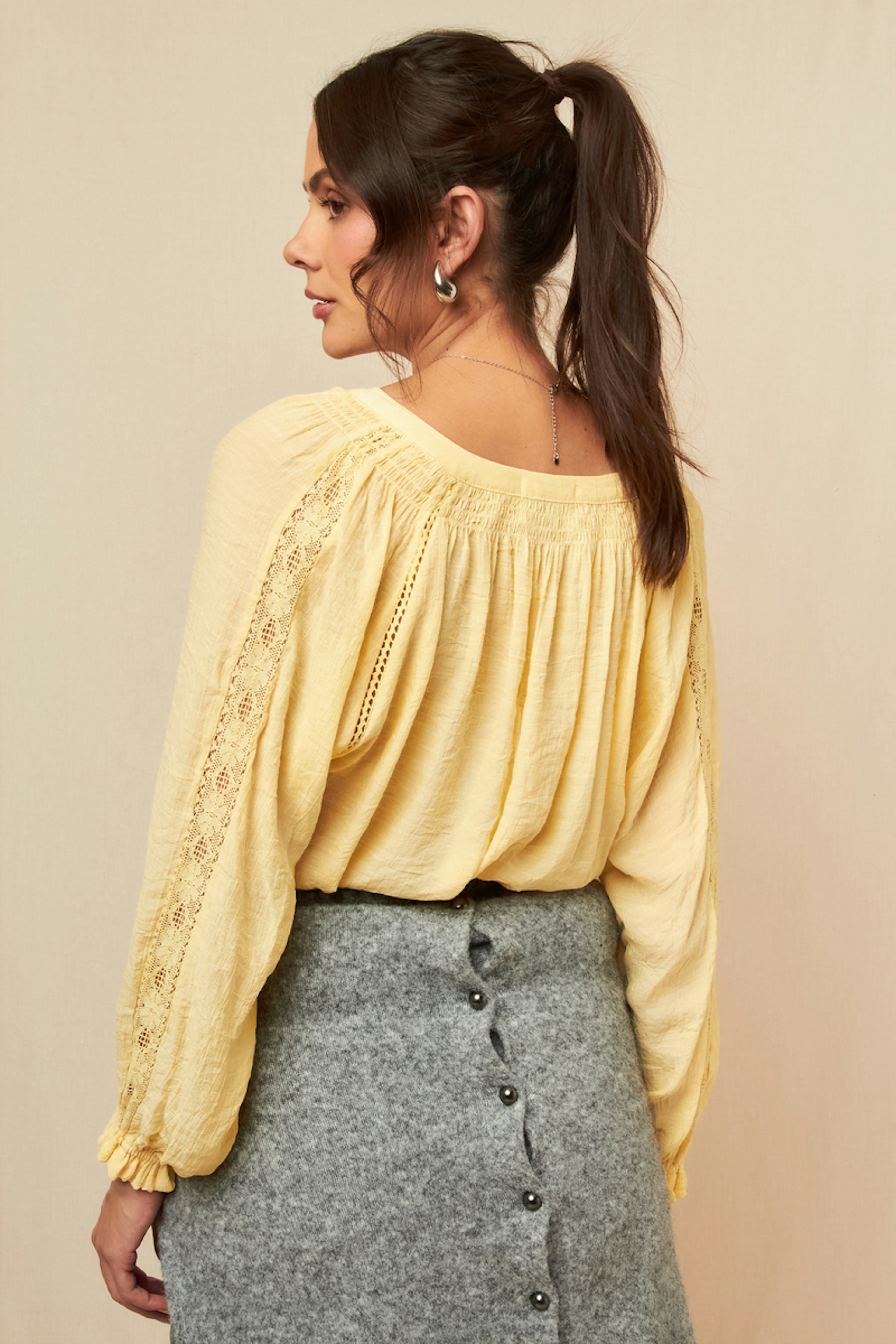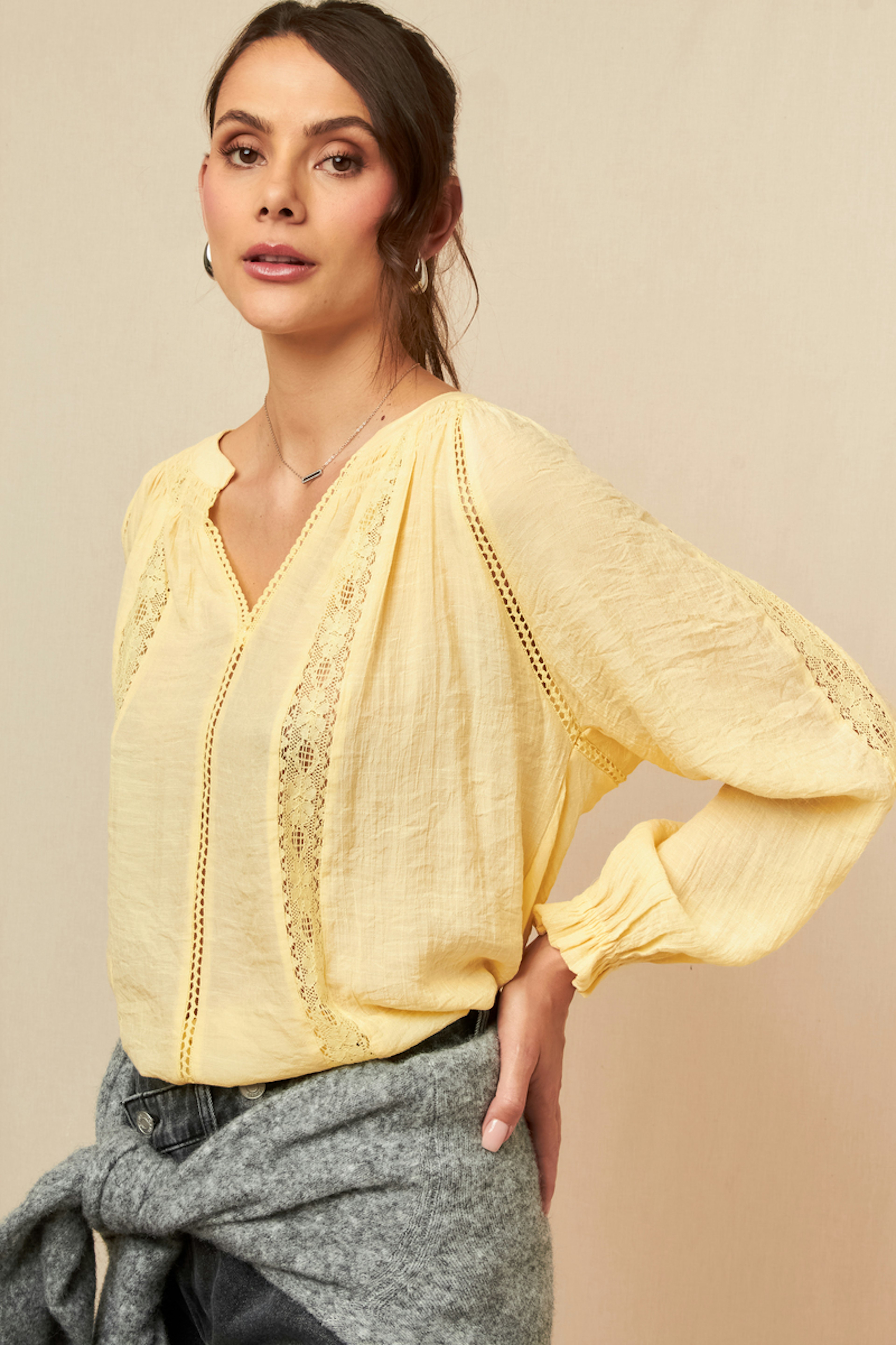 Wear this blouse with flare jeans and ankle boots for a chic yet laid-back look. Perfect for any season. • Fluid blouse • Puff long sleeves • V-neckline • Openwork lace details • Sunny yellow