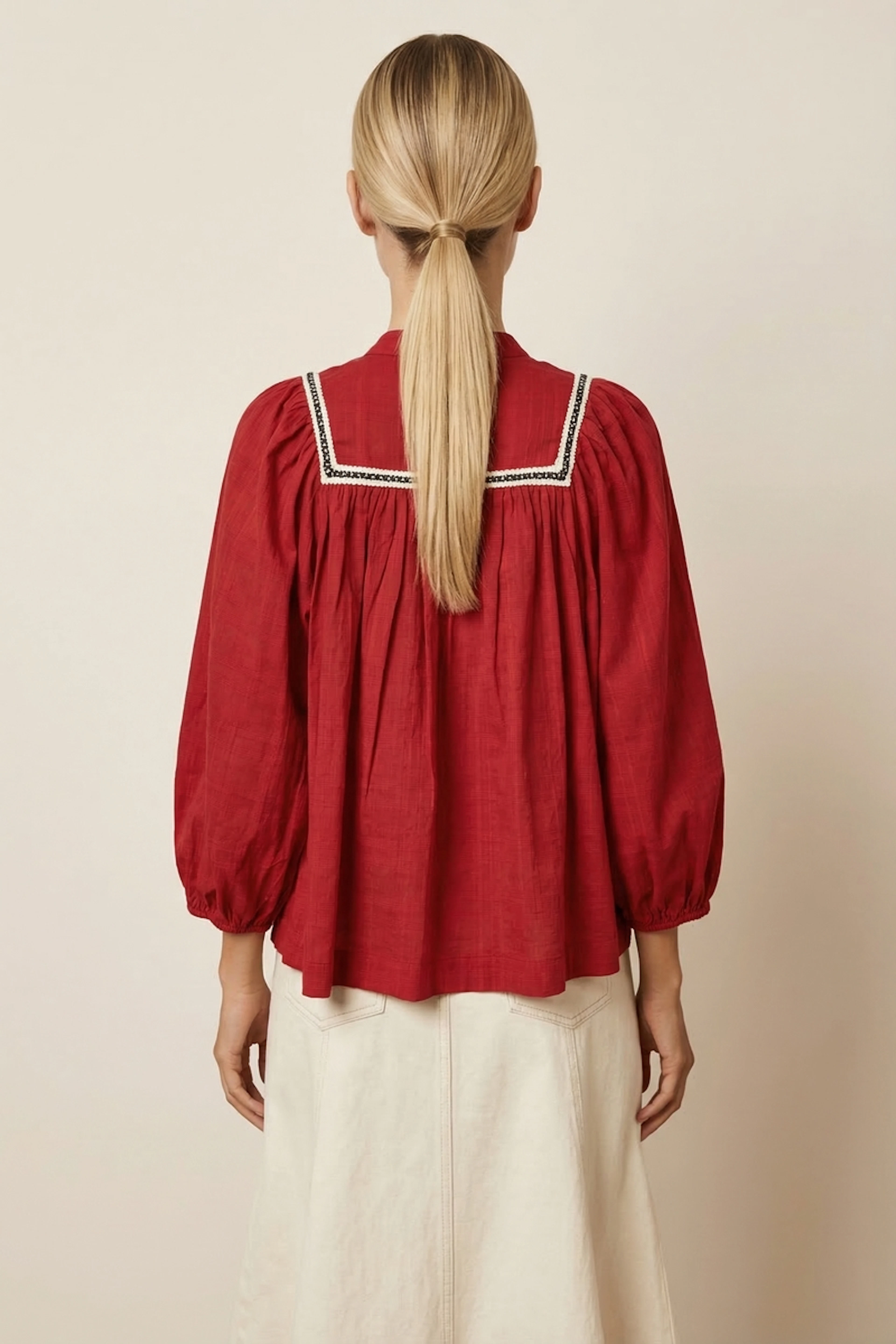 Wear this red blouse with high-waisted jeans and ankle boots for a chic and casual winter look. • Cotton blouse • Loose fit • Puff sleeves • V-neck • Embroidered details