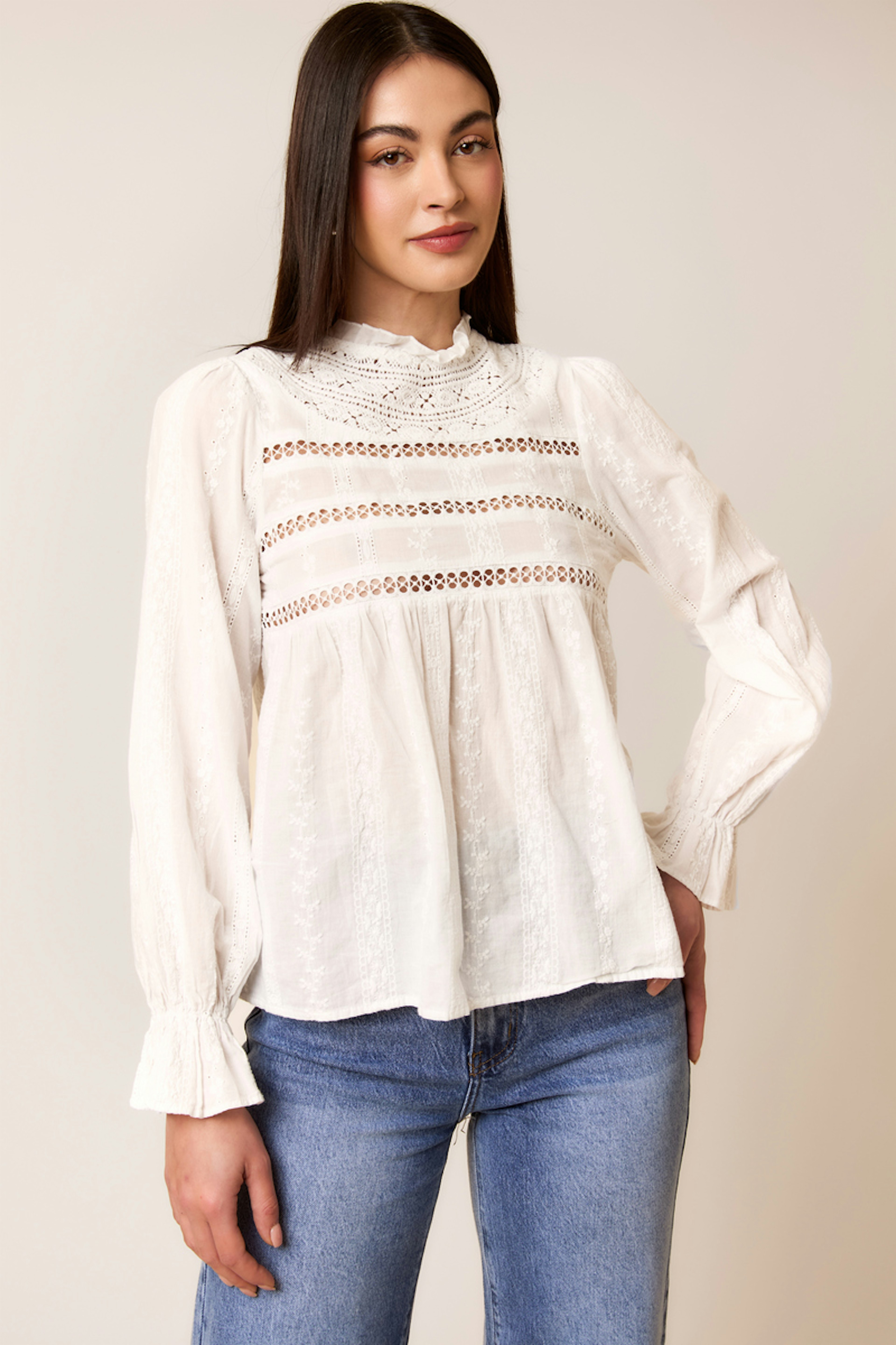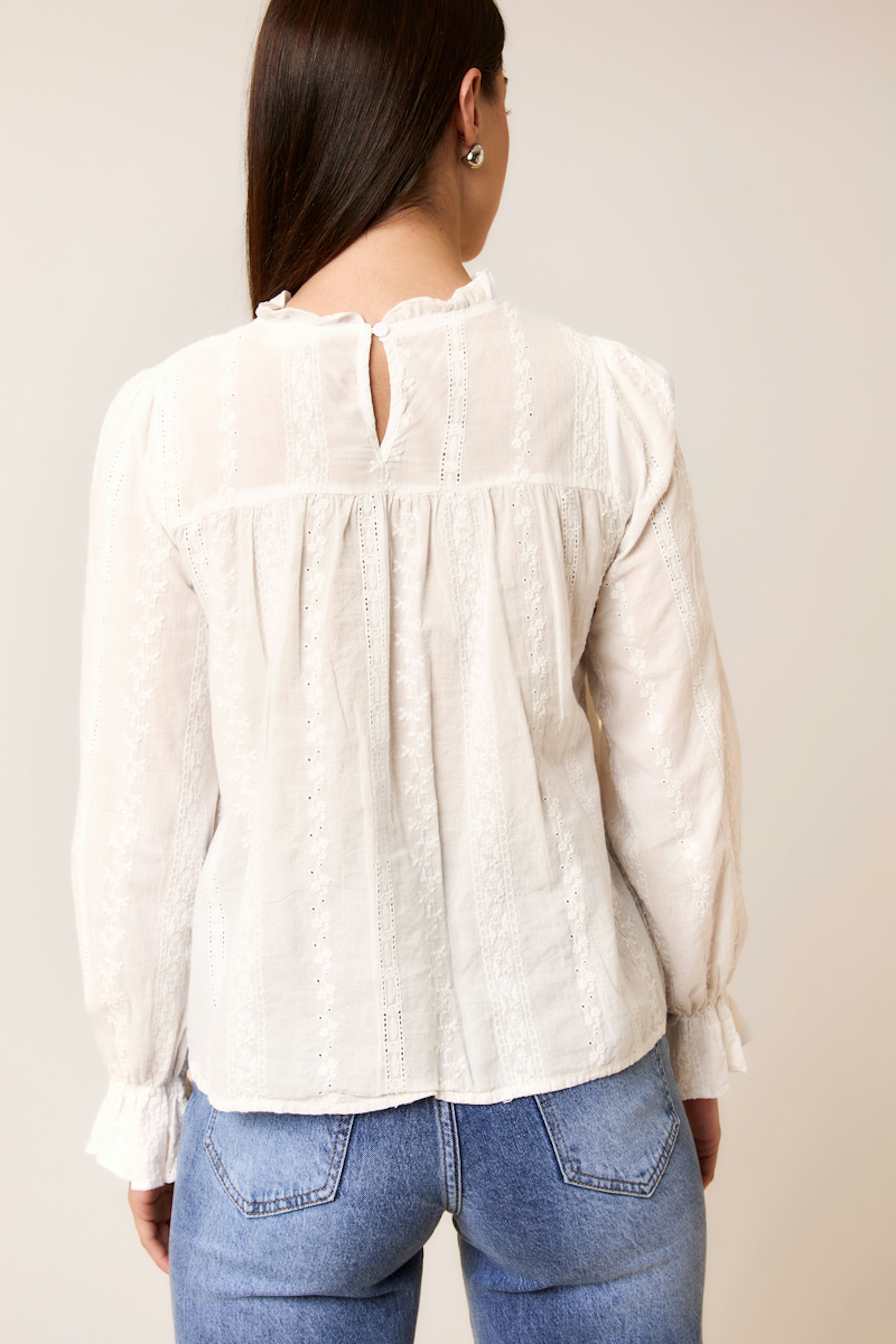 Pair this romantic blouse with black fitted pants and ankle boots for a chic winter vibe. • Embroidered cotton blouse • Loose, flowy fit • Puff long sleeves • Delicate high collar • Elegant cut-out details