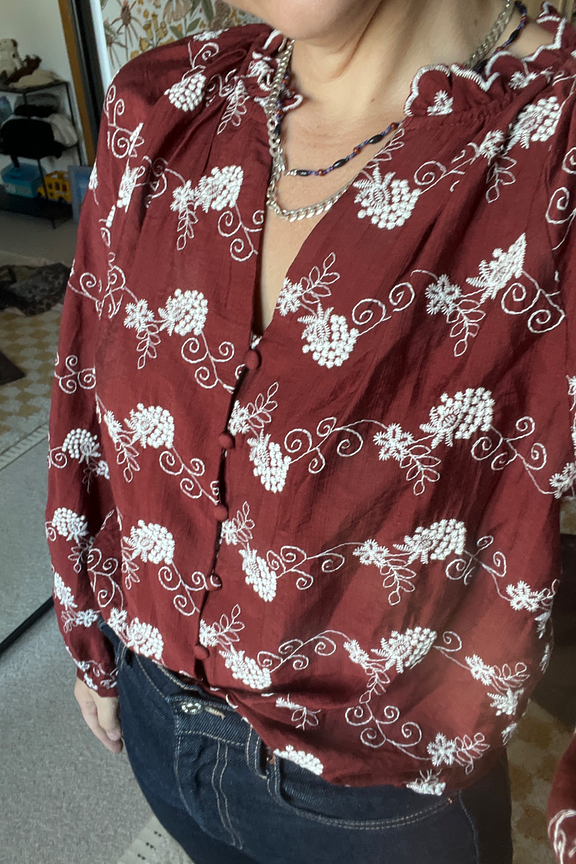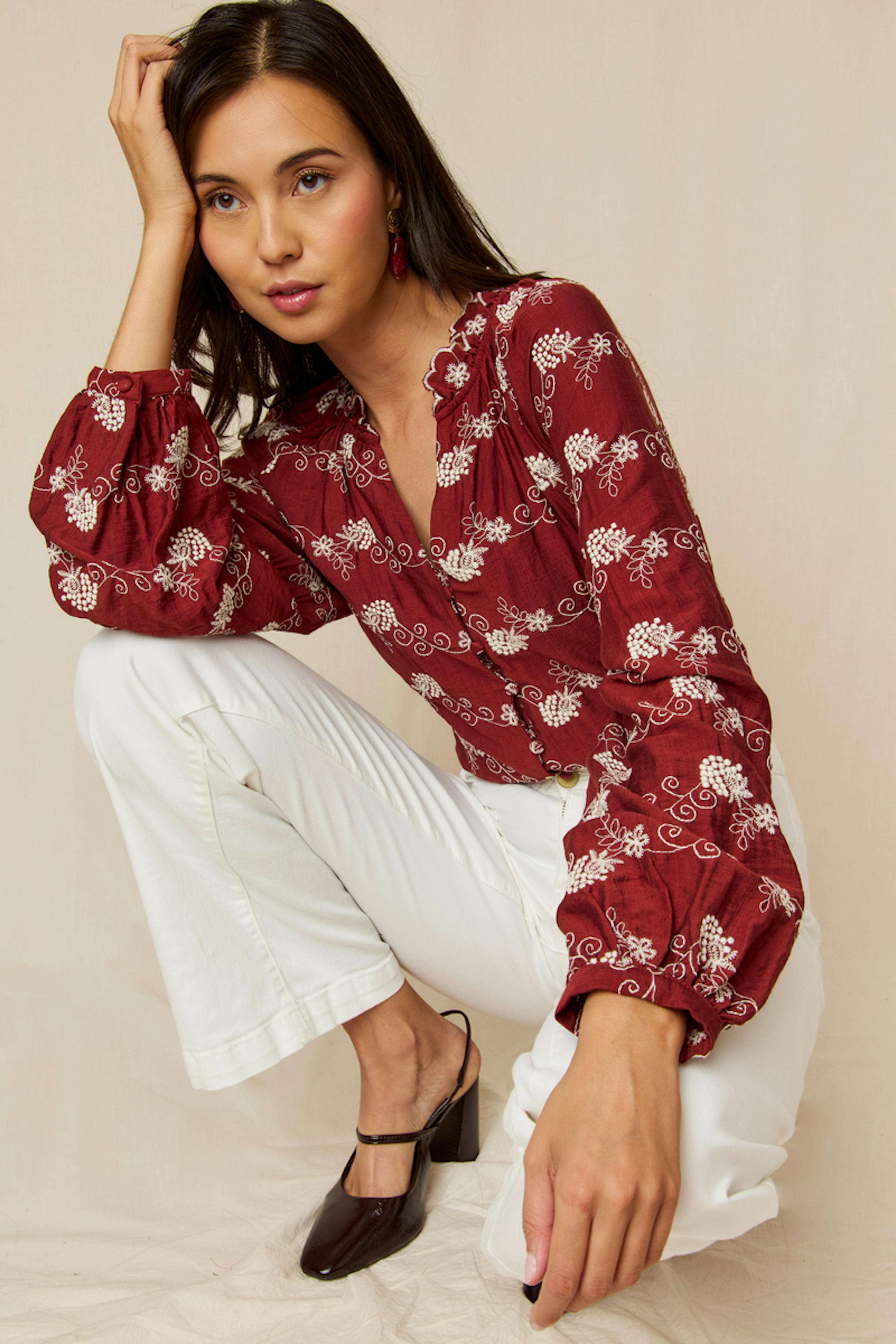 Combine this red printed blouse with white jeans for a fresh and modern look. Add subtle heels for a touch of understated elegance. • Printed blouse • Long sleeves • V neck • Elasticized at the waist • Embroidered details