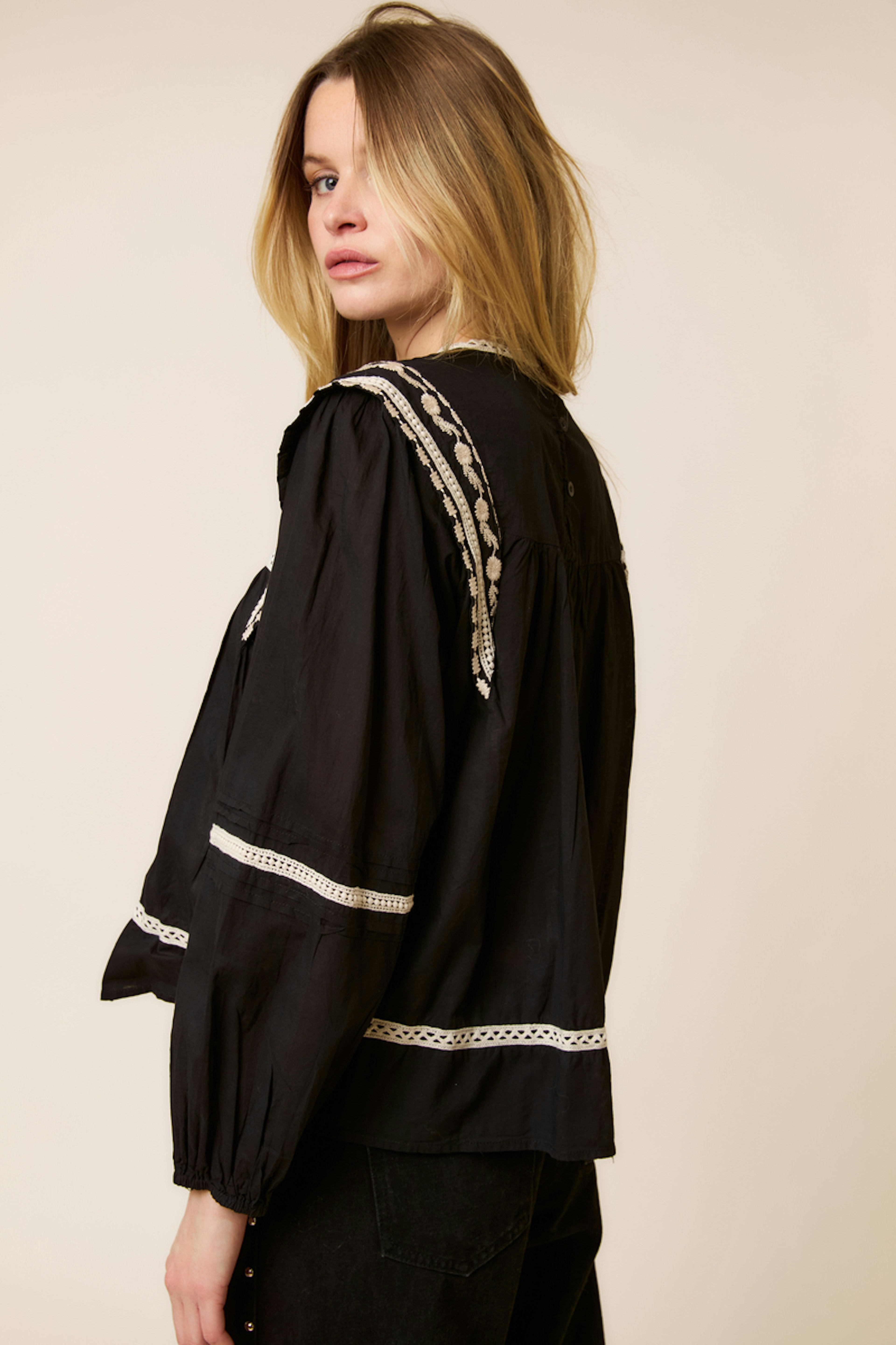 Pair this chic blouse with white pants and ankle boots for a stylish winter look. • 100% cotton blouse • Voluminous long sleeves • Elegant lace details • Embroidered accents • Loose and flowy fit