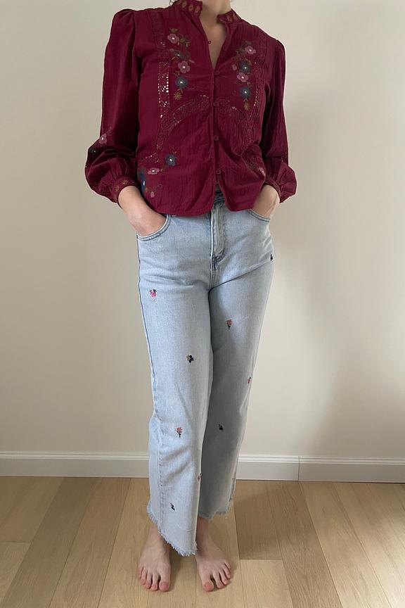 Pair this delicate blouse with high-waisted jeans and ankle boots for a chic and modern look in any season. • Cotton blouse • Mao collar • Floral embroidery • Lace details • Puff long sleeves